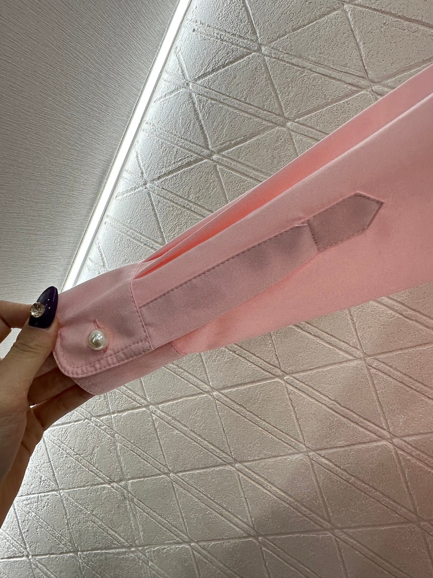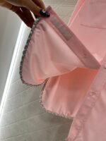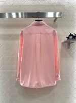 The twill all cotton material has a comfortable and delicate texture, full of breathability, and a loose collared shirt with a slim fit. The overall plain color is versatile and durable, with symmetrical pockets on the chest. The flower shaped letter logo is embroidered on one side of the lower part, with a hidden fabric label on the open collar. The pearl buttons on the cuffs can be folded, and the inner chain of the hem highlights the style of Xiang Jia. It is fashionable and fashionable, and easy to wear on the upper body, giving it a sense of high-end fashion