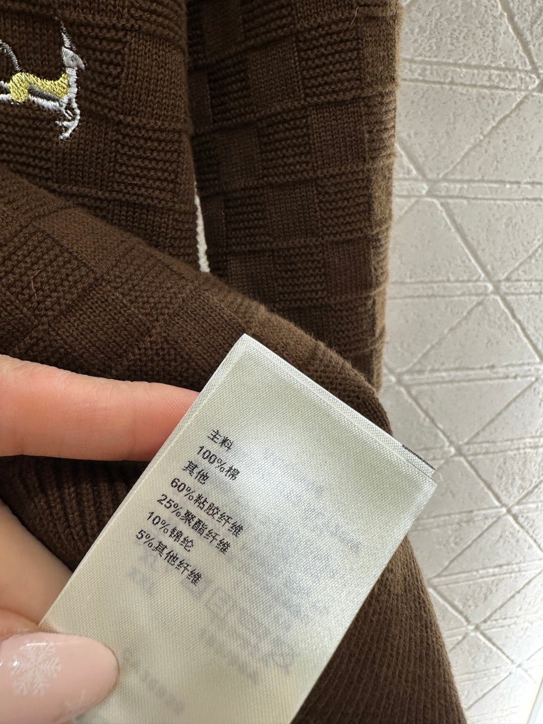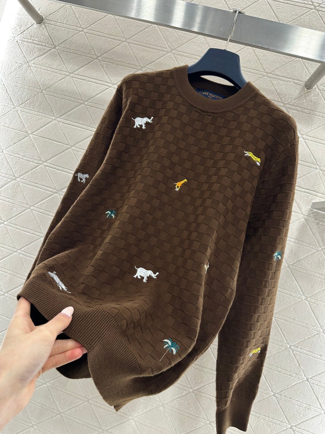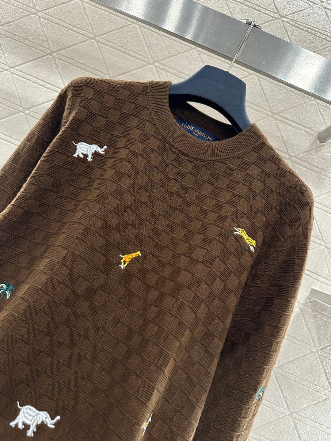 Crafted from 100% cotton yarn, this sweater boasts a delicate texture and comfortable wear. The round neck knit pullover features a subtle deep brown checkered pattern that subtly showcases the brand’s elements. Scattered animal and palm tree embroidery adds a touch of whimsy and tropical flair, with exquisite and delicate craftsmanship, revealing a thoughtful design in every detail. The soft, warm knit fabric is gentle on the skin, and the loose round neck flatters all body types. Wear it alone for a relaxed, retro vibe, or layer it with a shirt or vest for a sophisticated, multi-layered look – a true style statement piece.