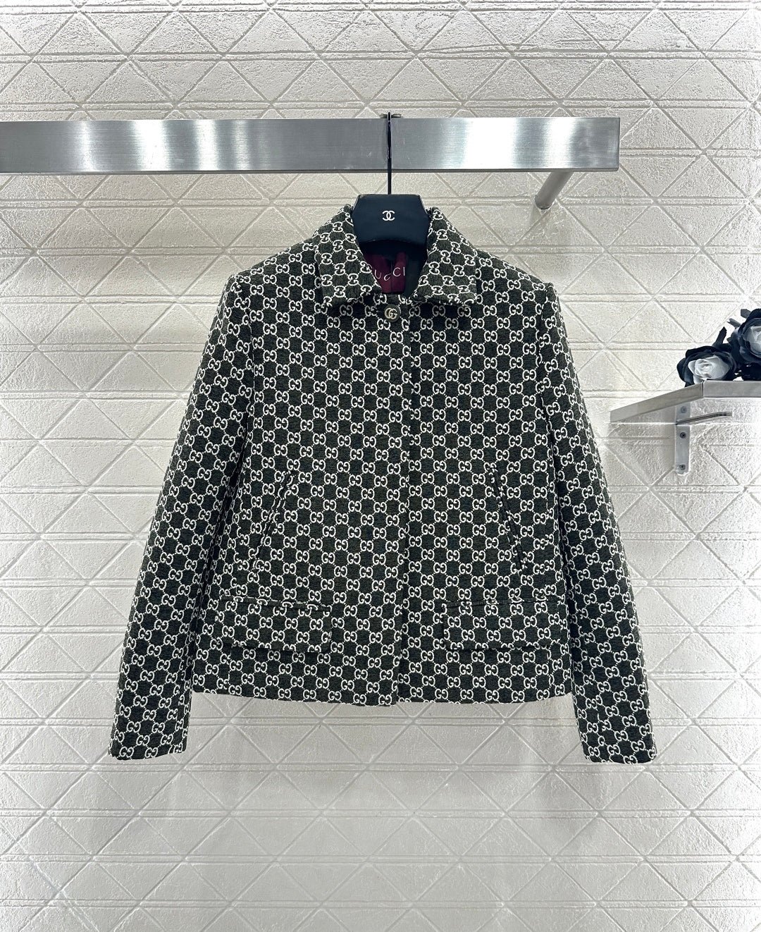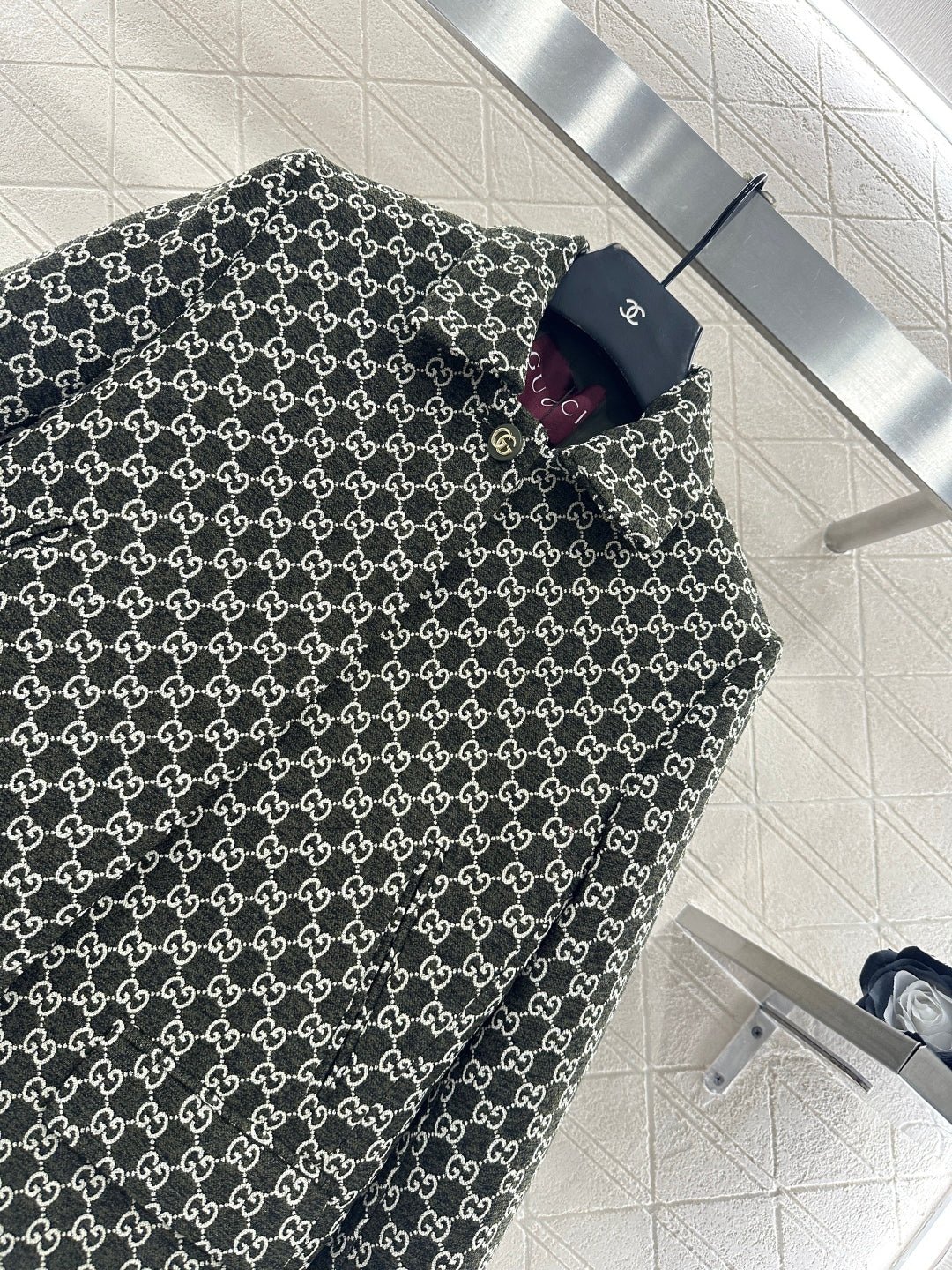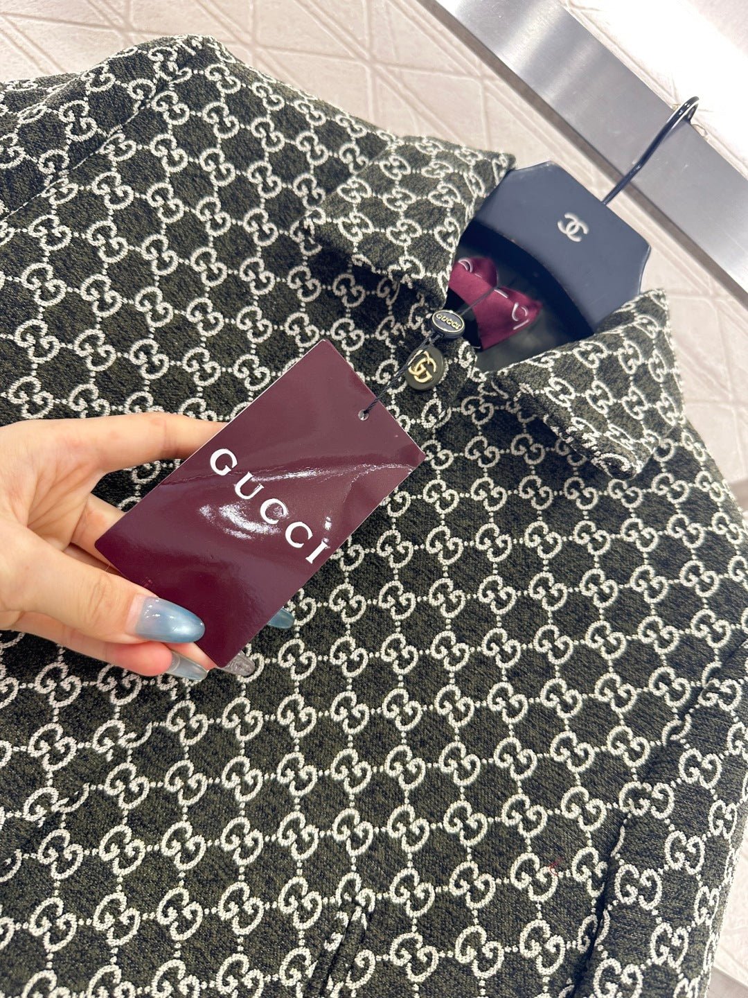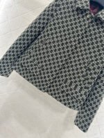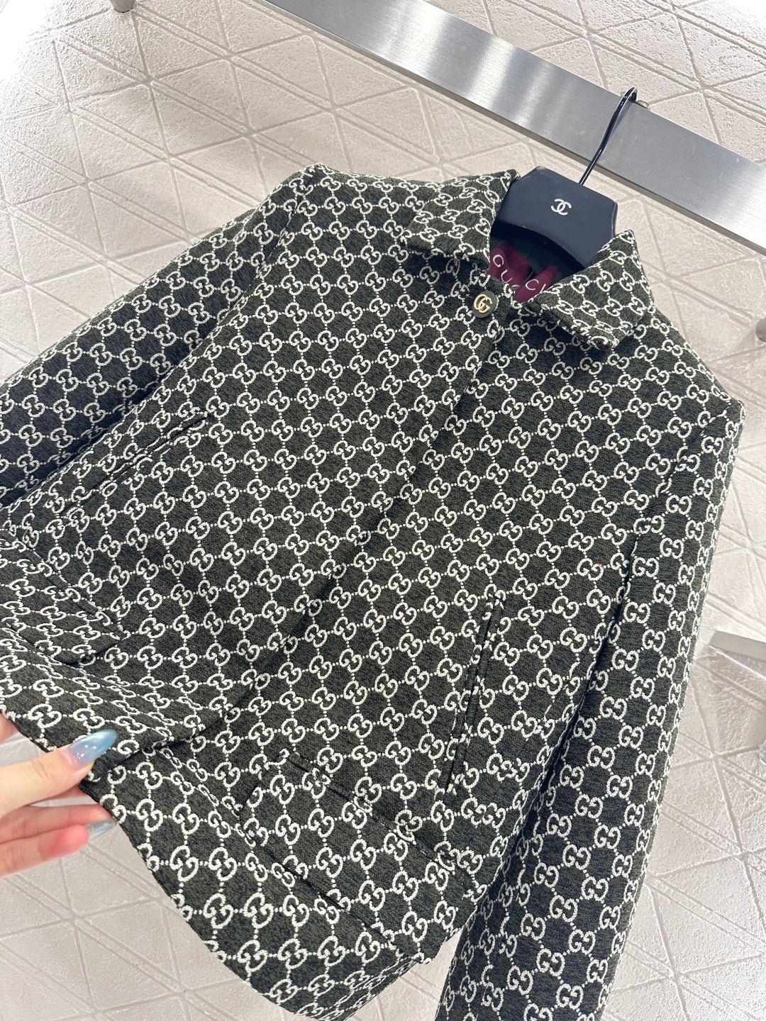 Made of wool jacquard material, the finished garment has excellent texture and appearance. The collar and shoulder suit short skirt set is tailored with a button open design and three-dimensional cutting to create a fashionable and neat style. The collar and front placket are single row engraved with letters and double G round buttons, and the large white green color scheme adds a sweet and elegant atmosphere. The details highlight the brand style. The flip pockets on both sides are matched with the same series of straight tube short skirts, and the details echo the must-have for autumn and winter. It looks tall and slim, versatile and can hold different occasions with a strong aura