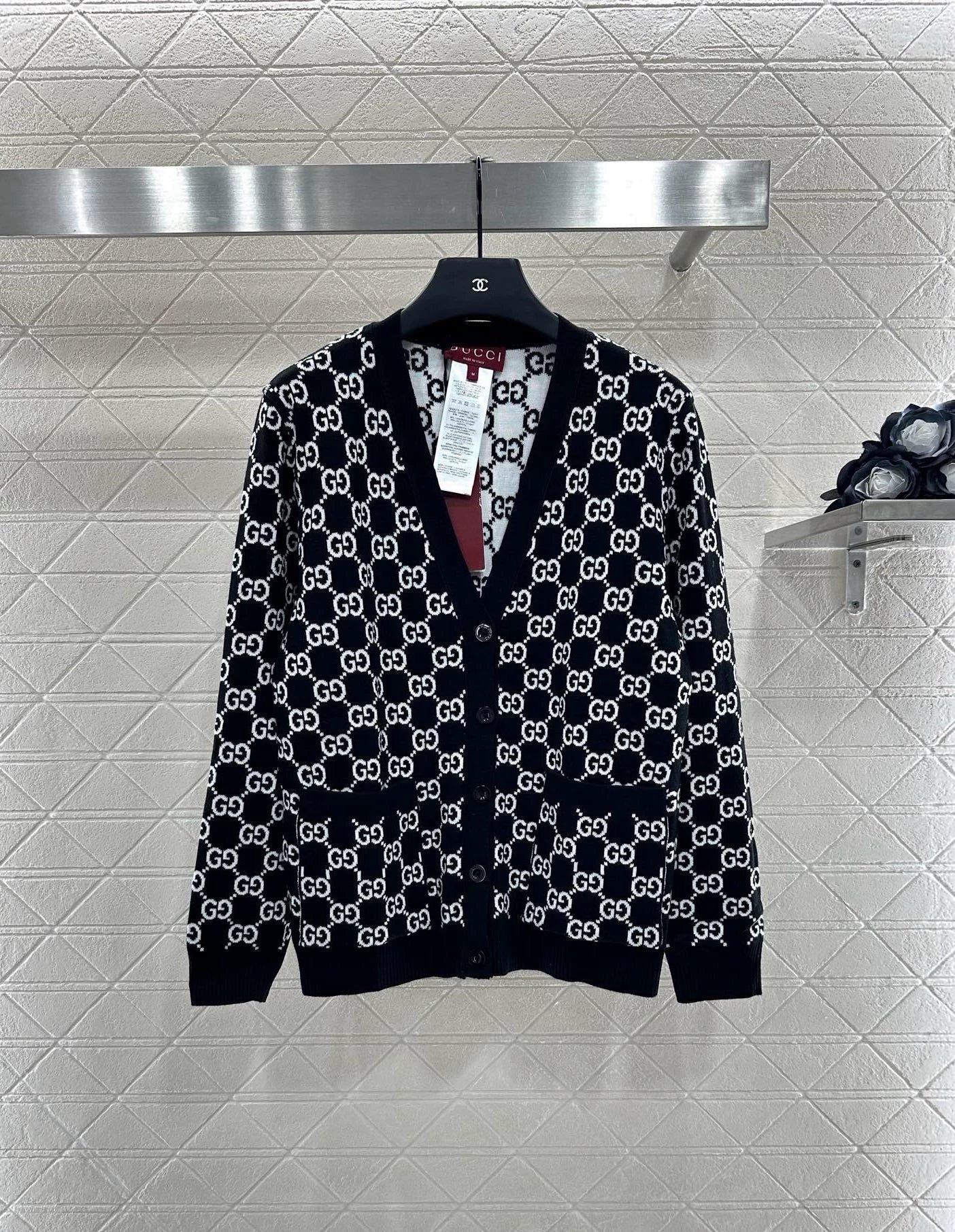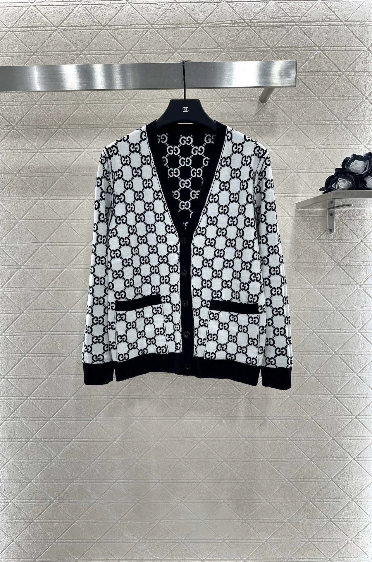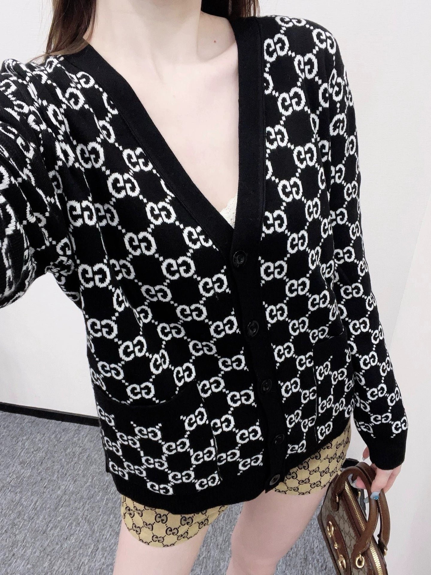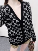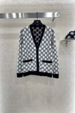 Custom YB wool knit fabric with a fine texture and a noticeably comfortable fleece feel. This V-neck cardigan features a molded button fastening and a V-neck design that flatters the neckline while adding a touch of sophistication. Contrasting black and white Double G logos are featured throughout. Reversible for dual-color wear, this cardigan offers a strong retro feel and a playful, youthful, and youthful look. Perfect for everyday wear or casual gatherings. Custom fabrics and accessories are available. Look for the latest version.