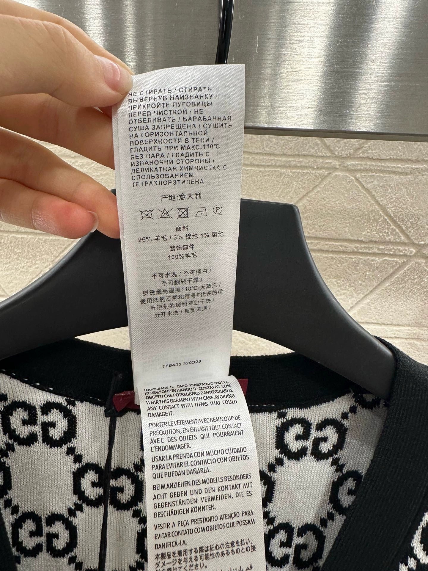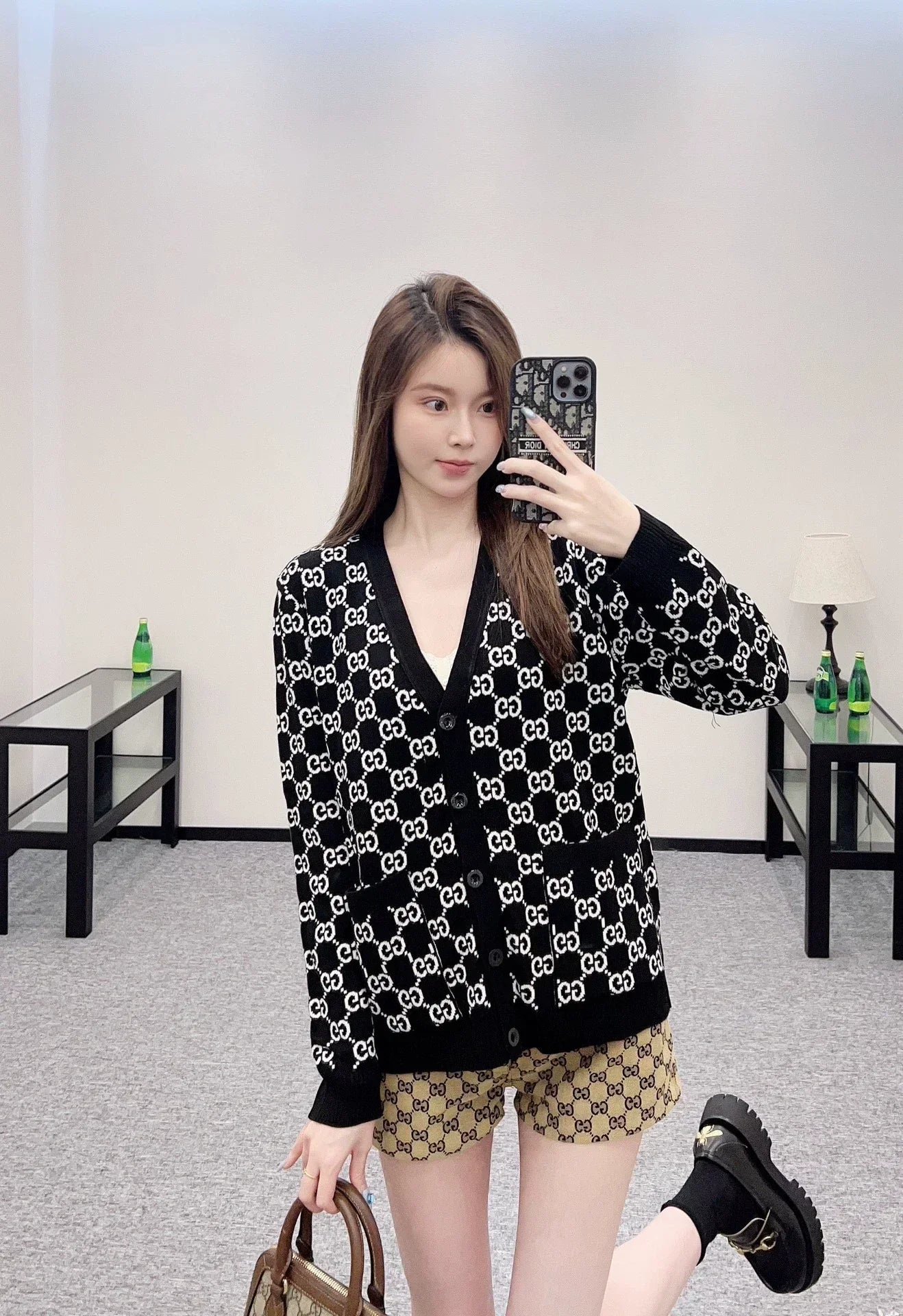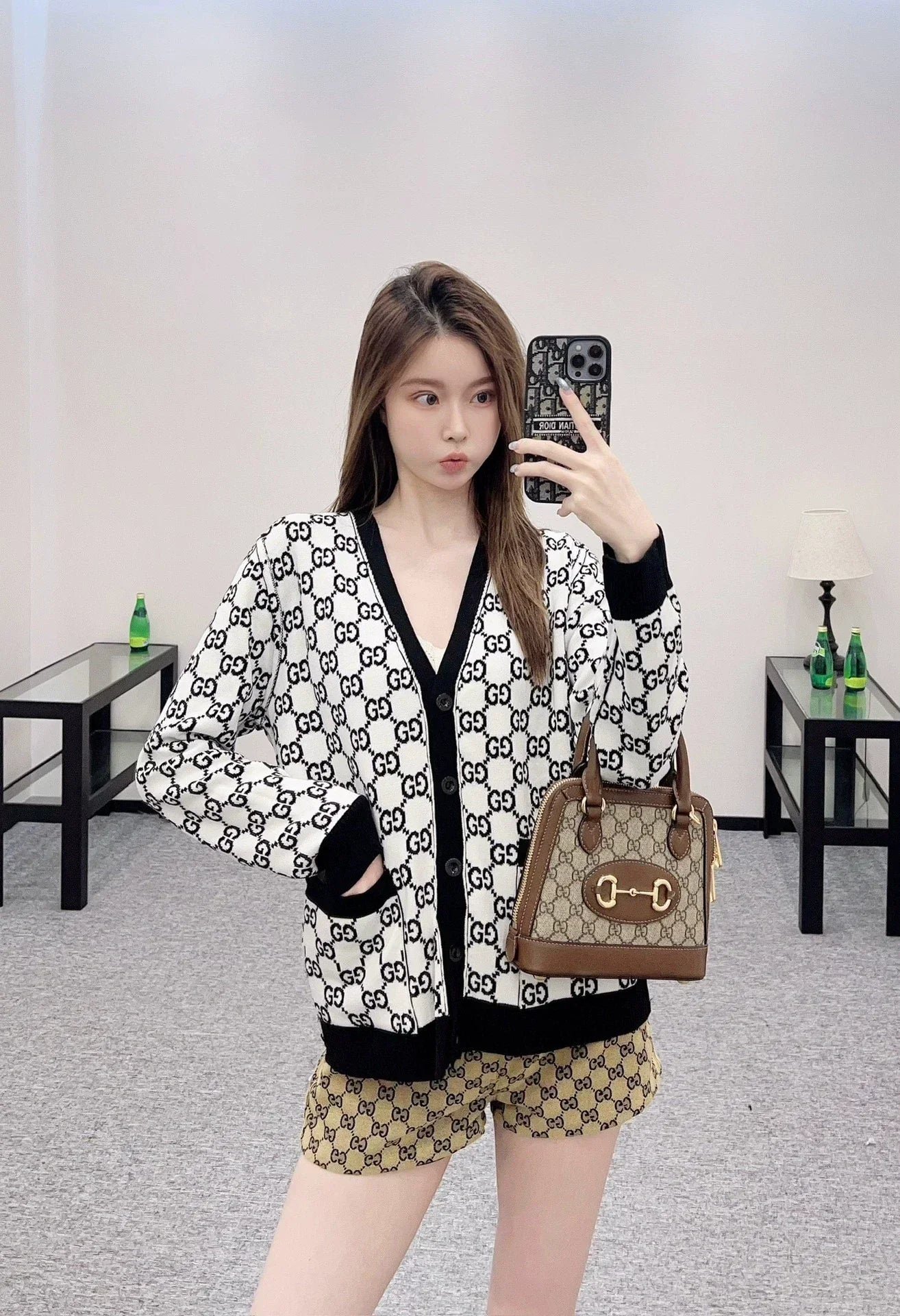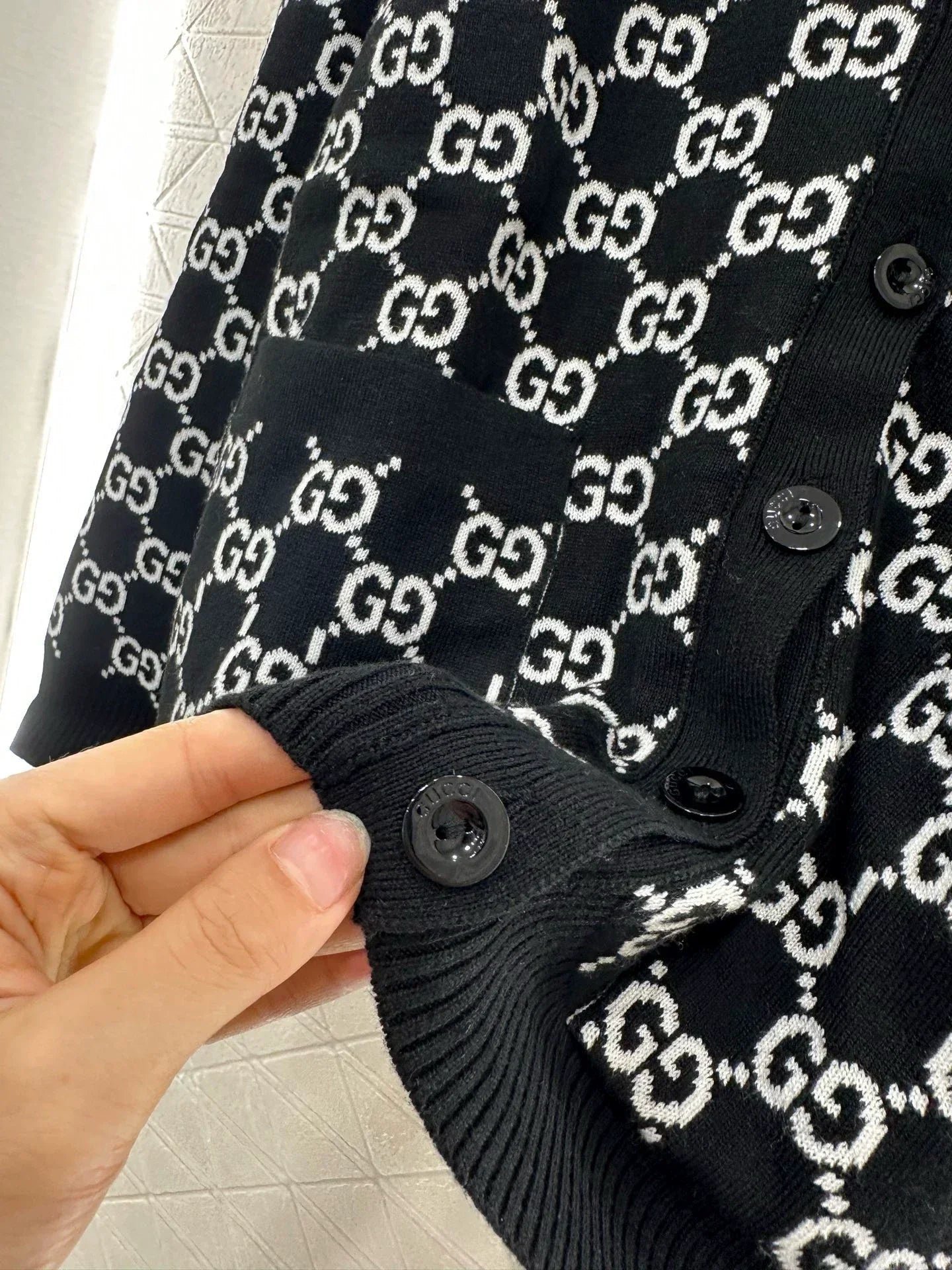 Custom YB wool knit fabric with a fine texture and a noticeably comfortable fleece feel. This V-neck cardigan features a molded button fastening and a V-neck design that flatters the neckline while adding a touch of sophistication. Contrasting black and white Double G logos are featured throughout. Reversible for dual-color wear, this cardigan offers a strong retro feel and a playful, youthful, and youthful look. Perfect for everyday wear or casual gatherings. Custom fabrics and accessories are available. Look for the latest version.