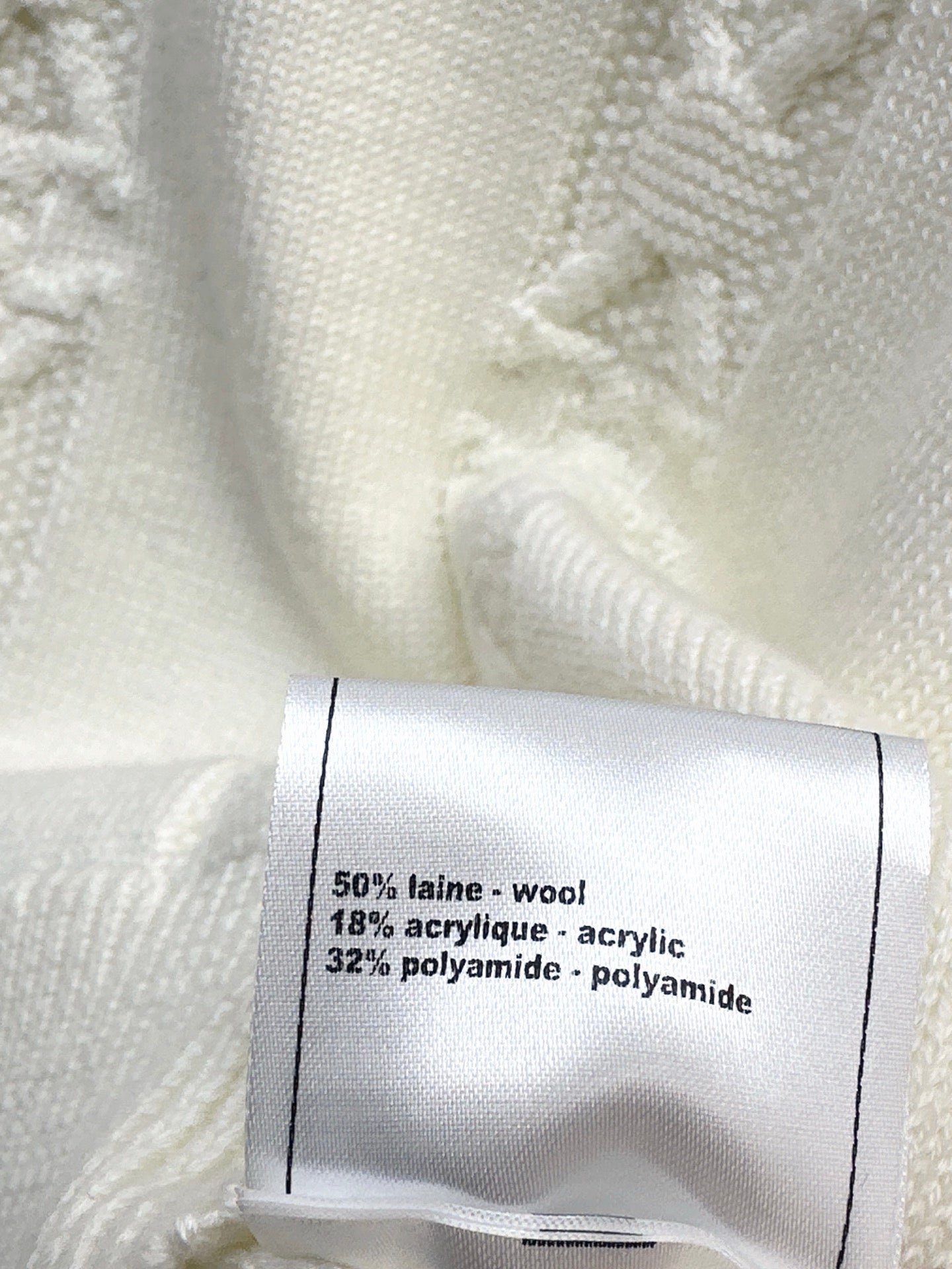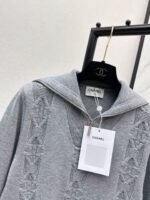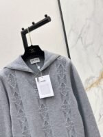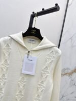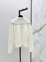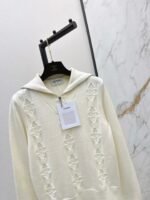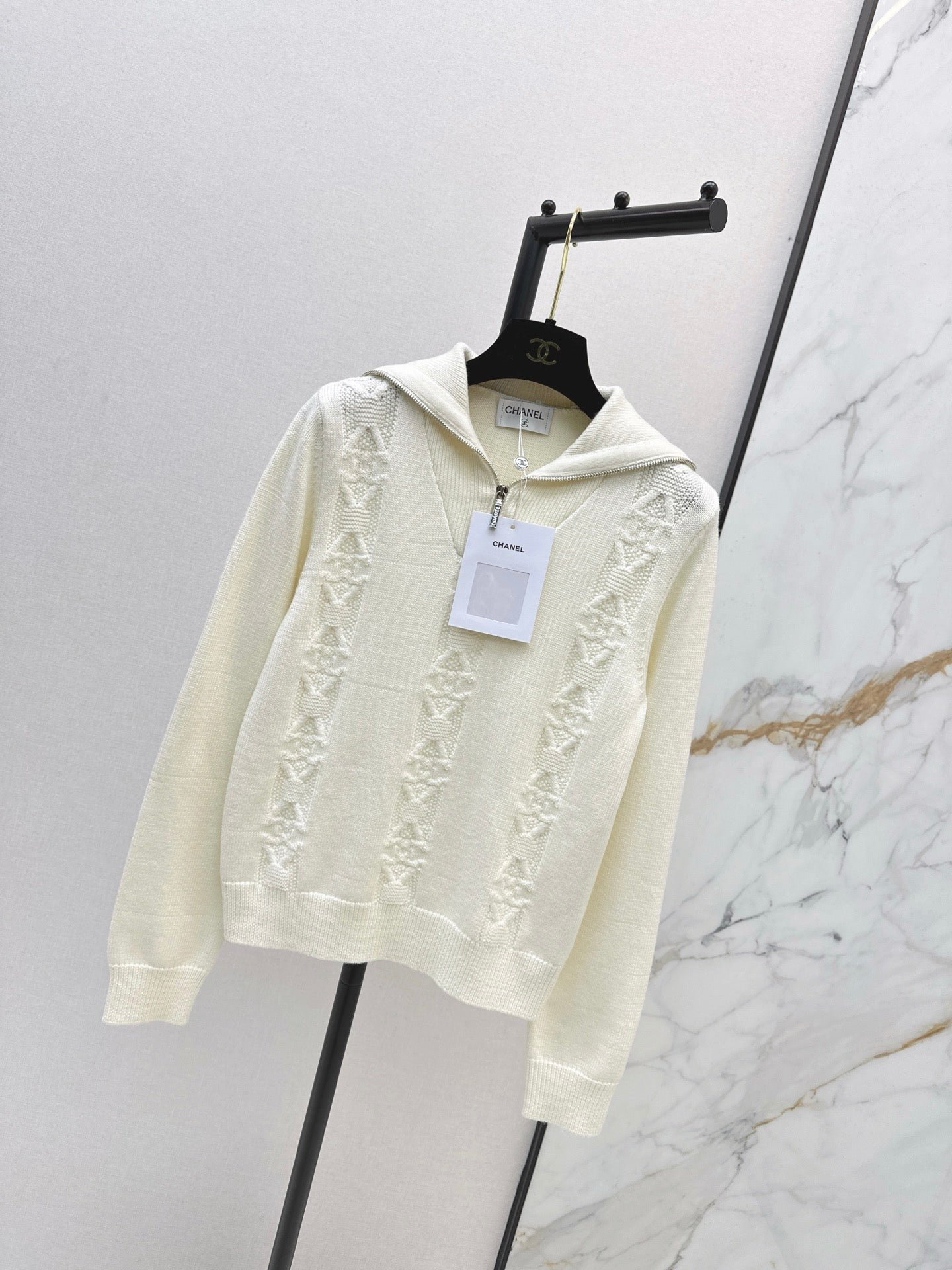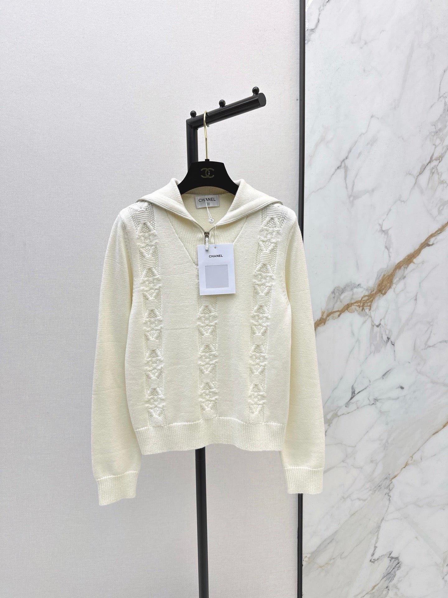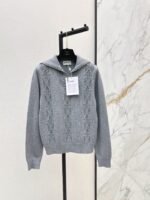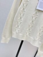 Crafted from cashmere and wool yarn, this sweater is delicate, soft, comfortable, and warm. The overall design features a large, triangular, vertically interwoven pattern for visual depth, complemented by chain and logo embellishments. The dropped shoulders add a relaxed feel. A wardrobe essential for everyday wear, commuting, and dates.