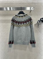 Cashmere knitted material, premium texture, comfortable and soft, round neck long sleeved sweater, collar and cuffs with threaded edging to match the hem, collar down to chest position, embellished with Nordic style hook and flower patterns of Fel Island, echoing the cuffs, and interspersed with original three-dimensional triangular polka dot patterns on the chest ➕ Plush double C letter logo, highlighting brand tone, cashmere knitted fabric, warm and comfortable, regular style, fashionable and stylish dressing, the preferred way to wear for various holiday atmospheres, and the focus of the crowd