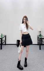 Made from high-quality imitation wool, this skirt offers a comfortable feel and superior texture. The smooth, flowing cut and high-waisted pleated design flatter the figure, with clean pleats that complement the hips. A leather buckle secures the waist, while a single and double distressed leather belt adds a vintage touch. These details showcase the brand’s style, creating a youthful and preppy look. The built-in anti-exposure shorts flatter the figure, and the length accentuates the waist and legs, projecting an elegant and sophisticated image.