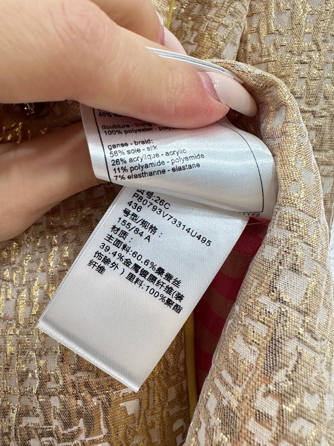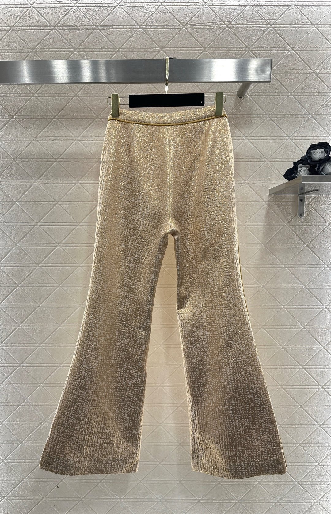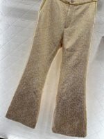 Crafted from imported silk-wool blend fabric, these trousers boast a luxurious texture and flattering silhouette. The pleated texture creates a cut-out effect with golden sheen, exuding opulence and sophistication. Pair them with the matching jacket from the same collection for effortless French-chic elegance, whether for daily commutes or special occasions.
