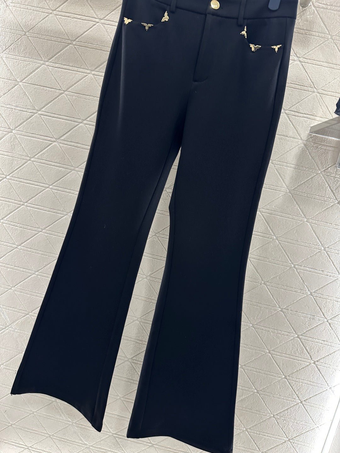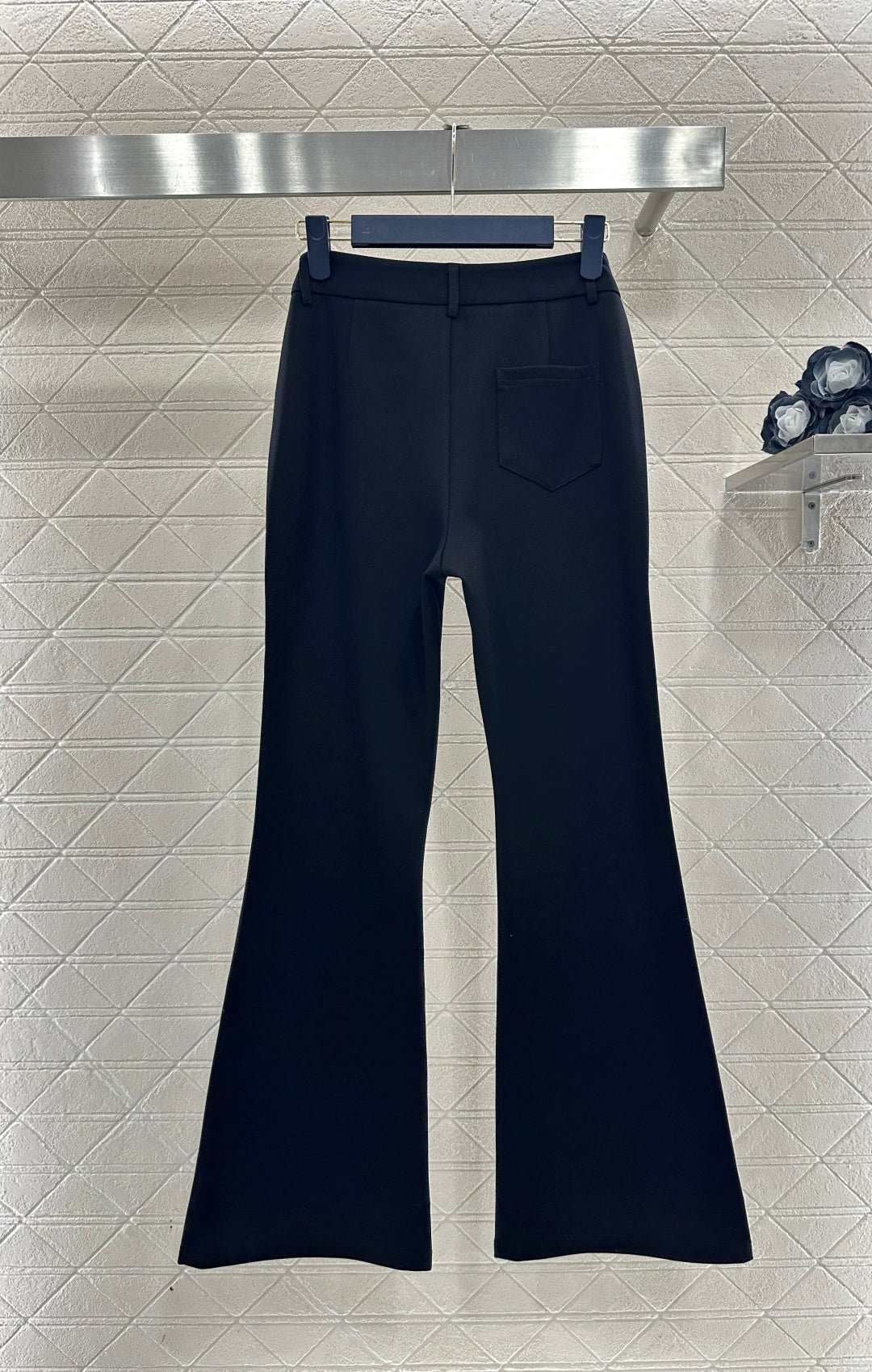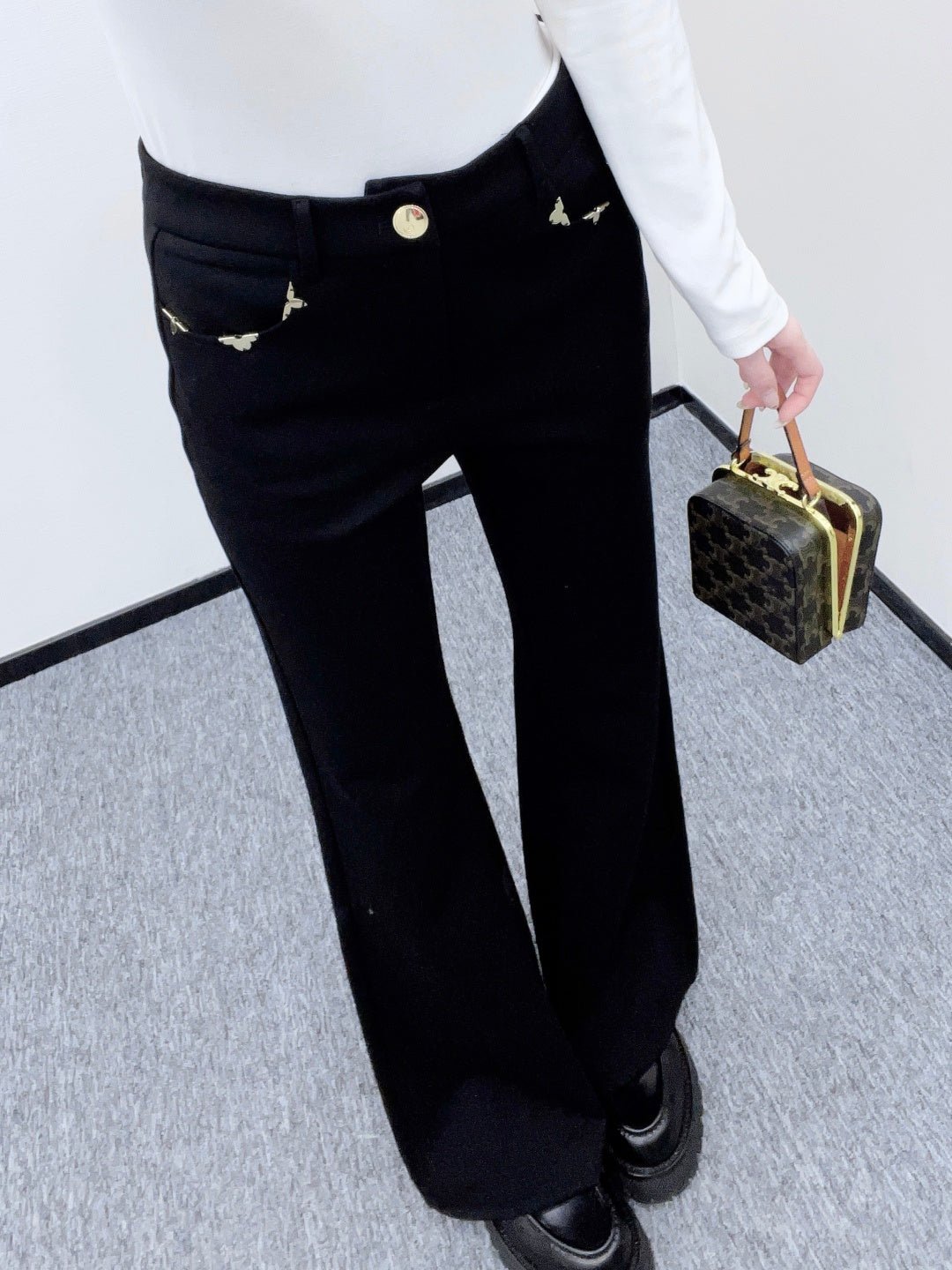 Made of high-elastic cotton wool, the fabric is stretchy and comfortable, with a short-pile brushed lining, perfectly matching the autumn and winter temperatures. It’s warm and stylish. The high-waisted, slightly flared trousers are a wardrobe essential. The clean high-waisted cut easily elongates the leg lines, and the gold three-flower metal decoration on the pocket is the finishing touch. It perfectly blends simplicity and sophistication. Whether paired with a shirt for a commuting look or with a knitwear for a casual vibe, it can exude a unique aura and style.