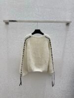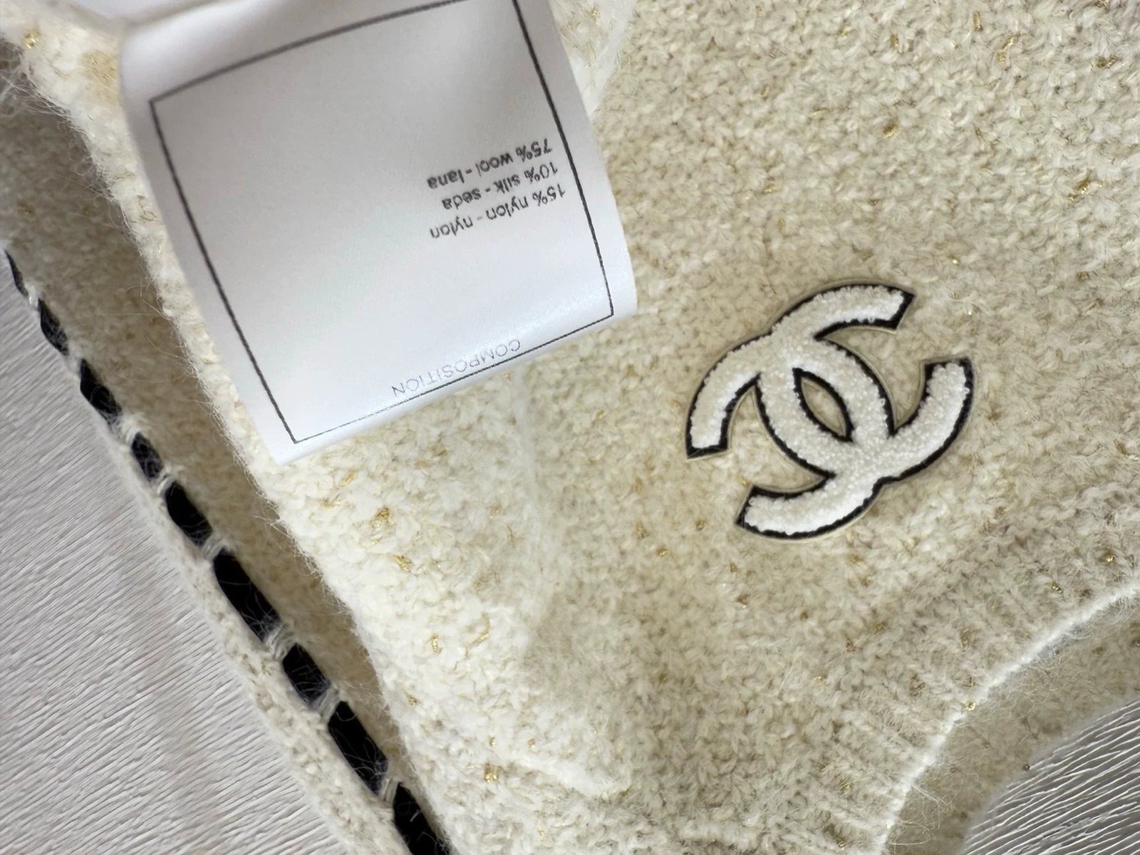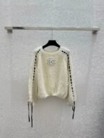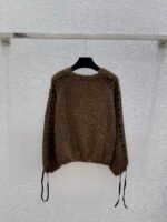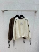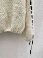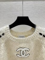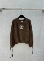 Classic CC logo embroidery on the chest, with hollowed out stripe design on the sides. The fabric is made of a blend of 75% wool, 15% nylon, and 10% silk, which is soft and comfortable. It features a pullover style and a loose fit.