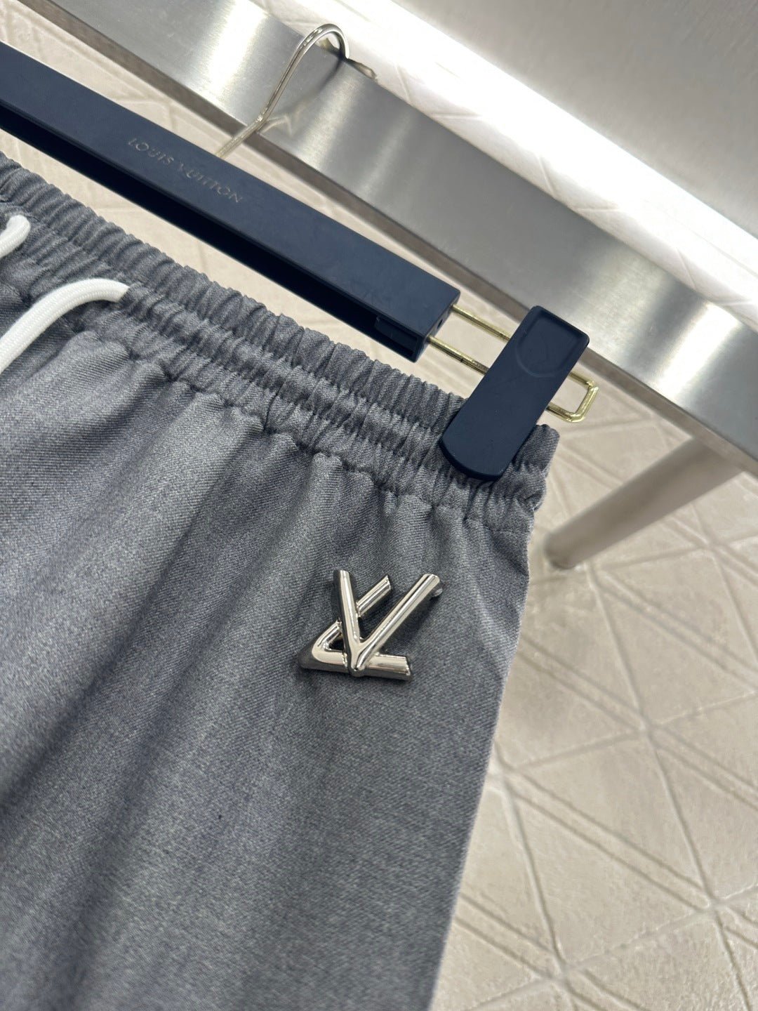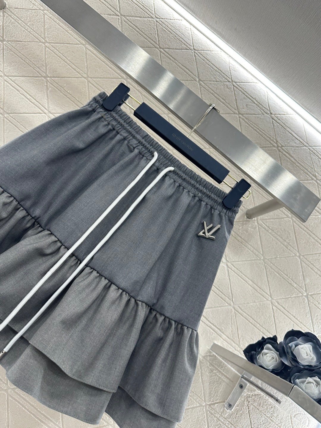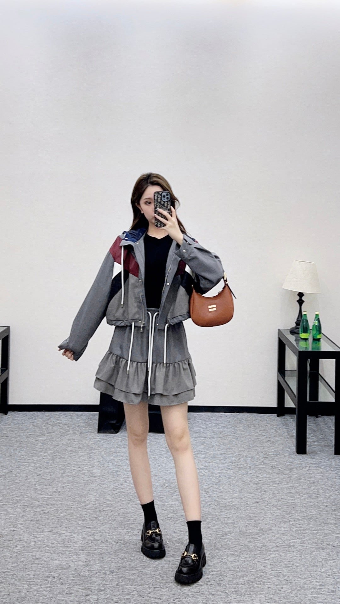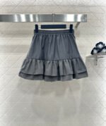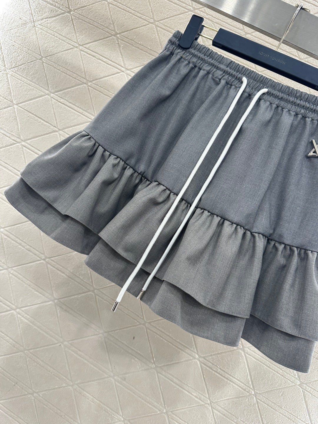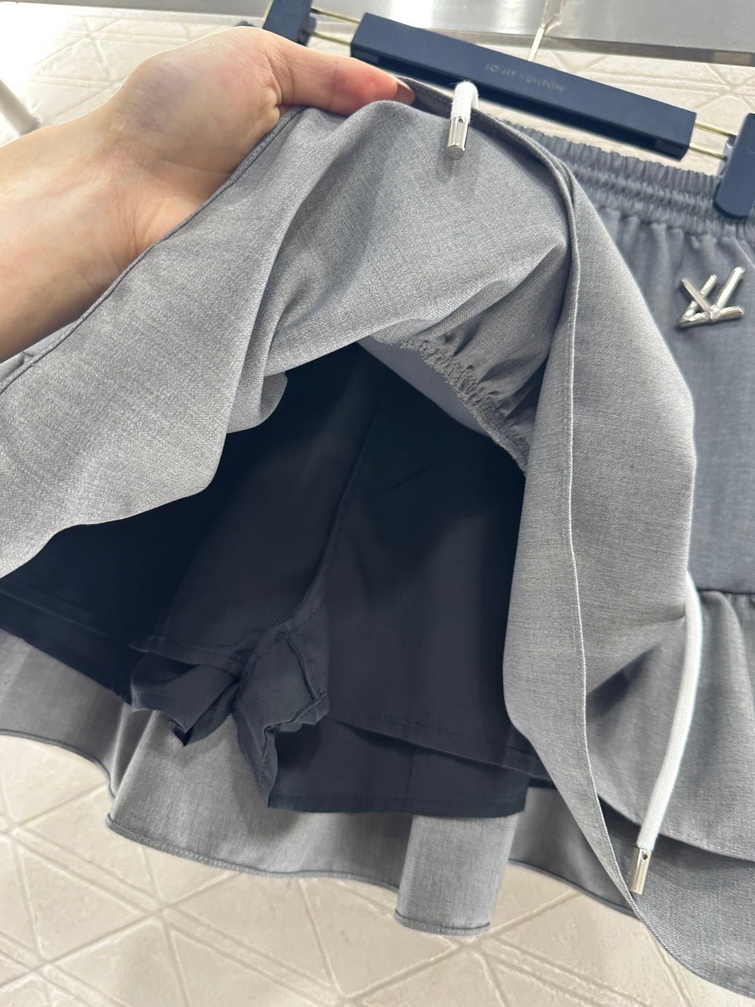 Made from imported materials, this hooded jacket and ruffled skirt set boasts a luxurious sheen and a smooth, structured drape. The combination is both sweet and cool, with a sophisticated dark gray base that exudes elegance. The double-layered ruffled skirt adds a touch of girlish charm, while the drawstring waistband and metallic LV logo detail complete the look. The fabric is crisp yet drapes beautifully, making it easy to style with either a sweatshirt or a cropped jacket for a chic and edgy look. The set includes built-in anti-exposure underwear for added comfort and flexibility. The complete outfit is incredibly stylish and a must-have for trendsetters, suitable for various occasions including casual outings.