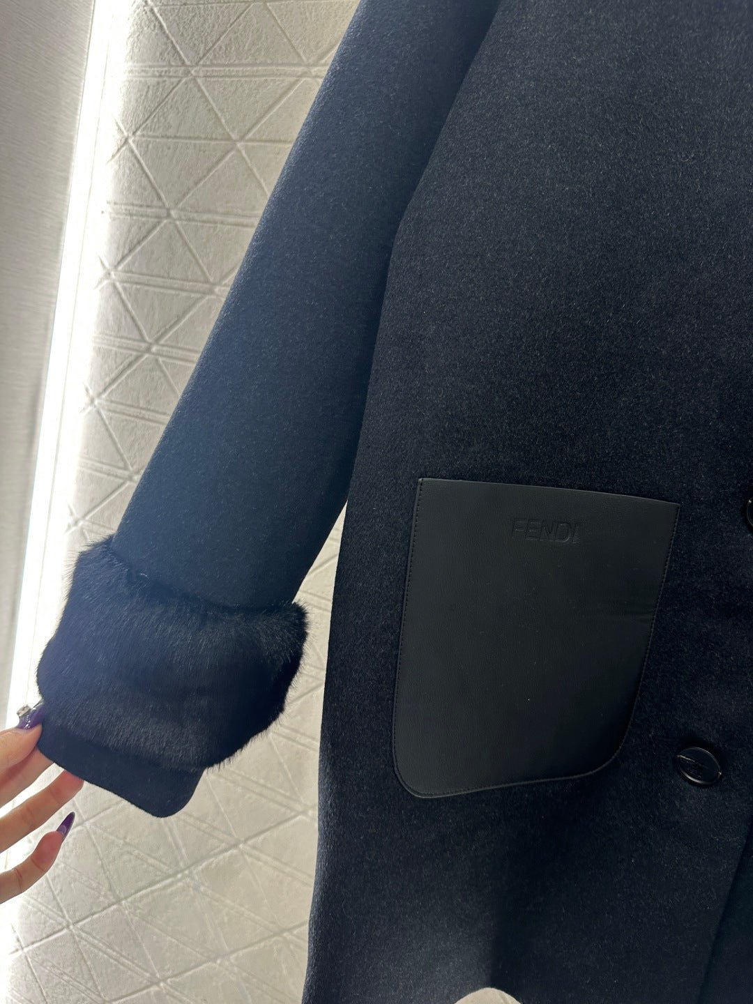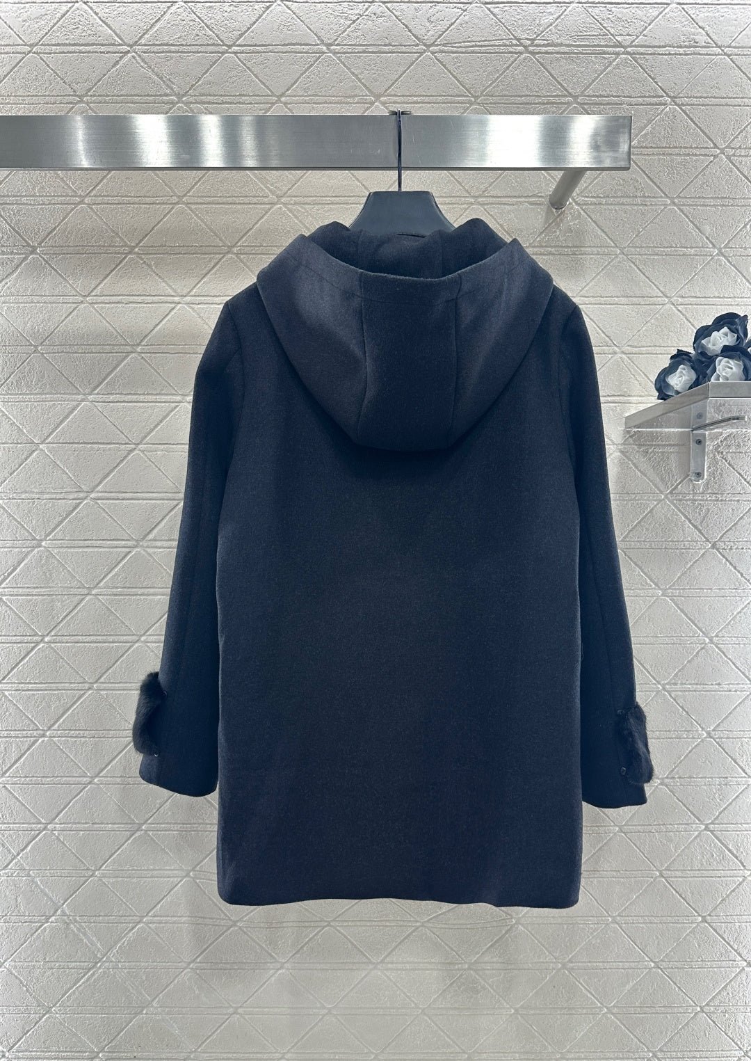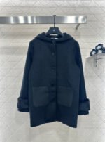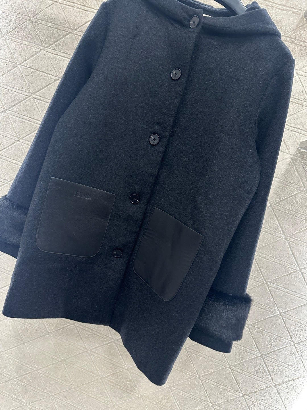 Made of wool fabric with a premium feel, this mid-length hooded coat offers excellent warmth. The cuffs are trimmed with silky fur, and it features symmetrical leather pockets with engraved logos. The lining is covered in a subtle double-F jacquard pattern, creating a rich visual effect and showcasing understated quality. The straight, relaxed silhouette is flattering and exudes elegance. A must-have coat for everyday wear, commuting, and dates in autumn and winter.