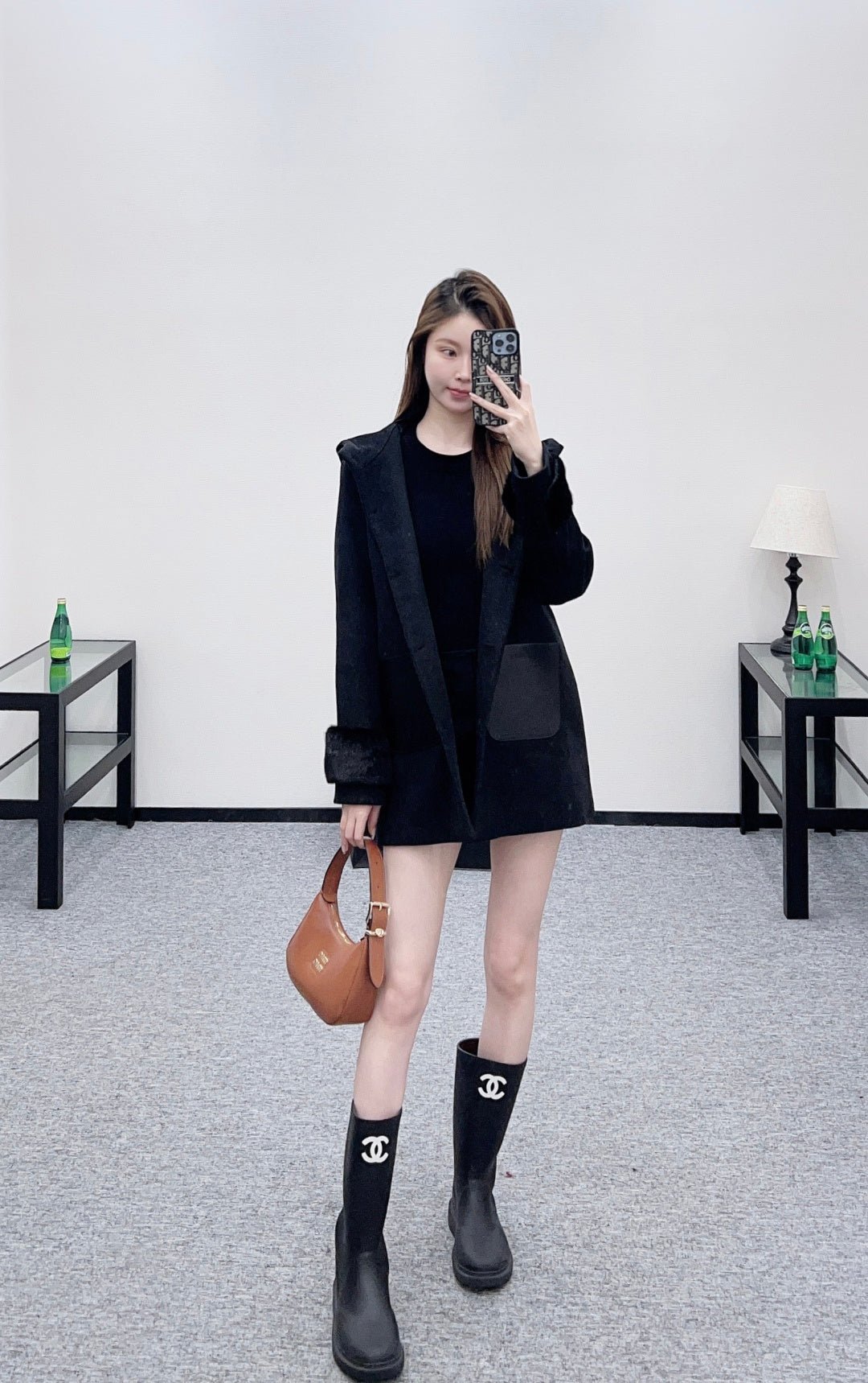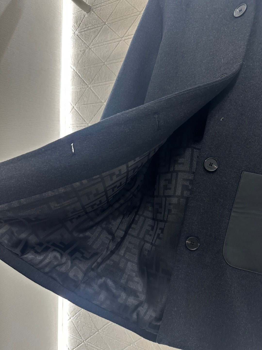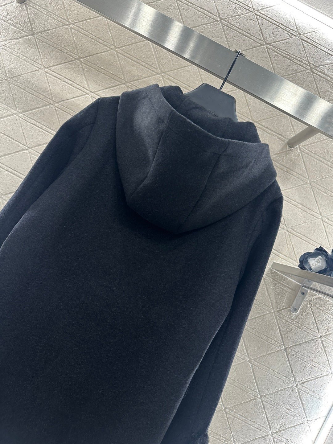 Made of wool fabric with a premium feel, this mid-length hooded coat offers excellent warmth. The cuffs are trimmed with silky fur, and it features symmetrical leather pockets with engraved logos. The lining is covered in a subtle double-F jacquard pattern, creating a rich visual effect and showcasing understated quality. The straight, relaxed silhouette is flattering and exudes elegance. A must-have coat for everyday wear, commuting, and dates in autumn and winter.
