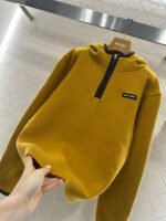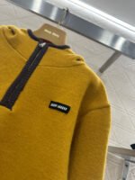 Made from wool yarn, this sweater is soft, skin-friendly, comfortable, and stylish. It features a hooded zip-up design with a half-open zipper and an adjustable neckline. The subtle skin exposure enhances the head-shoulder proportions, creating a slimming effect. The body is accented with contrasting trim and a letter logo on the chest for added depth. The overall look has a strong retro vibe, and the loose fit flatters the figure, creating a playful, youthful, and flattering silhouette.