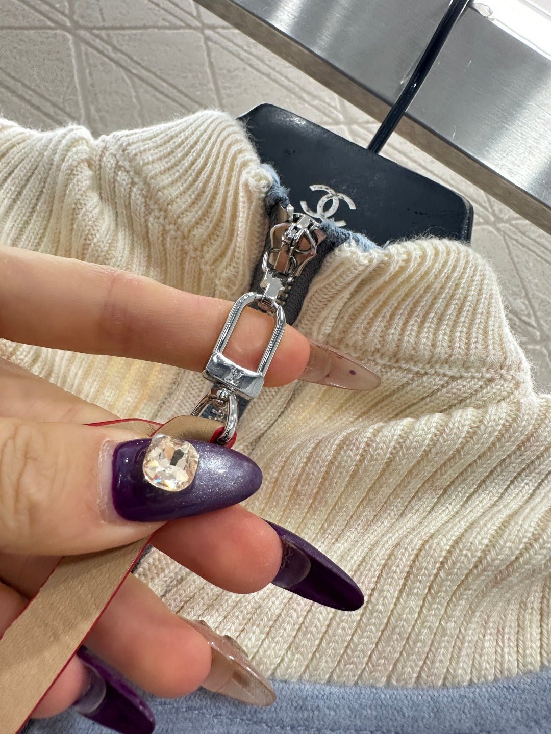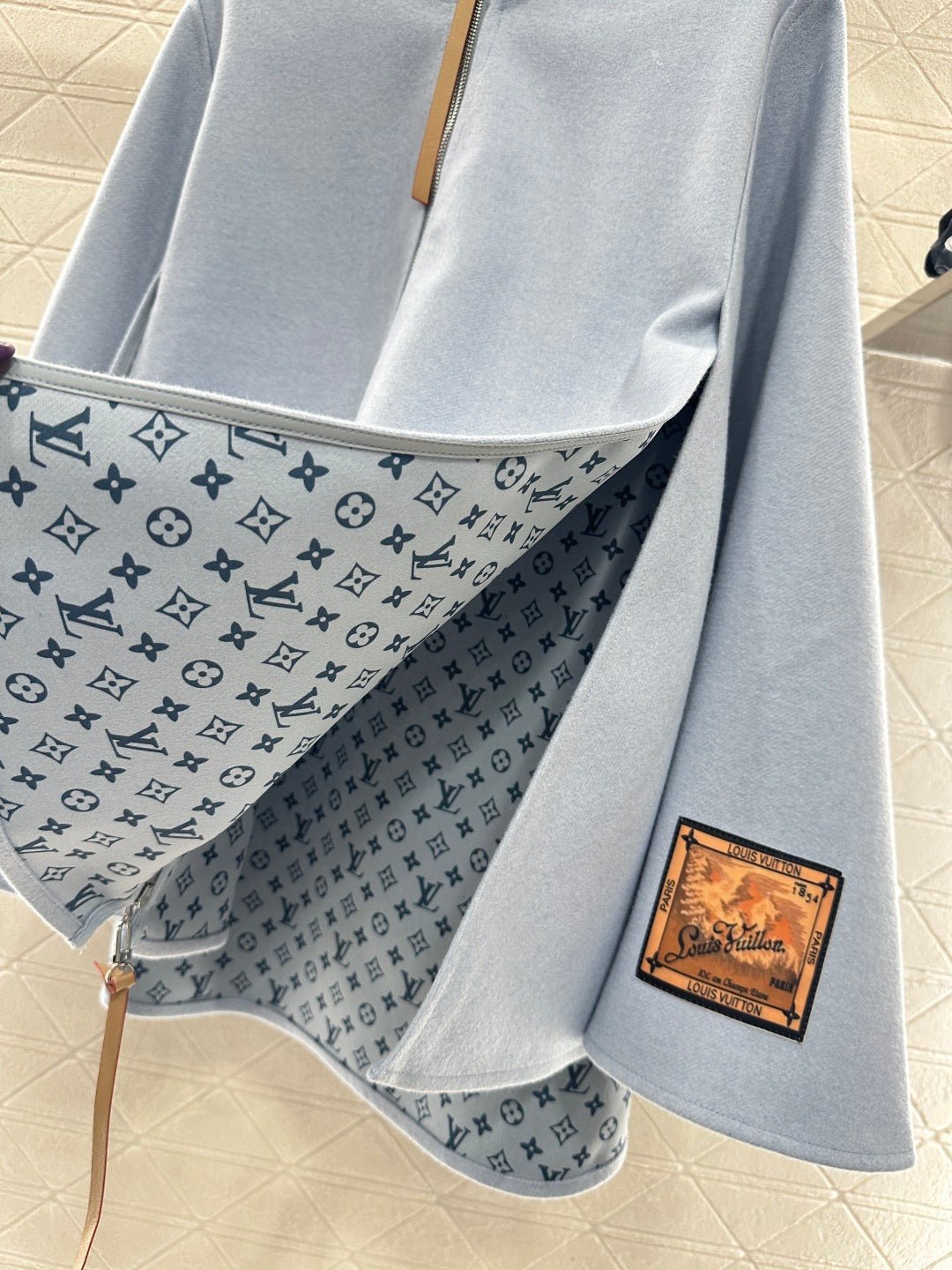 Made from a wool blend, this high-quality knitted stand-up collar zip-up cardigan boasts a smooth, flowing drape. The A-line silhouette features a cape-like, umbrella-shaped cut and is available in a striking two-tone color scheme of sky blue and off-white, creating a layered and visually appealing look. The sleeves are slit, and the lining is covered in a four-leaf clover logo jacquard, exuding a fashionable and sophisticated style. A logo motif is also present on one cuff.