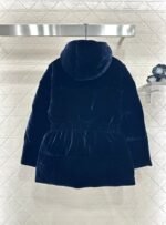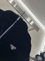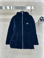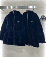 Velvet material, white goose down filling the interior, the whole piece is lightweight and warm, rectangular embossed, decorated with classic metal triangle logo on the chest, echoing the soft velvet with full luster, showing the brand’s low-key luxury. The hooded waist cut can keep warm while also successfully outlining the waistline, improving the proportion of the body, avoiding bloating, and dressing in a fashionable and stylish style
