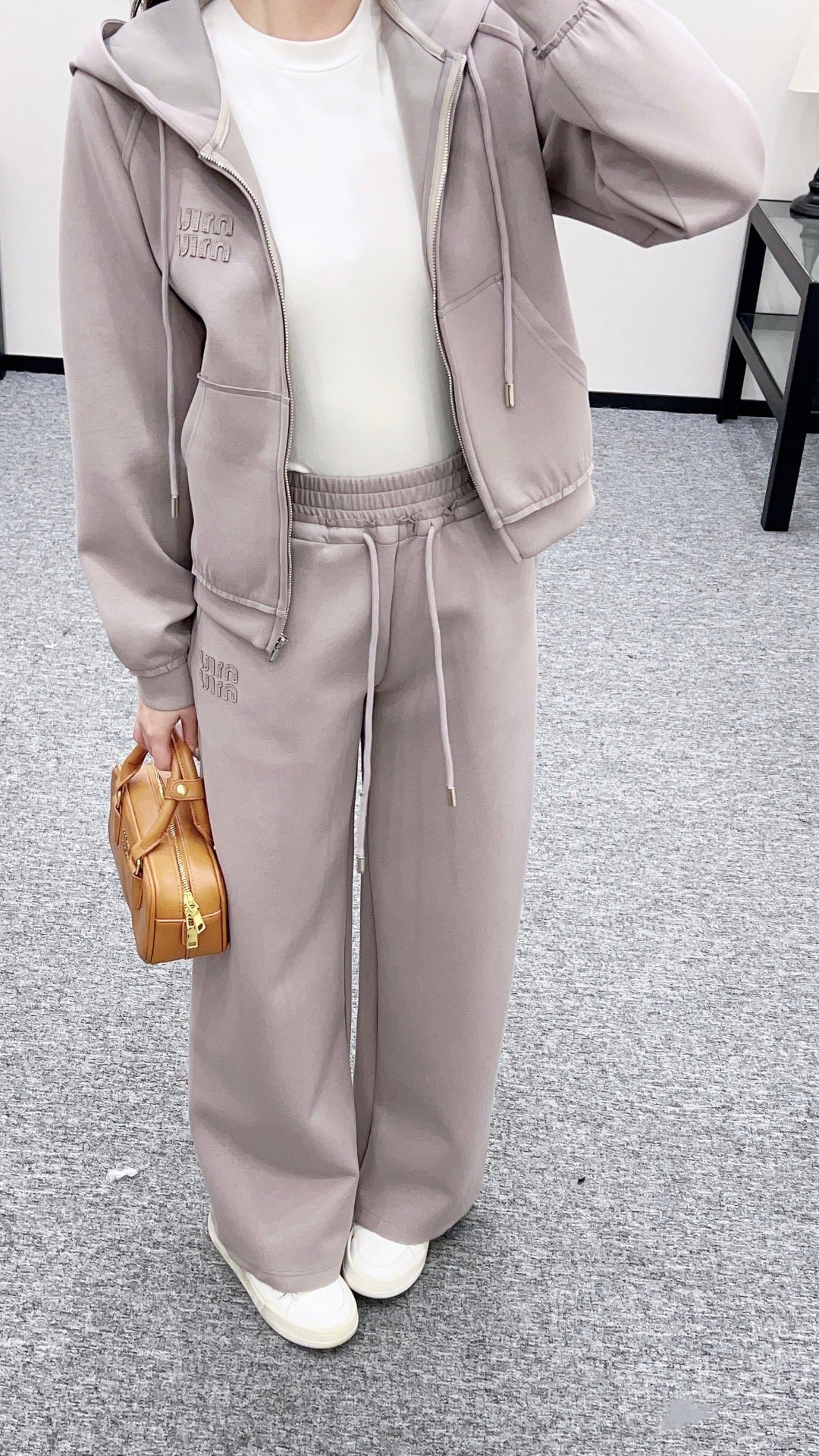 Made of pure cotton, this jacket is soft and skin-friendly, with a moderate thickness for warmth. It features a hooded, casual zip-up design and a versatile solid color. A three-dimensional logo on the chest adds a touch of brand style. Symmetrical slanted pockets with ribbed elasticated drawstring ensure practicality. Pair it with matching drawstring wide-leg trousers for a coordinated look, suitable for various outdoor and casual occasions.