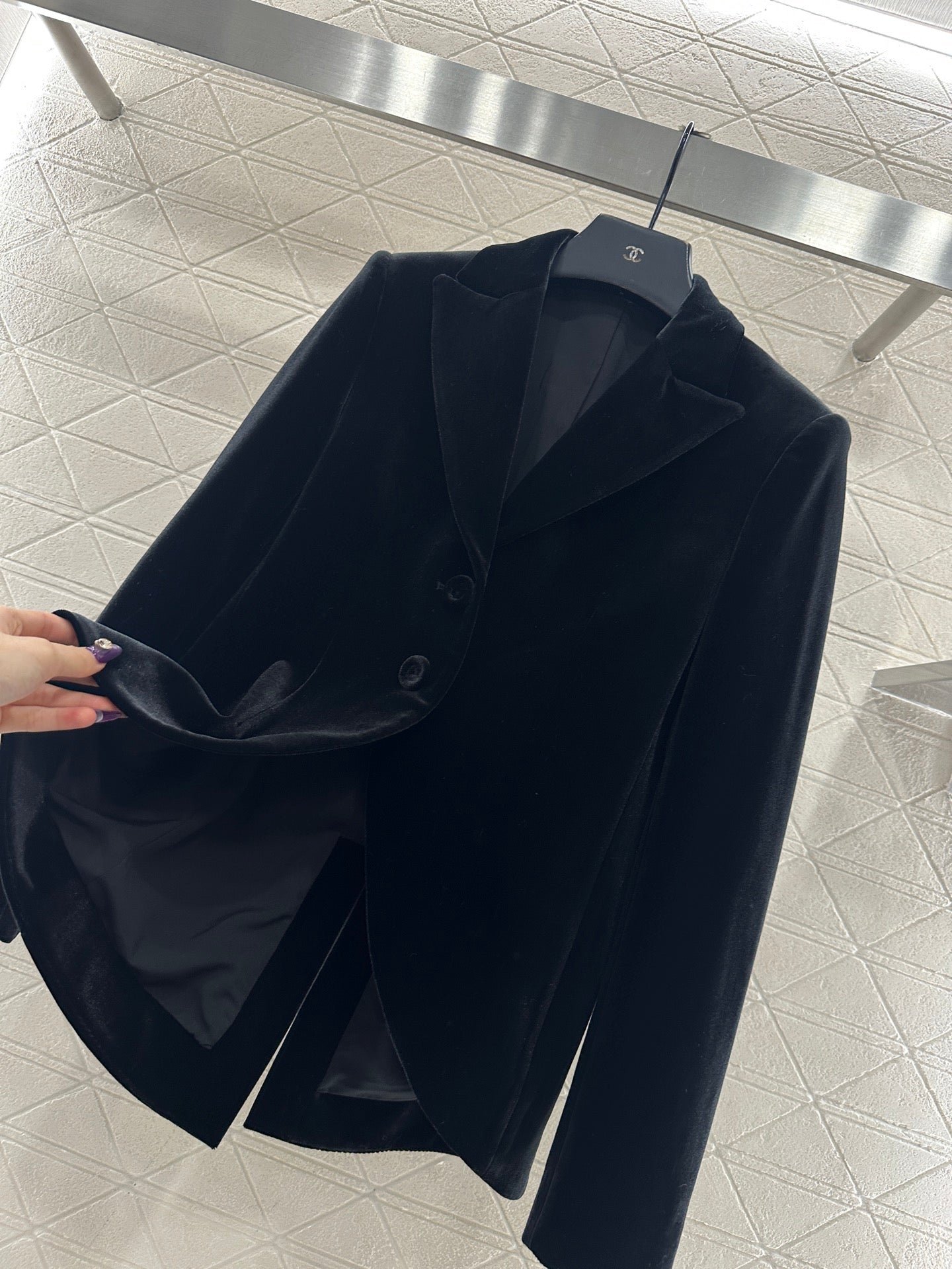 Velvet material, glossy texture, comfortable drape, lapel suit style, black velvet soft and reflective throughout, elegant temperament, single button fixed front, matched with irregular half moon shaped hem, showing artistic tone. The back waist slit is three-dimensional and inclusive, suitable for more layering schemes including skirts, with an elegant temperament