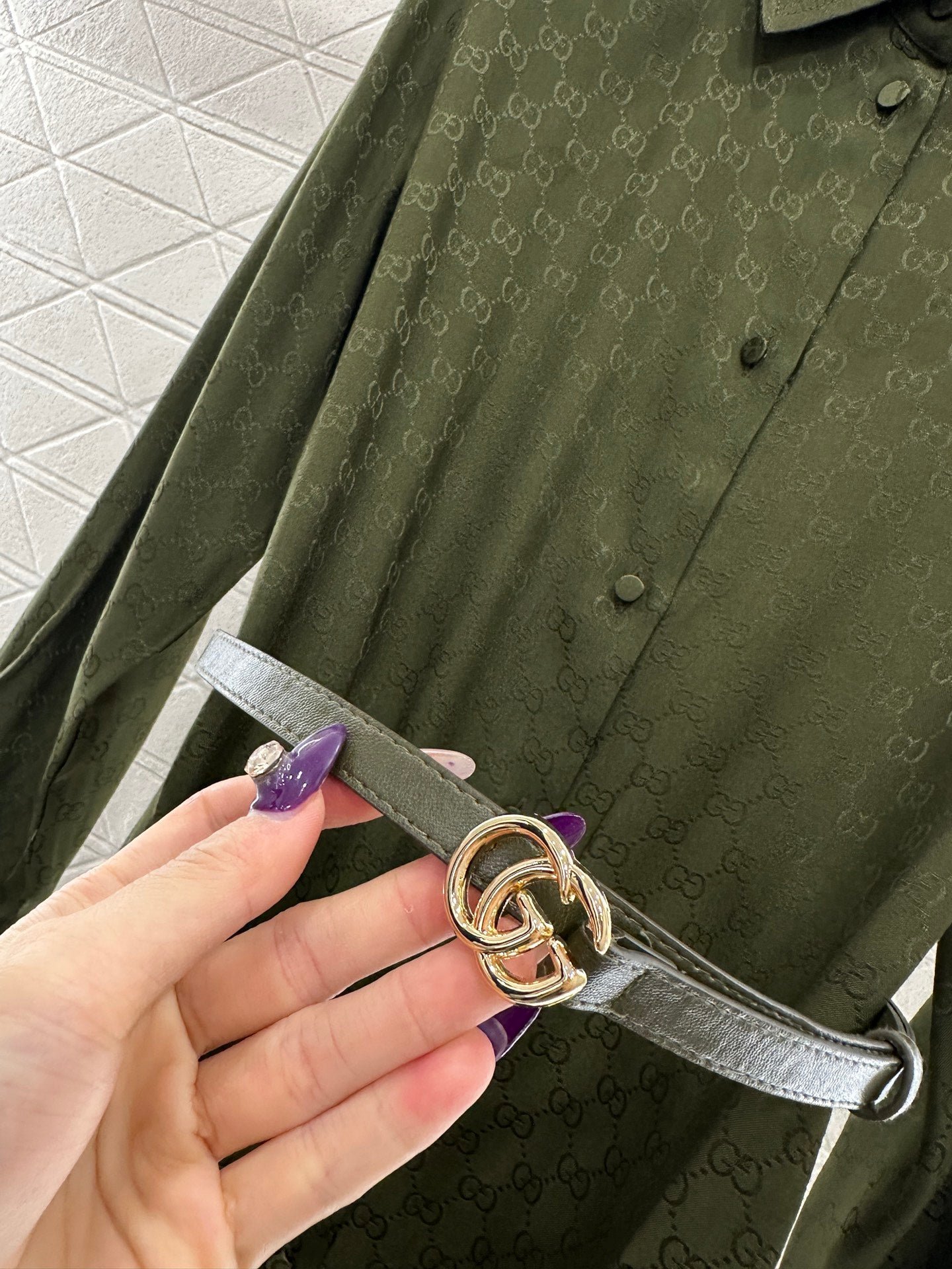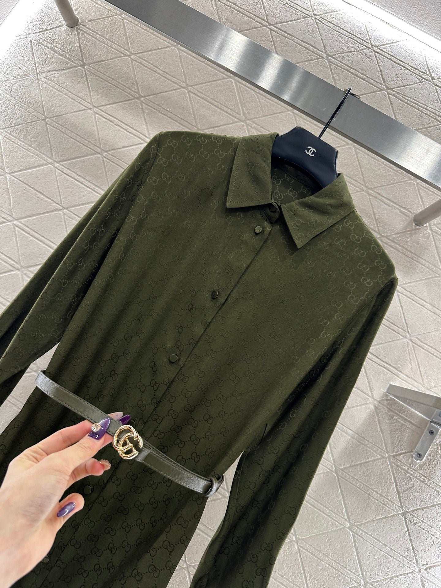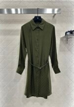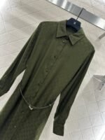 Jacquard material, comfortable and delicate texture, with a flowing and stylish design. The shirt features a waist cinching dress with neat and slim cuts, button open placket, straight cut, and letter waistband for waist cinching effect. The knee length skirt is agile and elegant, highlighting the waistline and hips. The entire body is covered with double G letter patterns, and the jacquard pattern highlights the brand’s delicacy. The upper body is full of fashionable and elegant atmosphere
