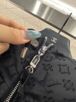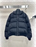 Jacquard material, down filled interior, lightweight and warm overall, drawstring hooded down jacket, elastic thread edging, close fitting and comfortable, easy to wear without appearing bulky, stronger wearability, rectangular grid texture, matched with whole body clover jacquard letters, presenting a sense of old money and high-end style taste. The zipper pocket and sleeve side zipper complement each other, forming a layered highlight, integrating warmth and fashion, getting rid of the traditional down bulky, the first choice for autumn and winter layering.
