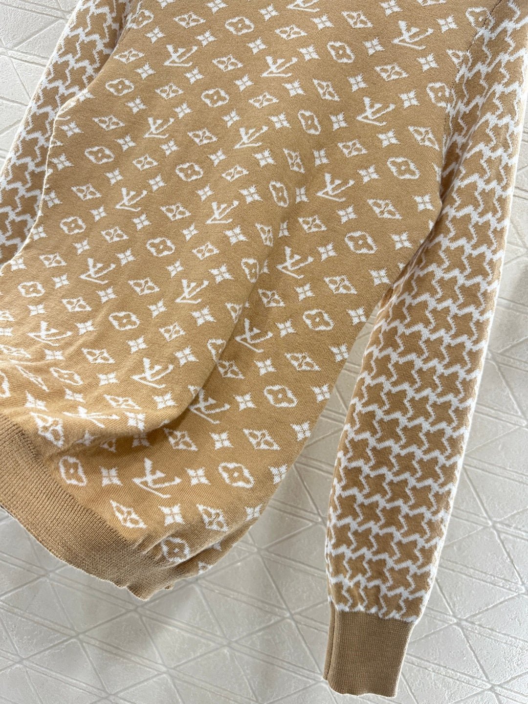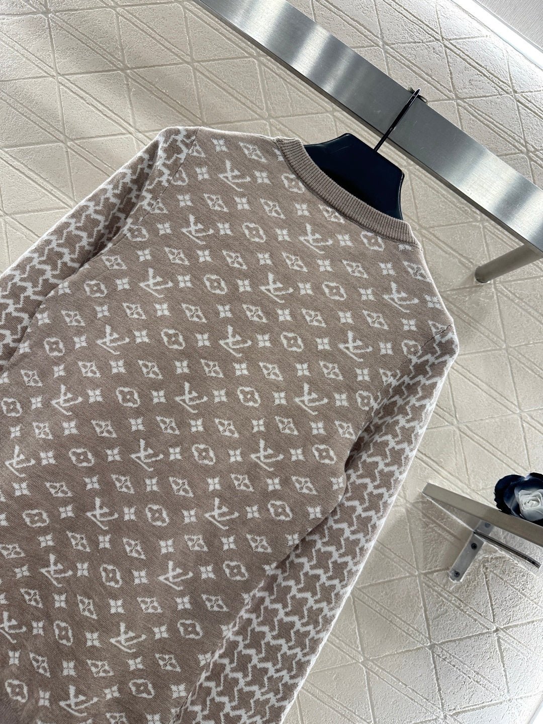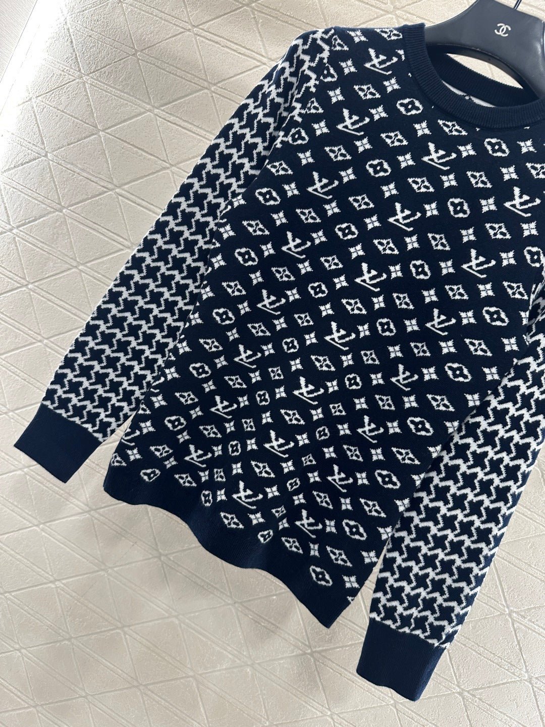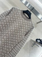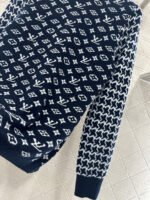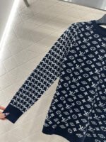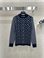 Wool knitted material, premium texture, comfortable and soft, round neck long sleeved sweater cut, collar and cuff thread edging echoing the hem, torso covered with clover and letter logo patterns, contrasting with the Thousand Bird Grid on the sleeve arms to form a color pattern, full of vintage feeling, highlighting the brand tone, wool knitted fabric, warm and comfortable, regular style, simple and versatile for autumn and winter daily use