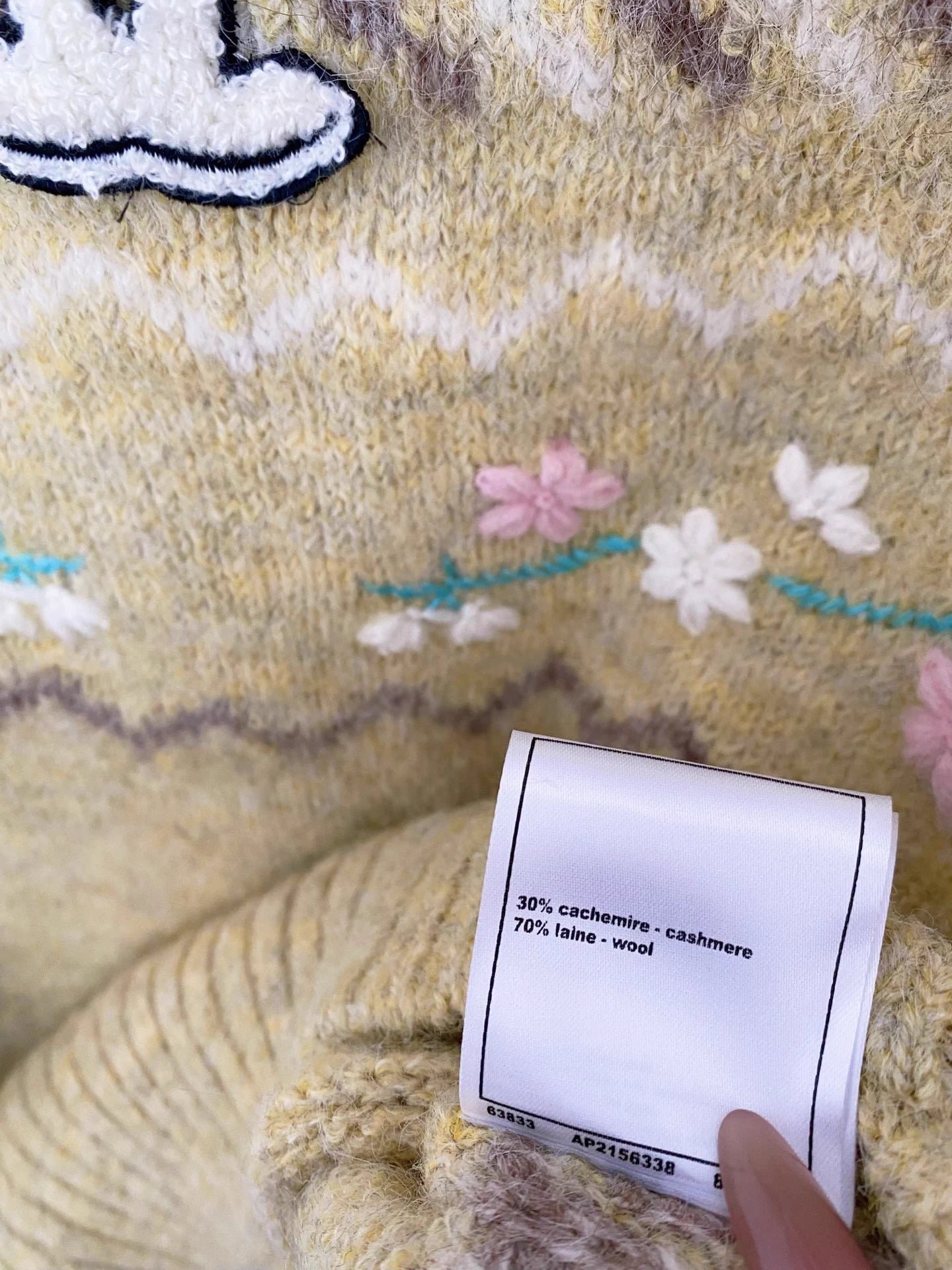 Yellow, autumn/winter style, long-sleeved pullover, loose fit, suitable for most body types. Made of a wool blend, soft to the touch and comfortable to wear. Features a classic logo embroidery on the chest, and small floral embellishments on the cuffs and hem, showcasing exquisite details and workmanship.