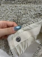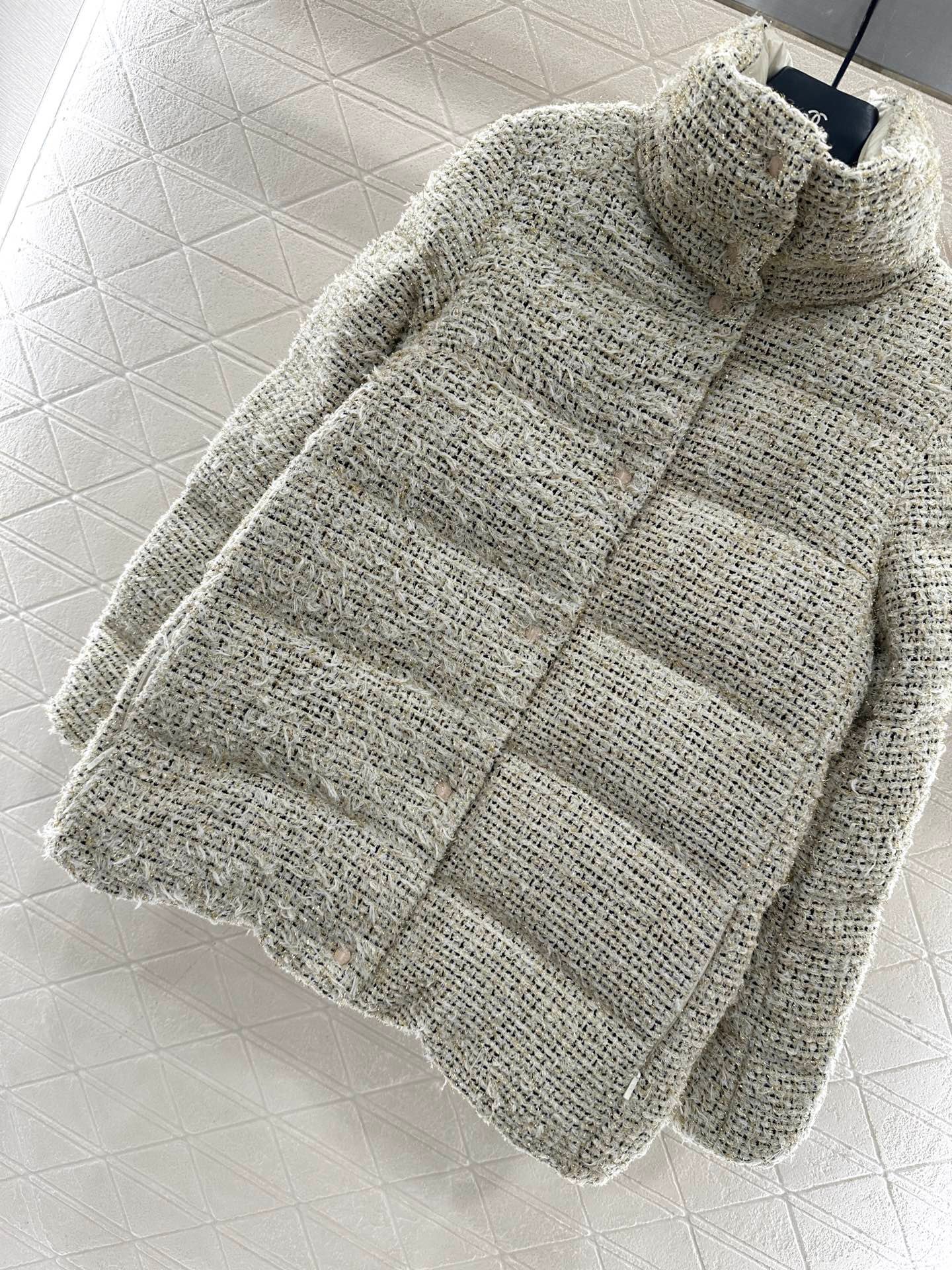 Made of woolen material and filled with white duck down, the whole piece is lightweight and warm. The standing collar is a medium length jacket with a threaded elastic edge that tightens and keeps warm. The interwoven silver threads reflect light, and the large body is paired with a beige checkered texture, creating a gorgeous visual effect that breaks the dullness of autumn and winter. The weaving mechanism is delicate, showcasing the brand’s style. The logo fabric on the outside of the arms is full of delicacy. The medium length version is not picky about style and body shape, and when paired with skirts and pants, it shows a high street fashion style.