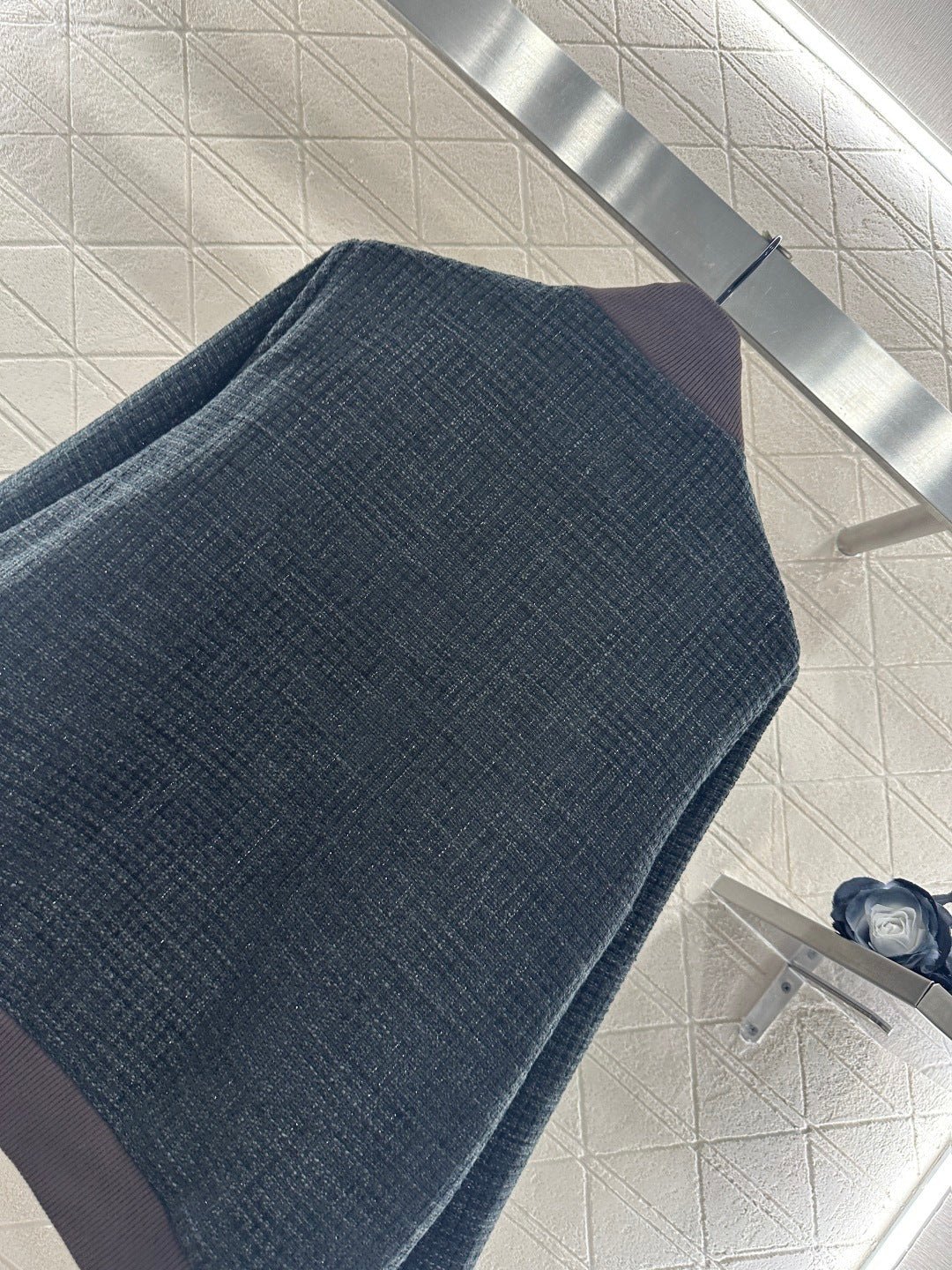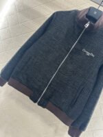 Coarse tweed material, with obvious texture and comfortable texture. The jacket is cut with a solid carbon black base, and the coarse floral weaving texture is highlighted. The chest letter logo is lit up, giving it a low-key and fashionable feeling. Combined with the deep brown elastic thread on the collar and cuffs, it fits snugly against the body and looks neat. The overall tone is full, easy to match, and it is a high-end and fashionable style