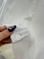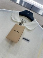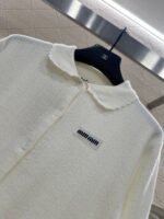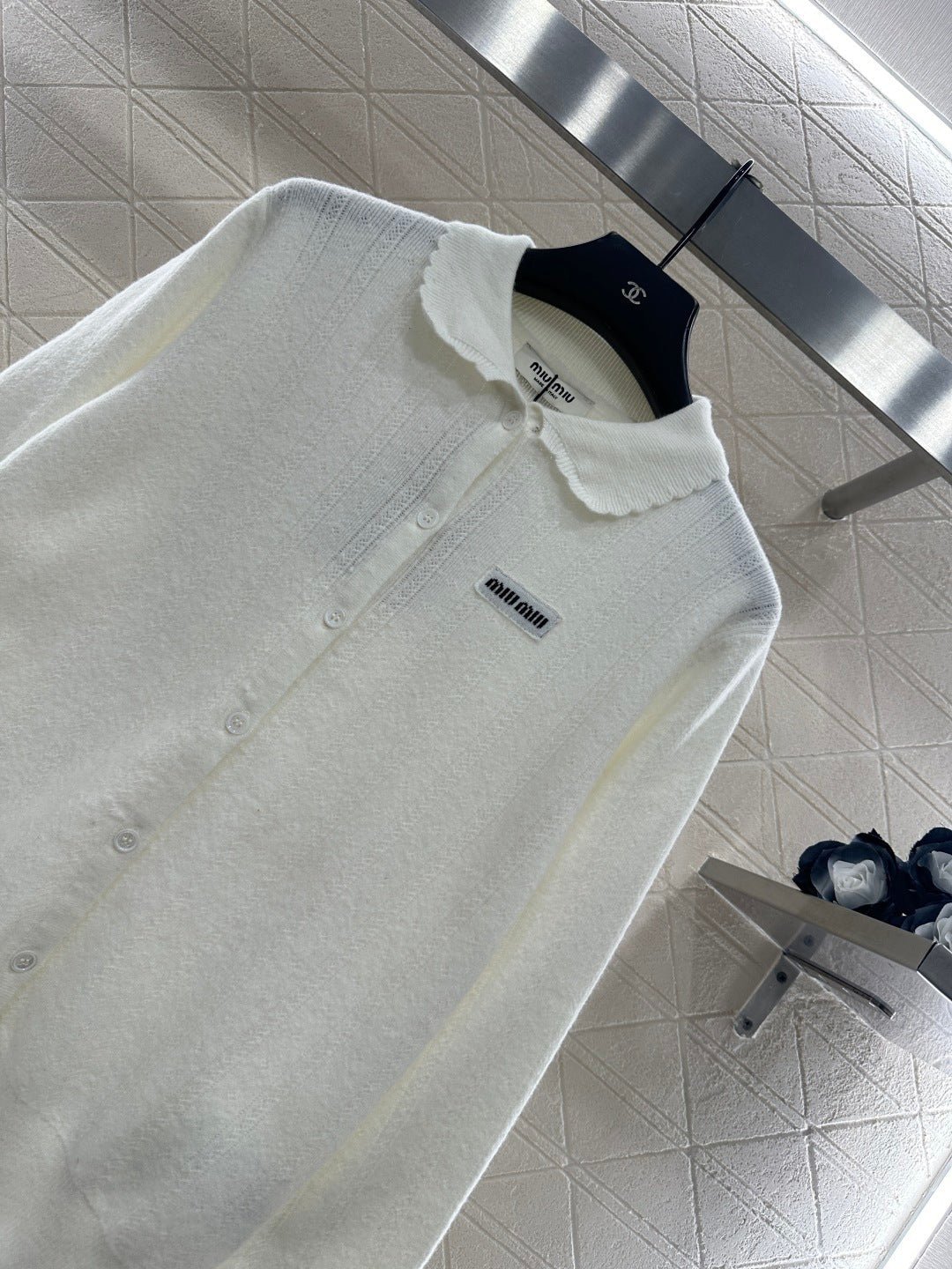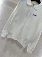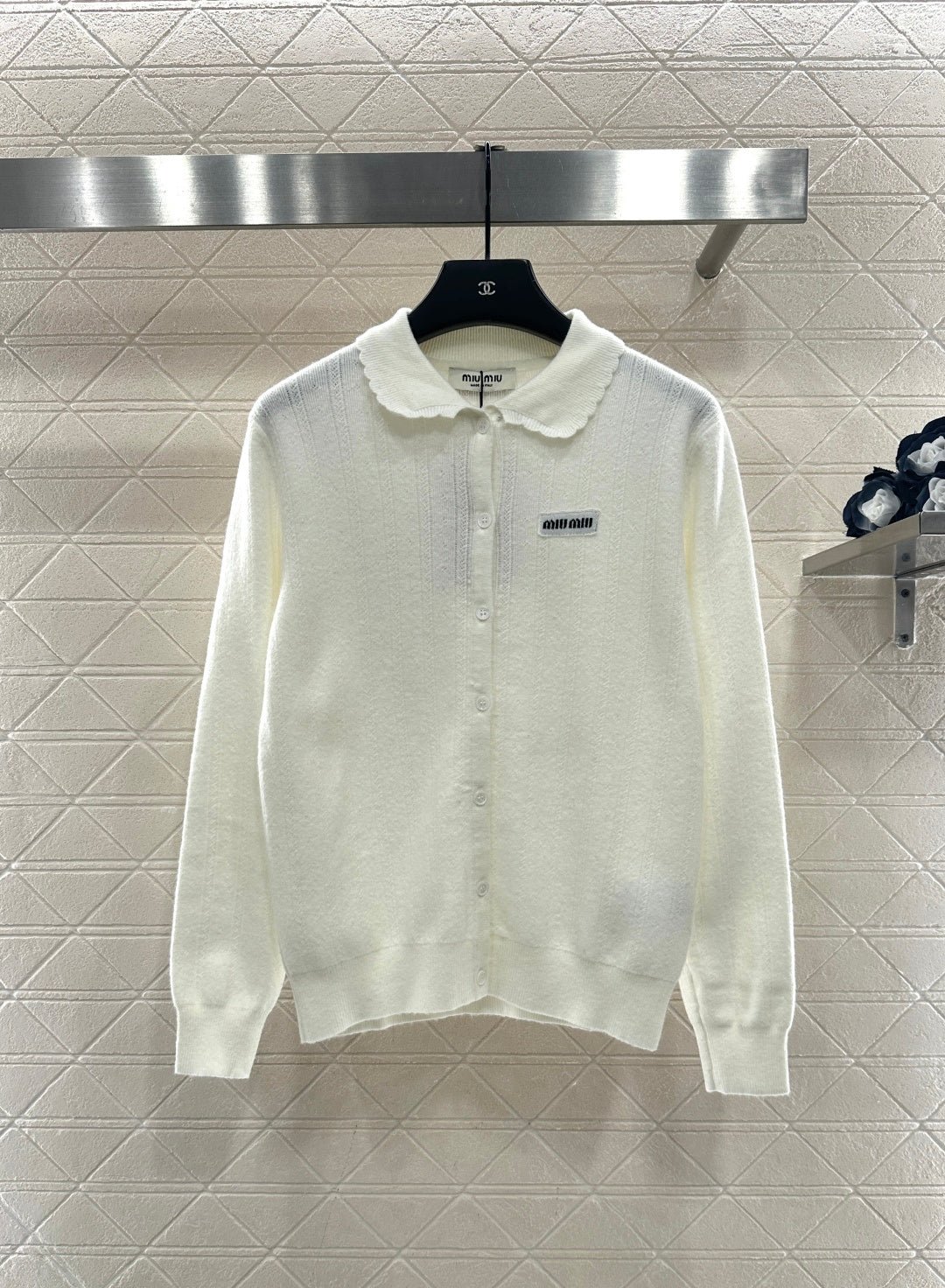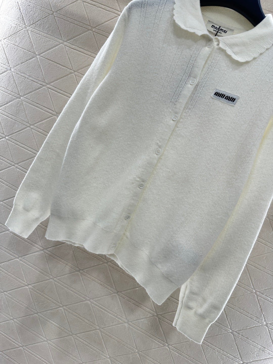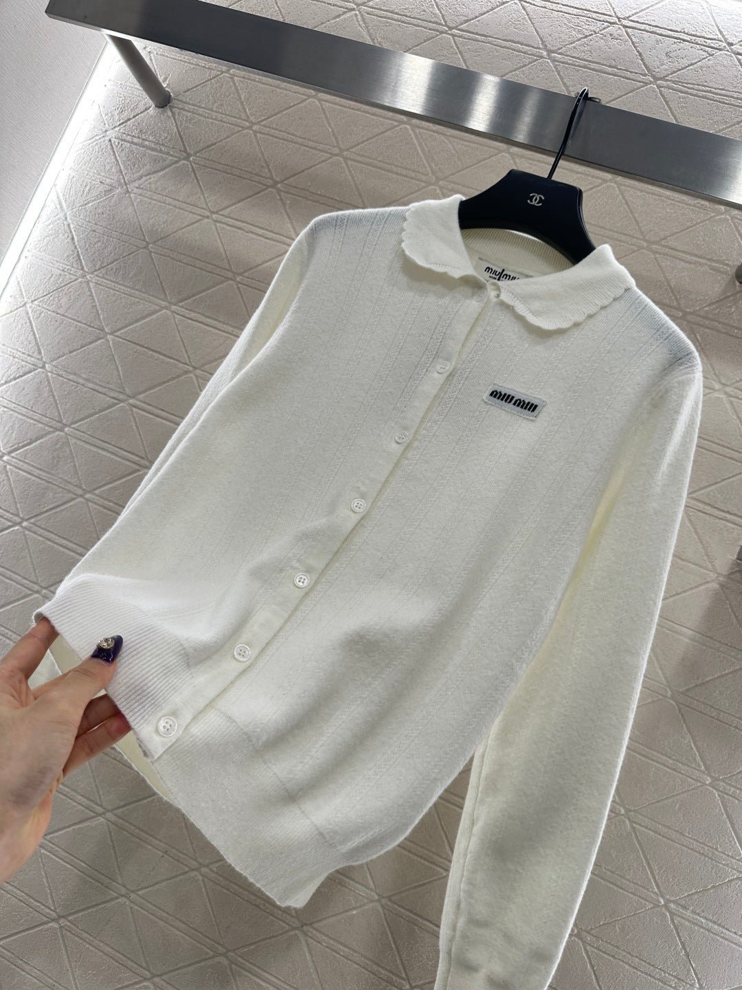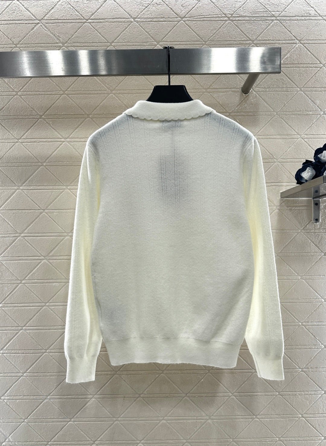 Crafted from cashmere yarn, this high-quality cardigan boasts a luxurious feel and exceptional softness. Featuring a turn-down collar, button closure, and a wavy lace trim around the collar, it exudes a sophisticated and refined look. Vertical ribbed detailing with subtle openwork creates a delicate texture, while ribbed cuffs further enhance the exquisite details. A logo embellishment on the chest adds a touch of sophistication and style, resulting in a fresh and youthful appearance.