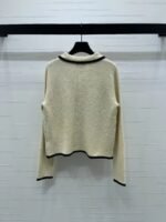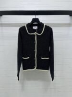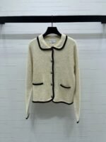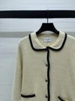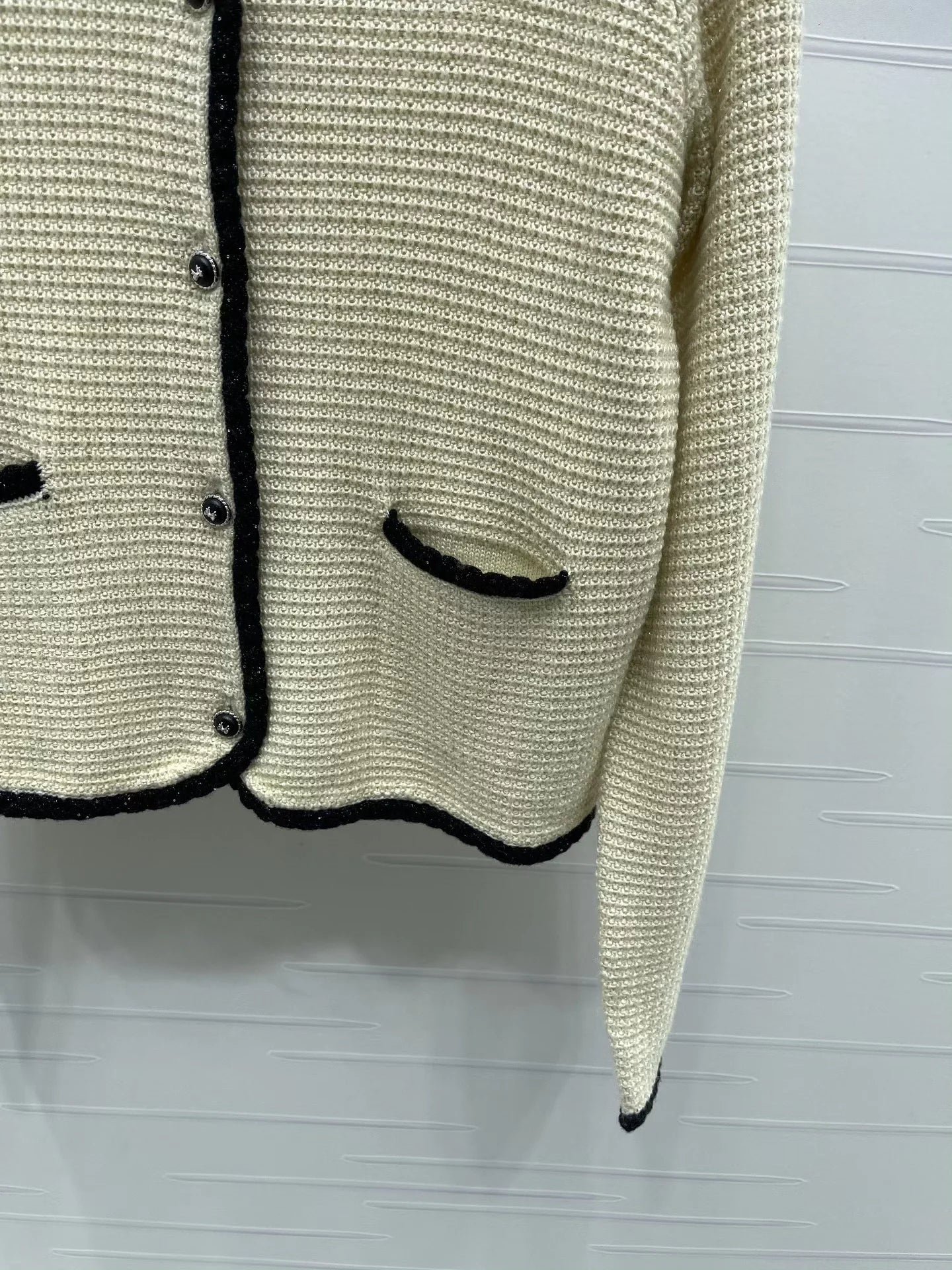 Made from imported wool knitwear, this cardigan boasts a distinct texture and superior quality. The lapel design features an all-over sequined finish, accented with contrasting woven trim that defines the silhouette and enhances the overall design, exuding luxury without sacrificing elegance. Round buttons highlight a sophisticated, refined taste, making this a stylish and elegant piece!