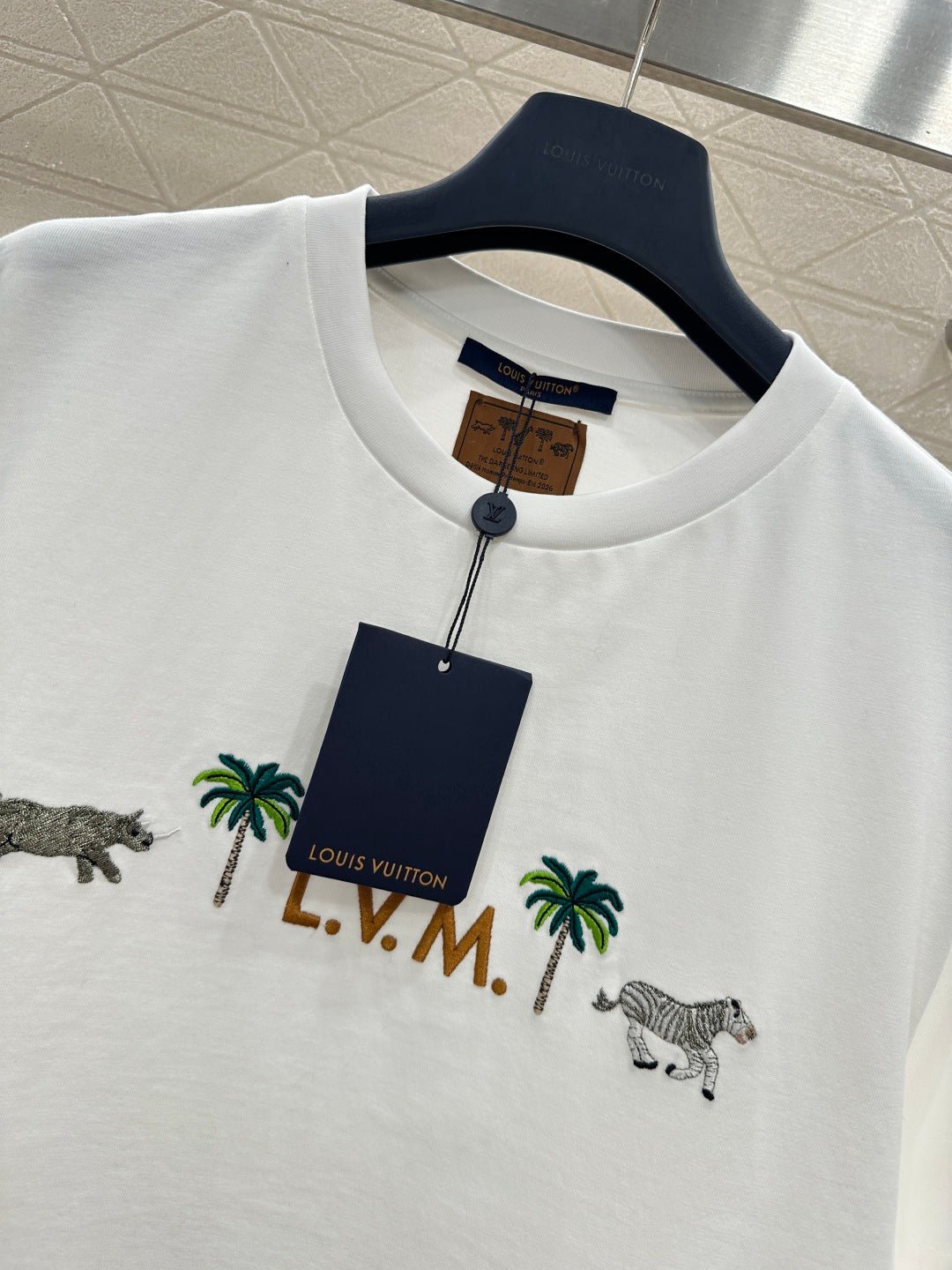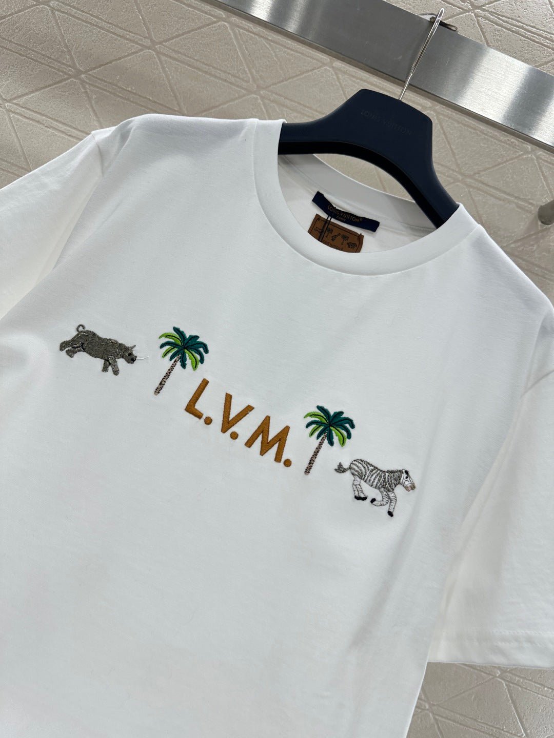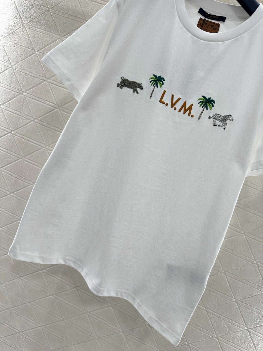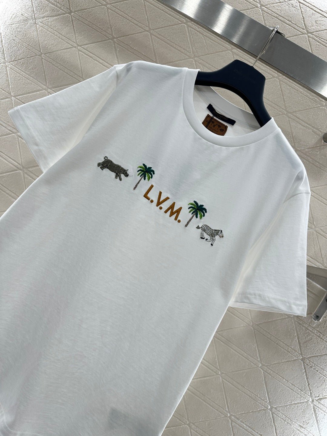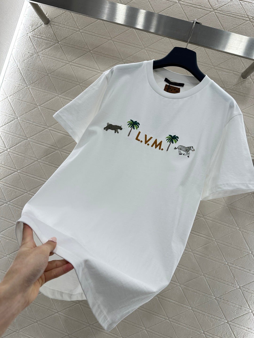 Made of 100% cotton, this high-quality, soft, and comfortable T-shirt features a relaxed, round neck design. The pure white color is refreshing and versatile. The zebra and palm tree embroidery on the chest, paired with lettering, adds a playful tropical vacation vibe. The delicate and exquisite embroidery craftsmanship reveals the brand’s thoughtful touches. The soft, stretchy fabric is gentle on the skin, and the loose fit flatters all body types. Wear it alone for a vibrant, casual look, or layer it with a denim jacket or cardigan for a relaxed street style – a truly eye-catching outfit.