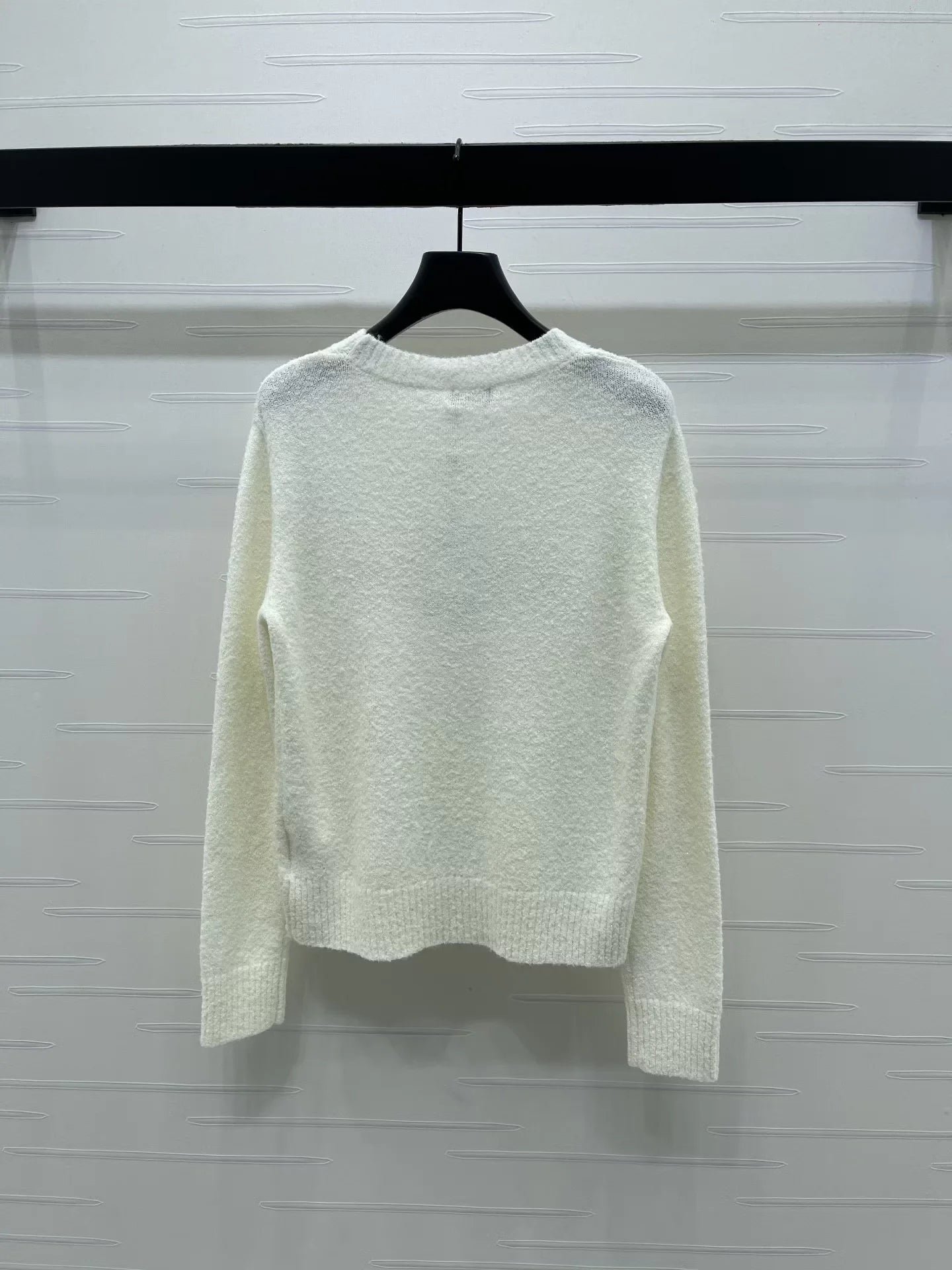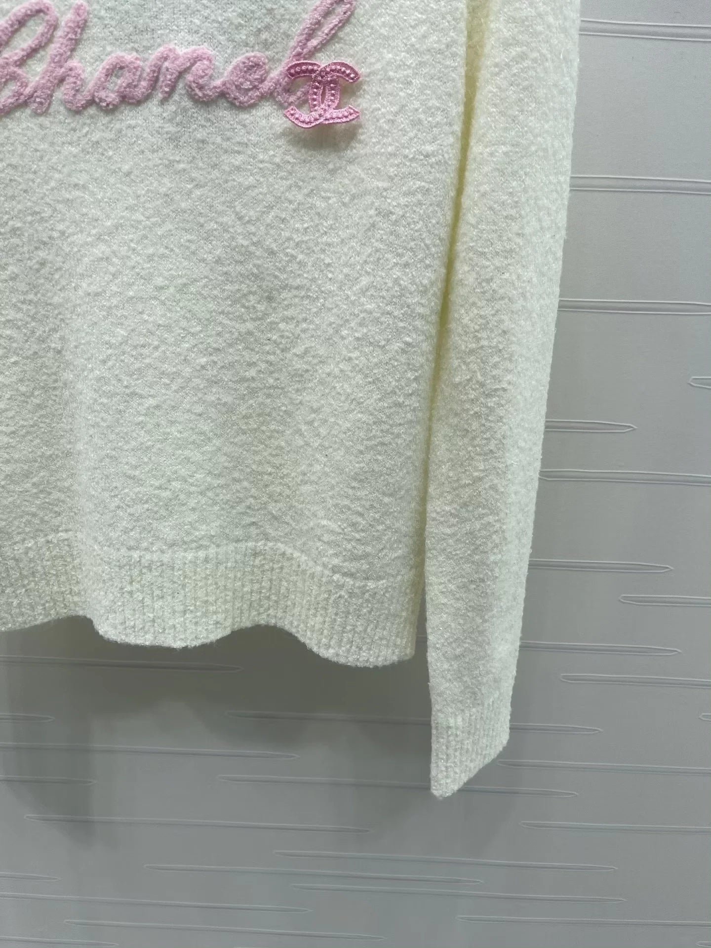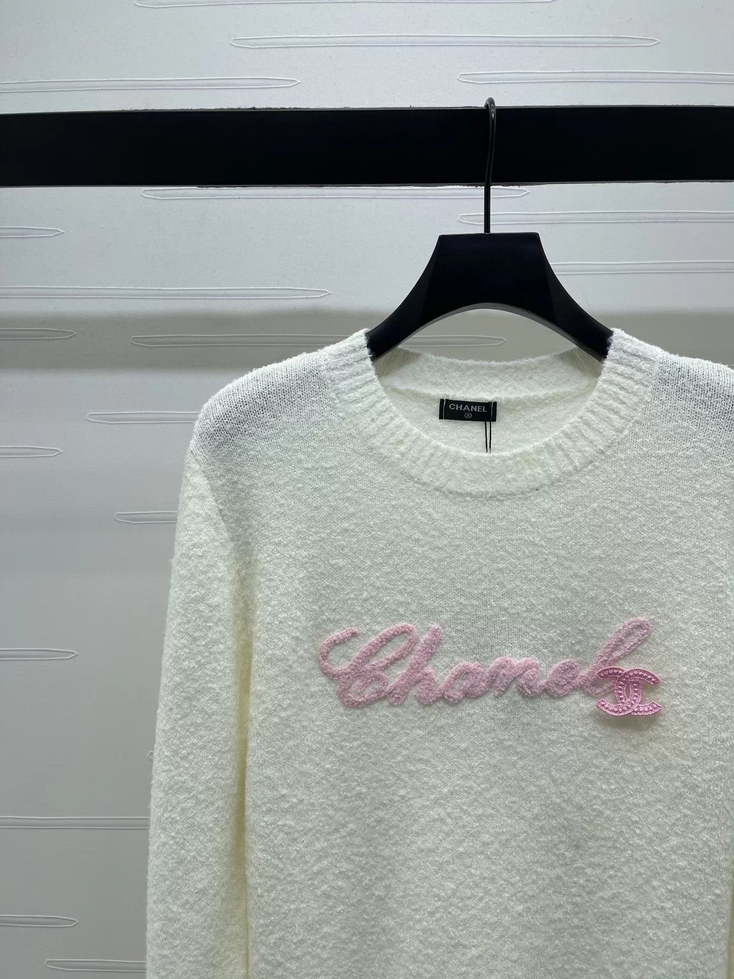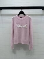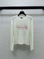 Made from wool yarn, this high-quality sweater boasts a premium feel and a clear wool texture. The round neck and long sleeves feature a tightly knit design for warmth and wind protection. Wide ribbed trim at the neckline and cuffs echoes the hem. A three-dimensional embroidered logo outlining cursive lettering adorns the chest, creating a futuristic yet playful fashion statement. This sweater exudes a sophisticated and stylish vibe. It features a classic, structured shoulder fit.