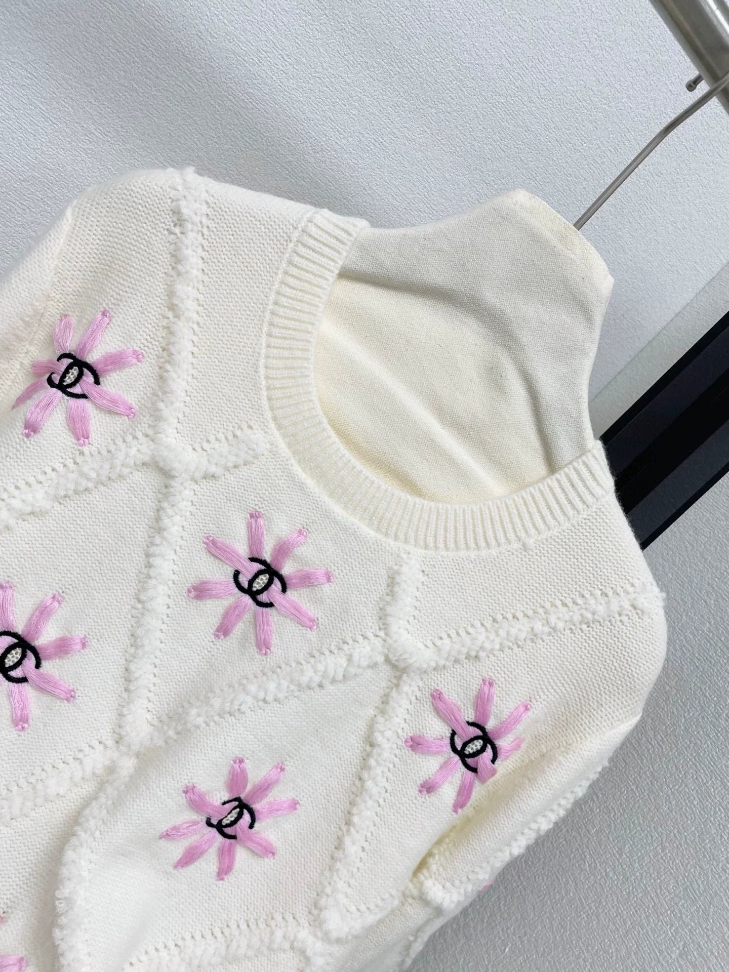 Embroidered with pink daisies on the chest, featuring a diamond grid texture design, exquisite and elegant