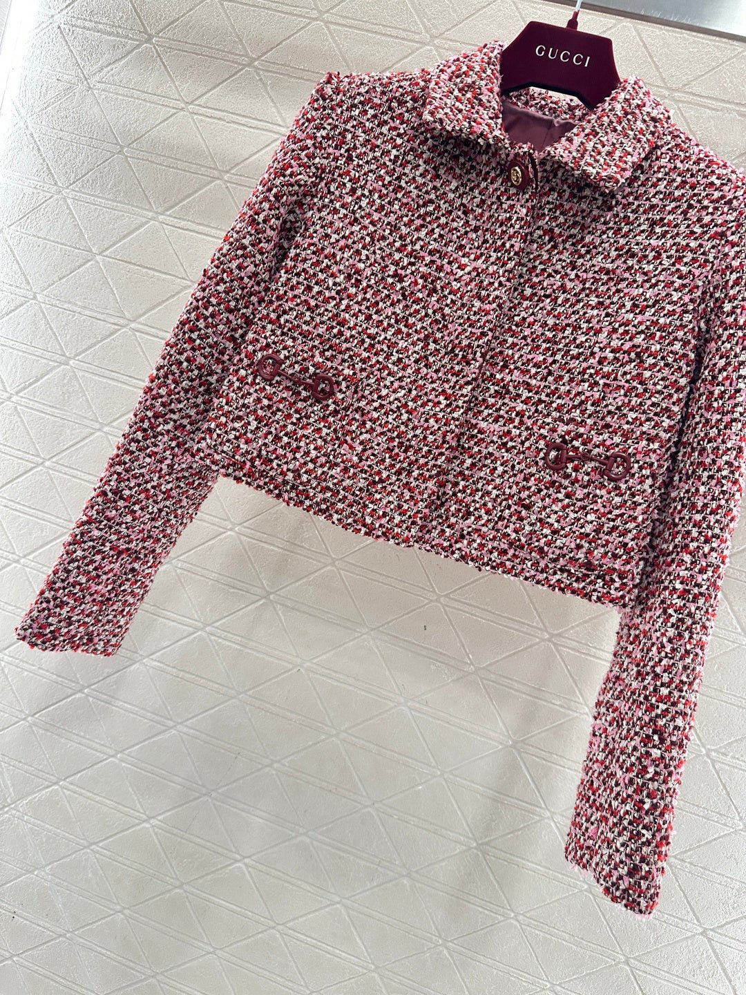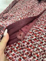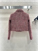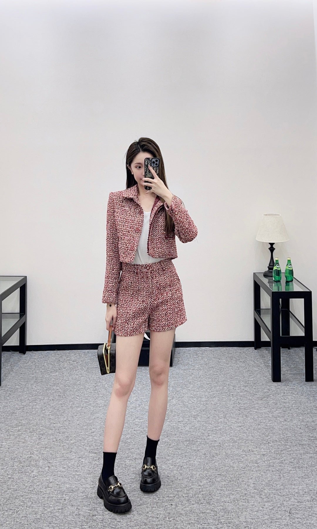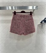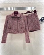 Made of coarse wool tweed, this set boasts a luxurious feel and impeccable quality. The collared, structured-shoulder short jacket and shorts set features a textured, mixed-color tweed fabric. The cropped top is sleek and tailored to flatter the figure, while the horsebit pockets add a touch of sophistication. Paired with matching shorts, it creates a playful and dynamic look. Wearing the set exudes a sophisticated, elegant vibe, while the individual pieces can be styled separately to unlock various French-inspired looks, all radiating charm.
