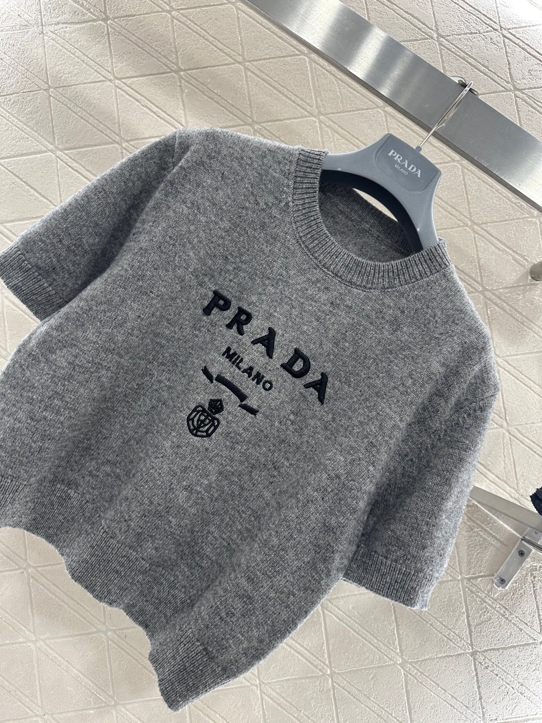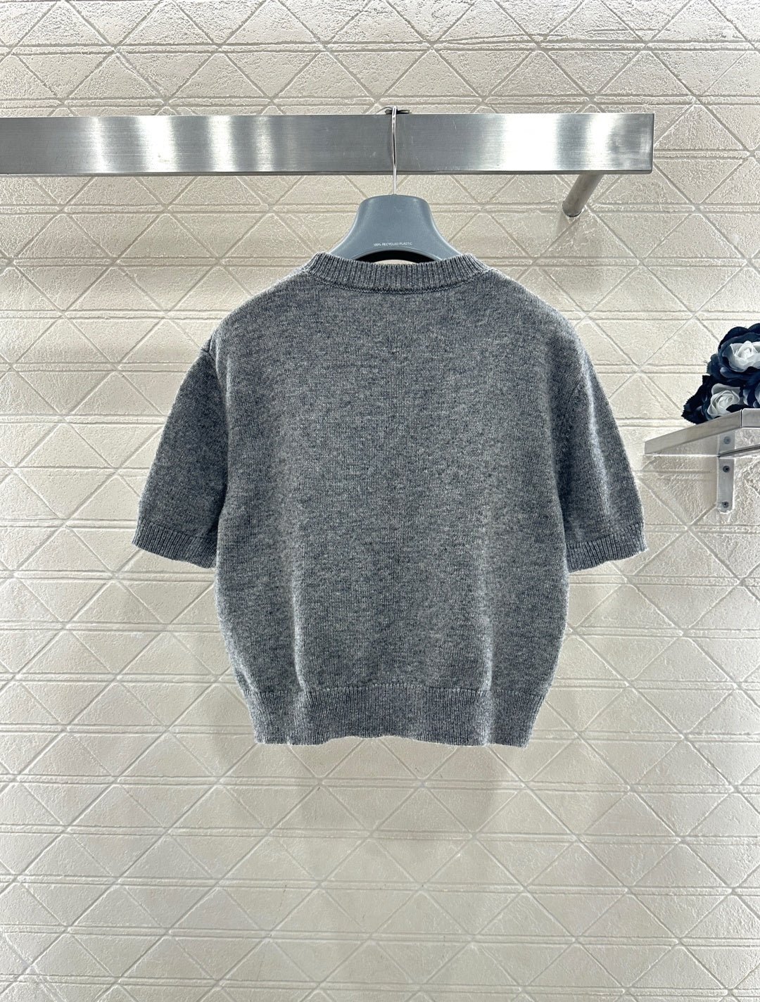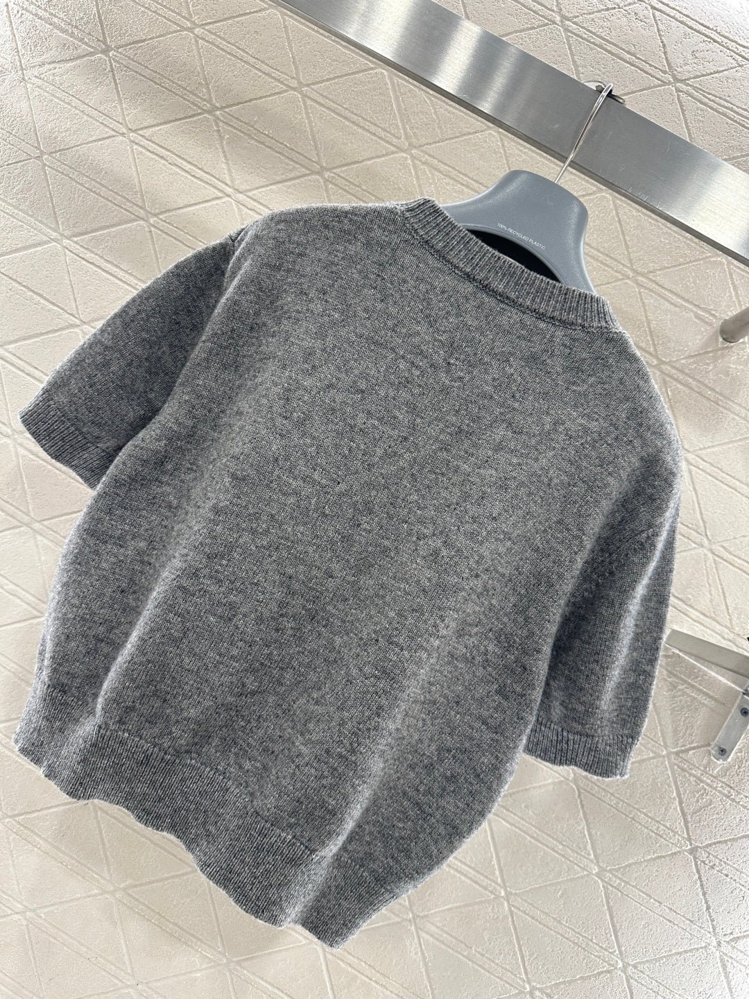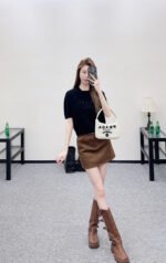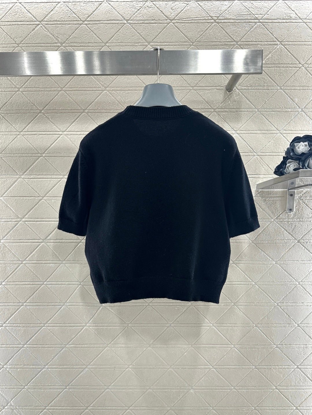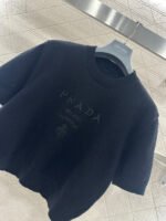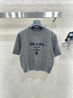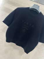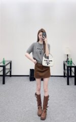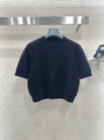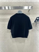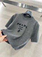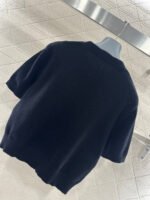Made from soft, skin-friendly wool yarn, this garment offers comfort and style. Featuring a round neck and short sleeves, it comes in a subtle gray for a gentle and understated look, and a cool, edgy black for a chic and sophisticated vibe. The brand’s lettering and badge embroidery on the chest subtly enhance its recognizability. The delicate wool knit fabric is soft, stretchy, and gentle on the skin. The cropped design elongates the legs and flatters the figure, while the basic round neck and short sleeves are universally flattering. It’s perfect for a clean, casual everyday look when worn alone, or layered under a blazer or cardigan for a more sophisticated and layered style. A truly versatile and luxurious basic, this garment is a must-have.