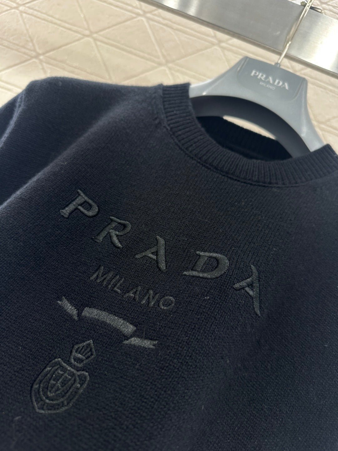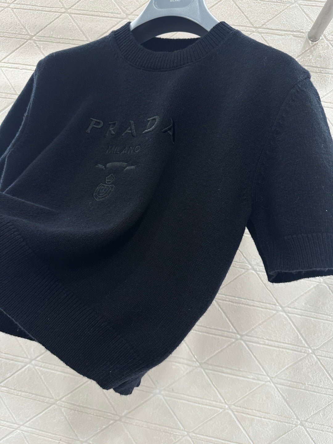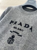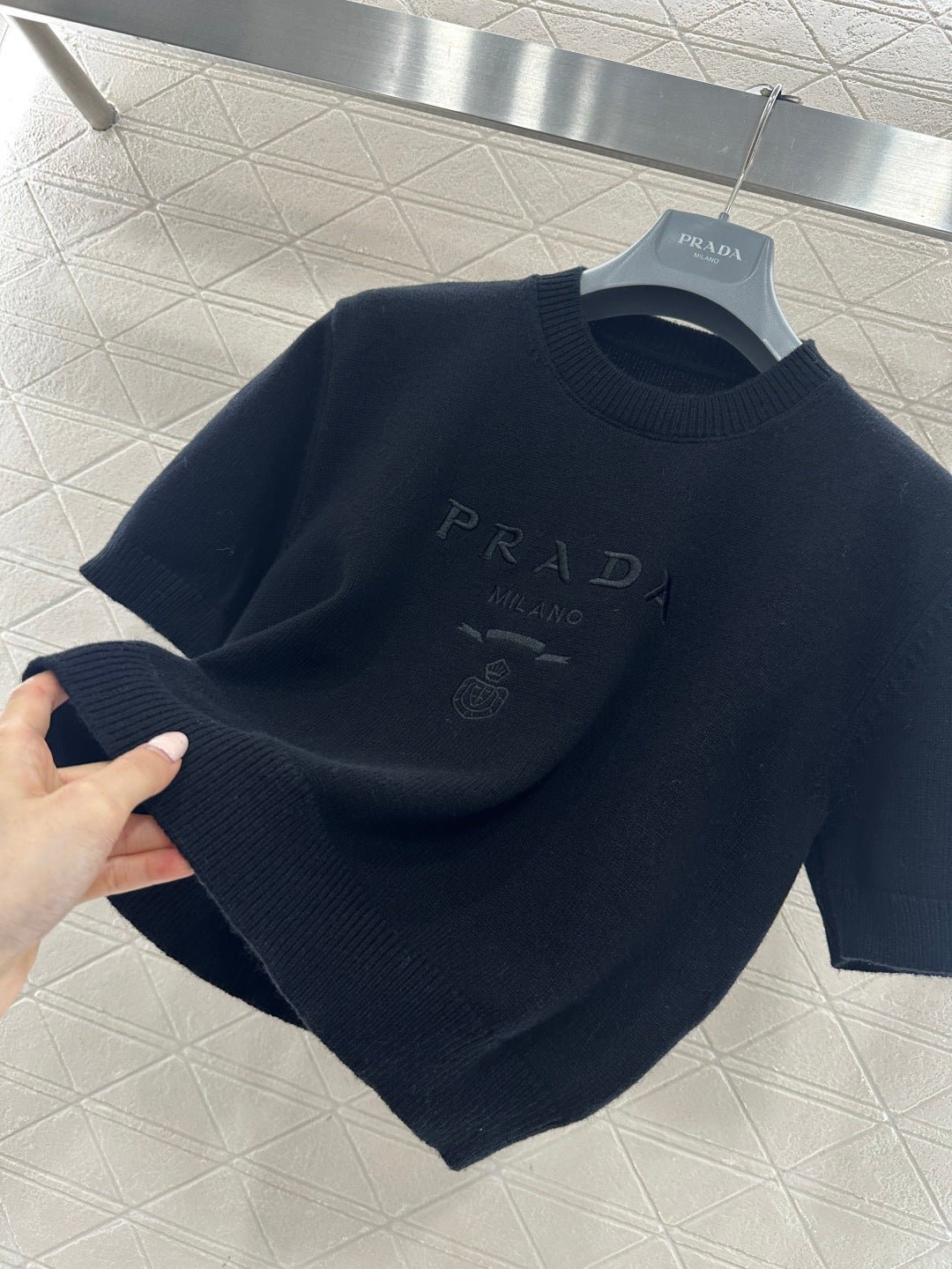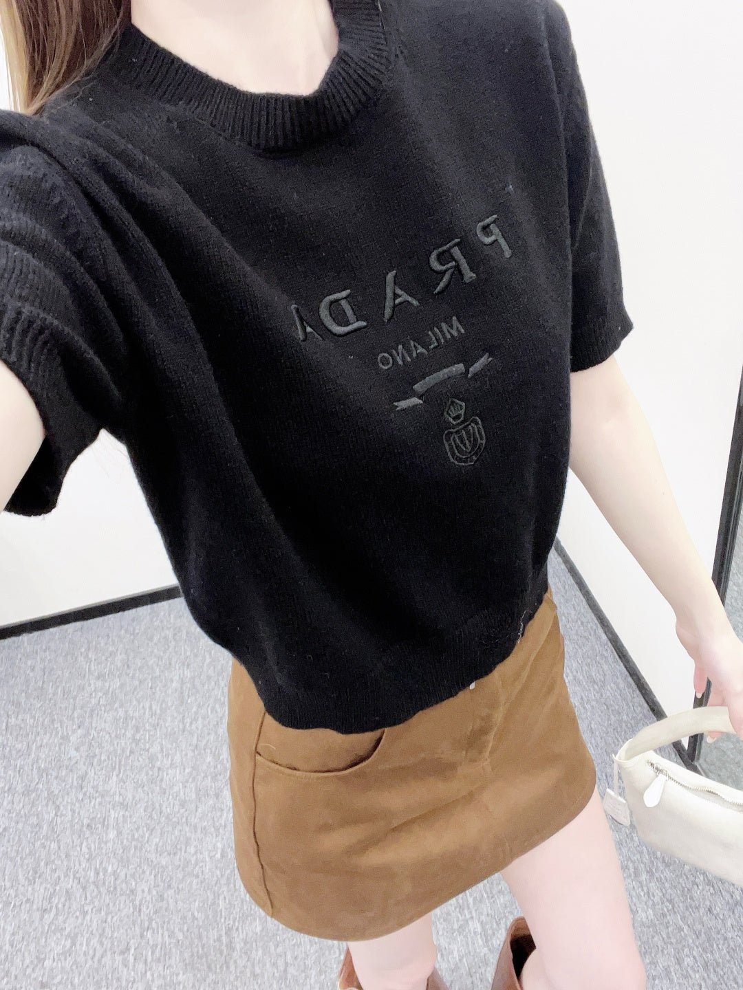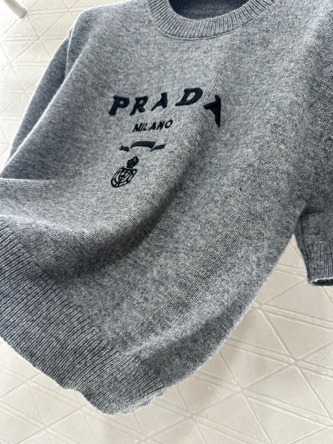 Made from soft, skin-friendly wool yarn, this garment offers comfort and style. Featuring a round neck and short sleeves, it comes in a subtle gray for a gentle and understated look, and a cool, edgy black for a chic and sophisticated vibe. The brand’s lettering and badge embroidery on the chest subtly enhance its recognizability. The delicate wool knit fabric is soft, stretchy, and gentle on the skin. The cropped design elongates the legs and flatters the figure, while the basic round neck and short sleeves are universally flattering. It’s perfect for a clean, casual everyday look when worn alone, or layered under a blazer or cardigan for a more sophisticated and layered style. A truly versatile and luxurious basic, this garment is a must-have.