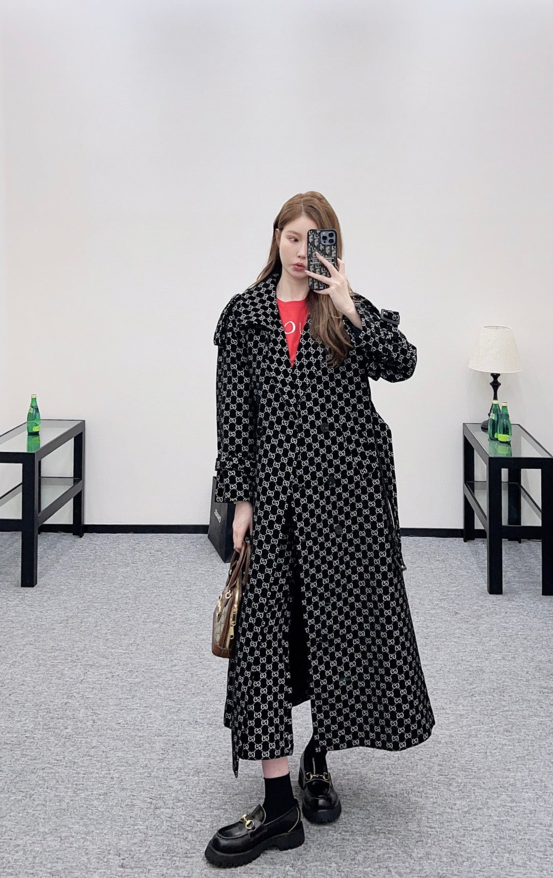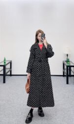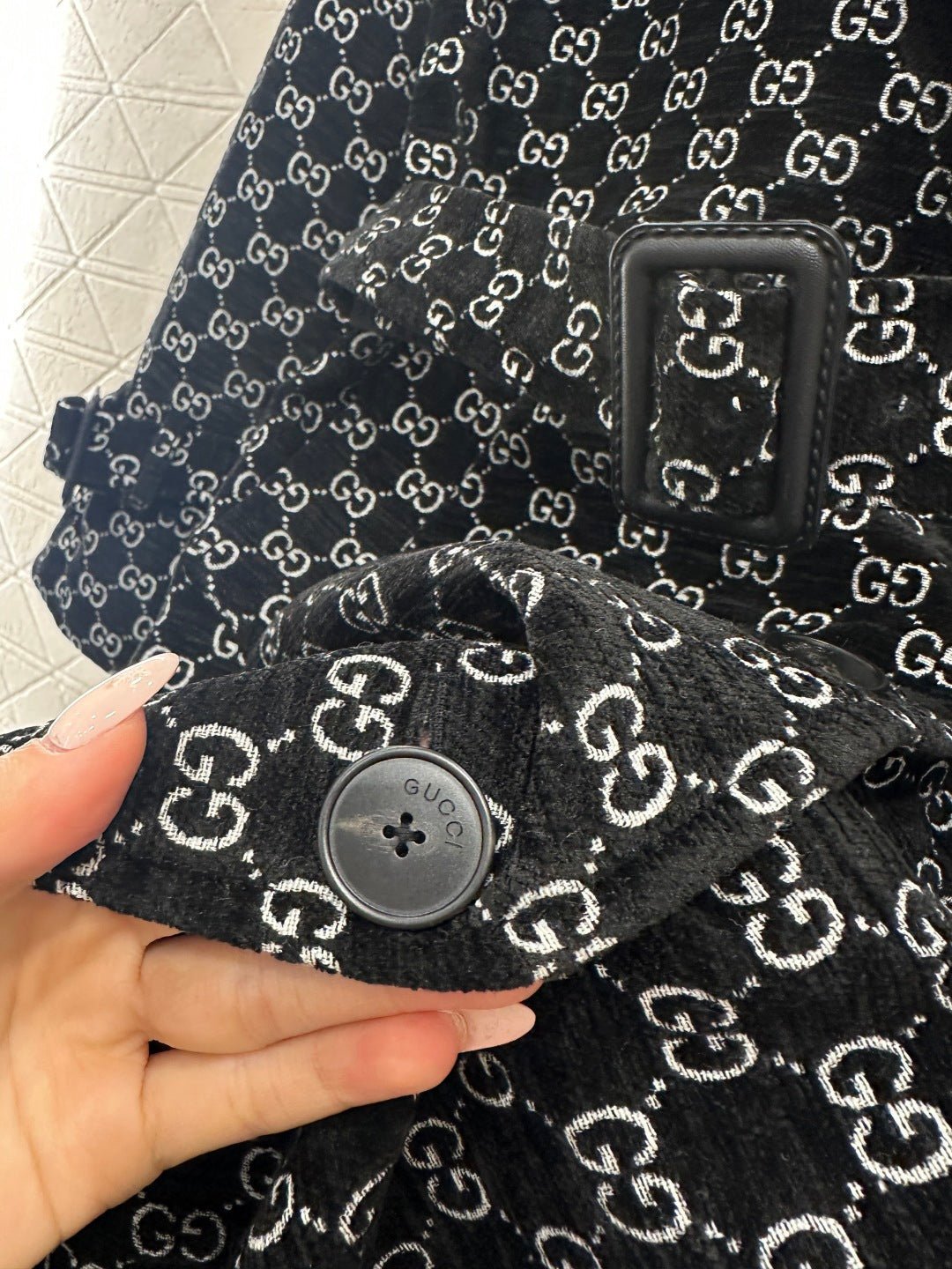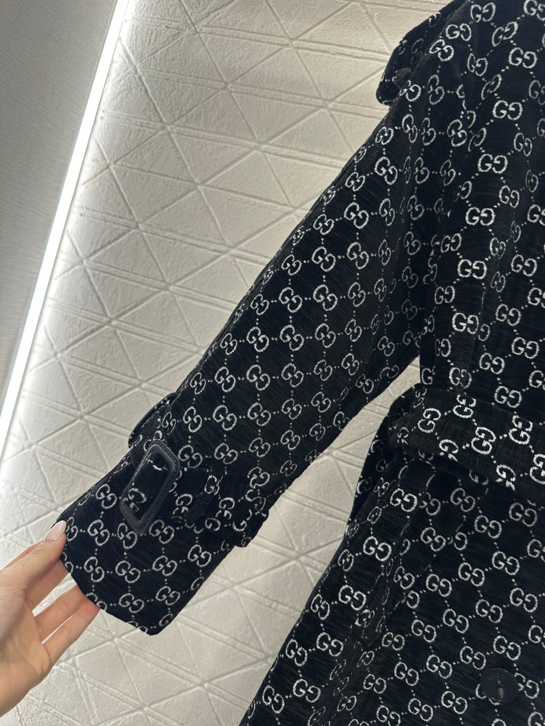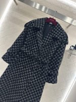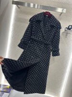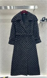 Made of jacquard fabric, this garment boasts exceptional quality and craftsmanship. Featuring a long, tailored coat with a turn-down collar and structured shoulders, it boasts a double-breasted design and a sophisticated, streamlined silhouette. Symmetrical buckles adorn the shoulders, while a matching fabric belt provides a sculpted waist. The double G jacquard pattern adds a touch of vintage elegance, showcasing the brand’s refined style. The mid-length hem with slits allows for graceful movement, creating a flattering and slimming effect. Versatile and suitable for various occasions, this coat exudes confidence and style.