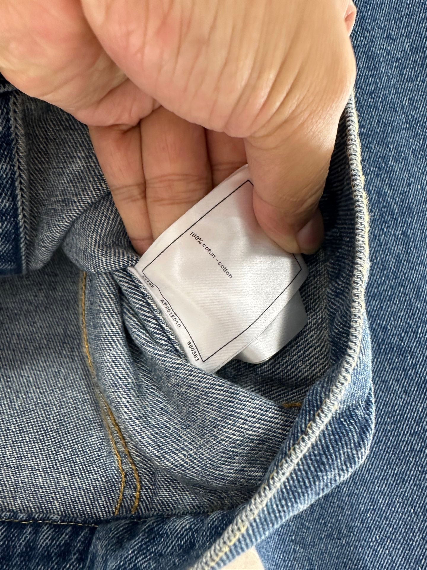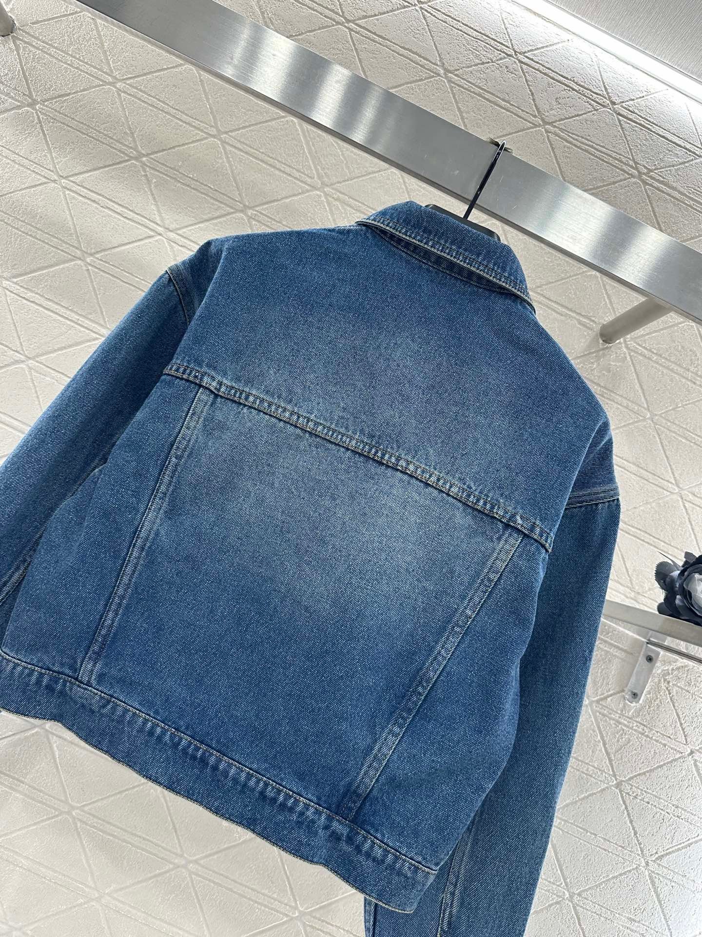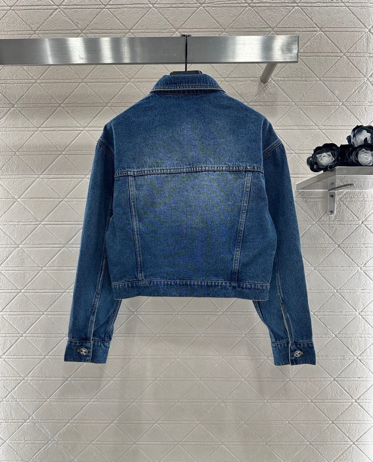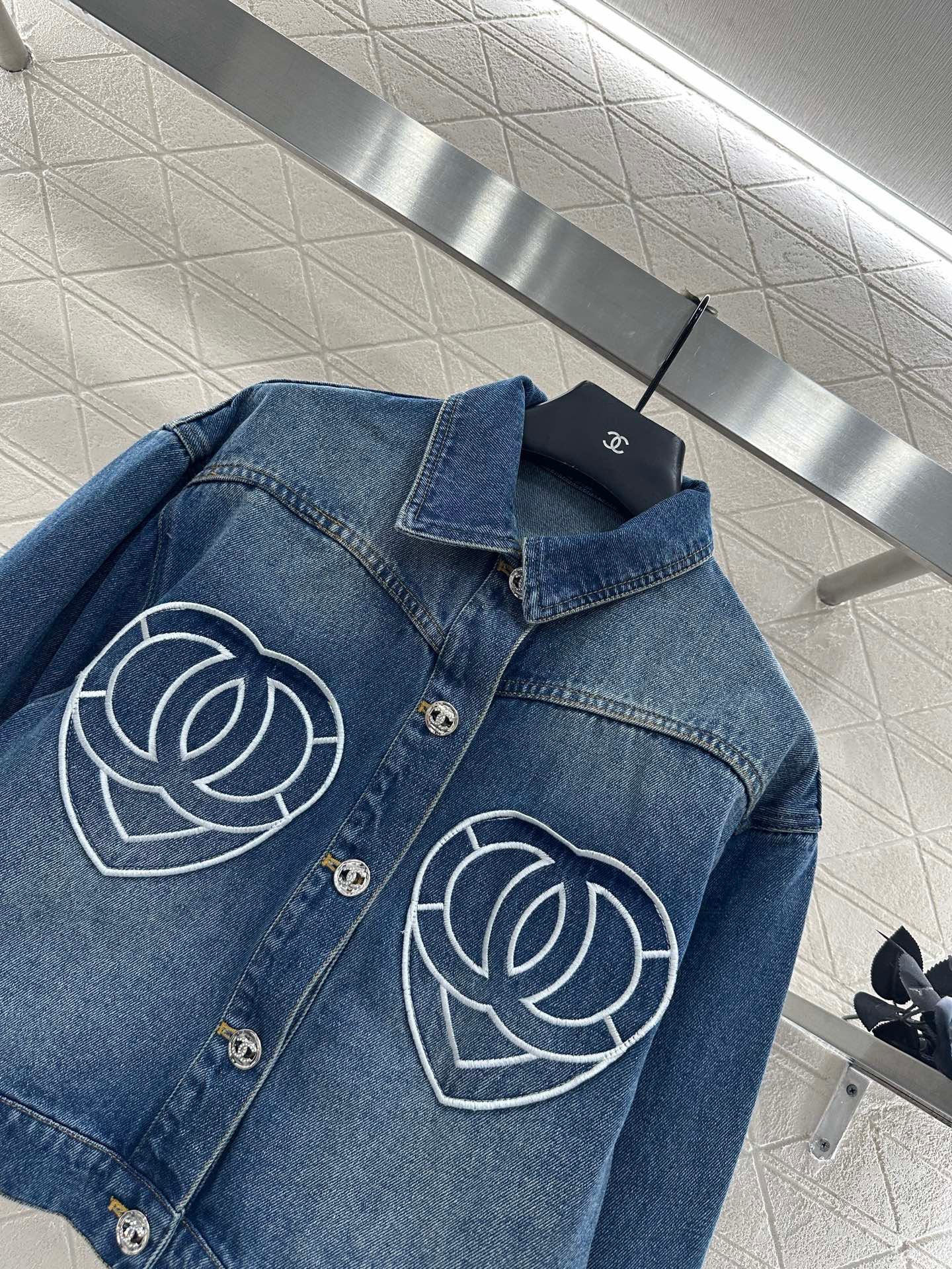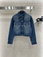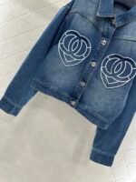 The twill cotton denim material is washed multiple times, presenting a crisp texture. The denim jacket is cut with a durable and high-end basic contour line, showing a white and dark blue color throughout the body. It is symmetrically embellished with a double C letter logo, highlighting the brand’s style. Embroidered and tied edges are used to create a heart-shaped pattern, highlighting a romantic and beautiful style. Paired with high waisted button wide leg pants of the same series, the heart-shaped double C echoes, and the brand’s high-end design is fully stretched. It is fashionable and eye-catching when worn as a set or alone, and can be worn all year round.