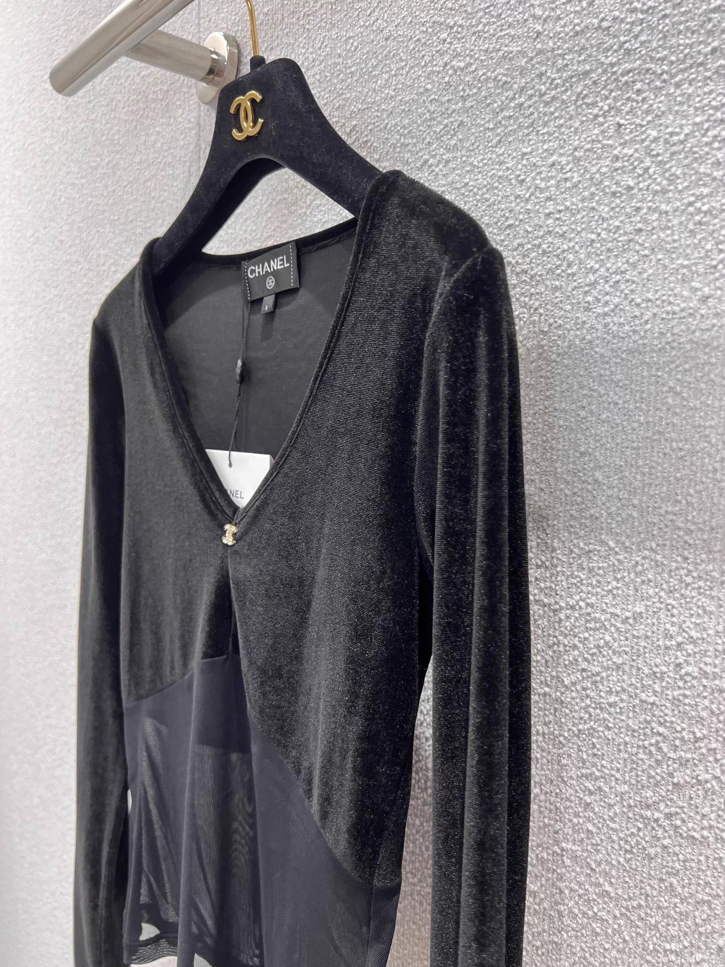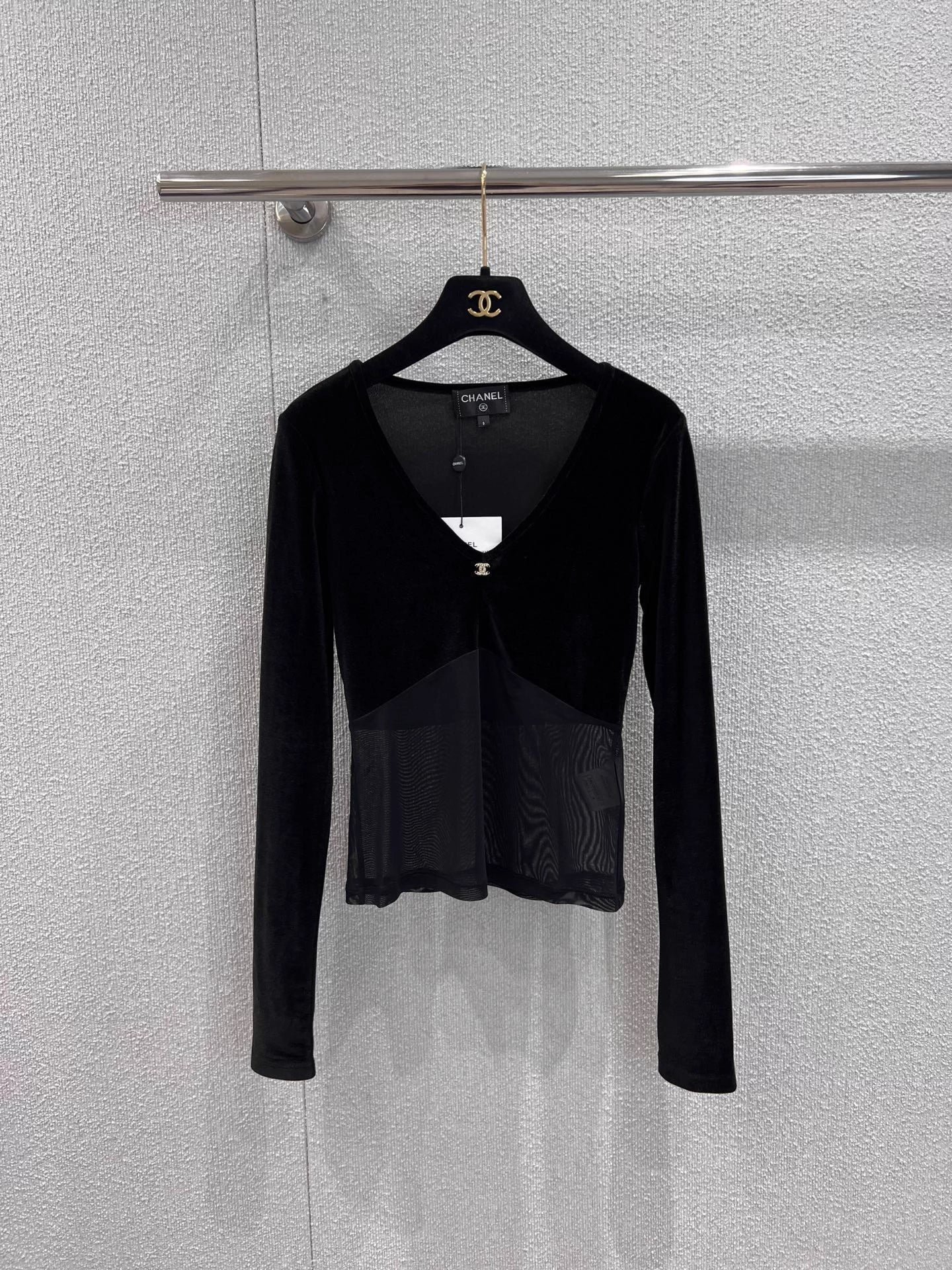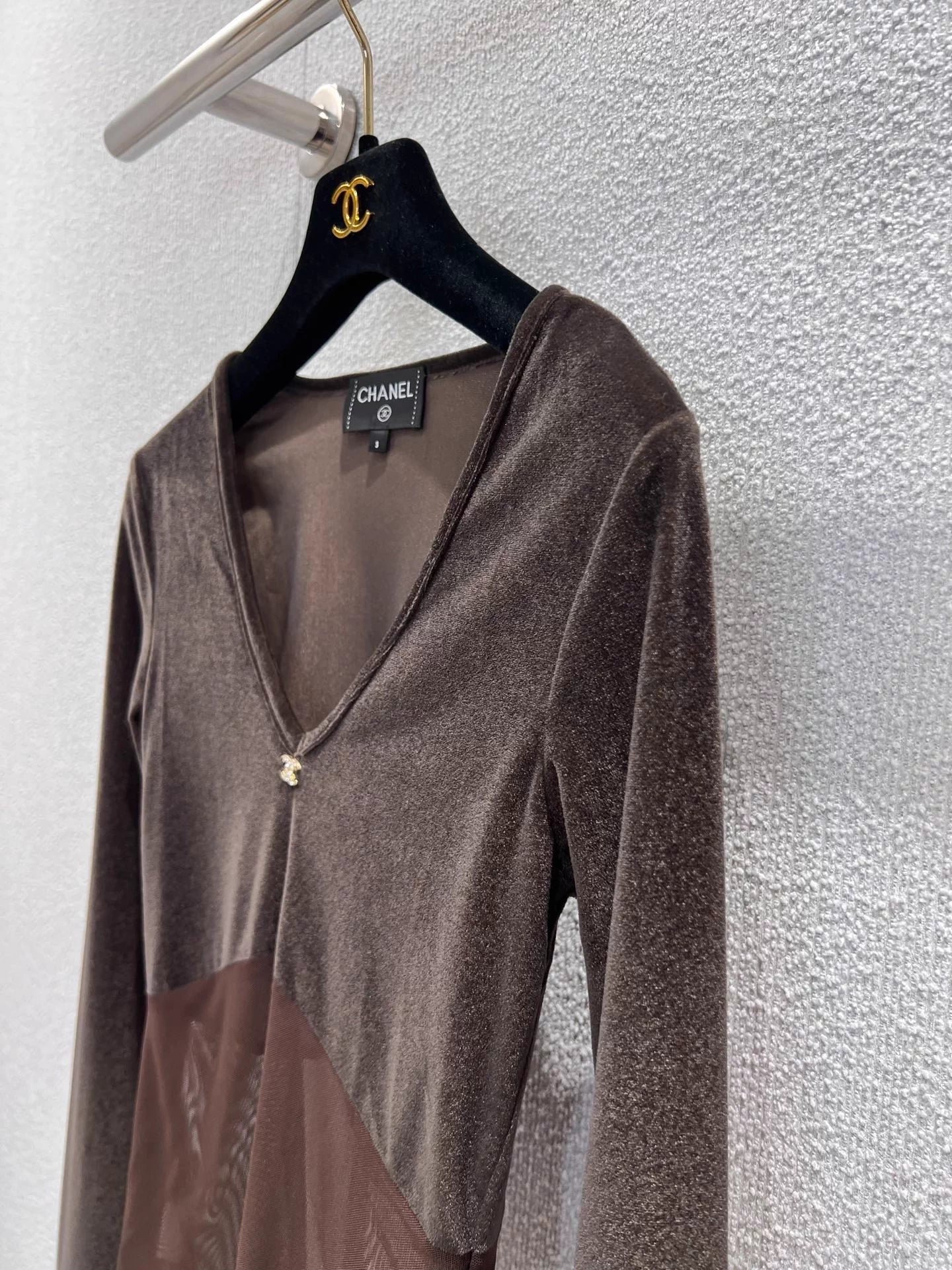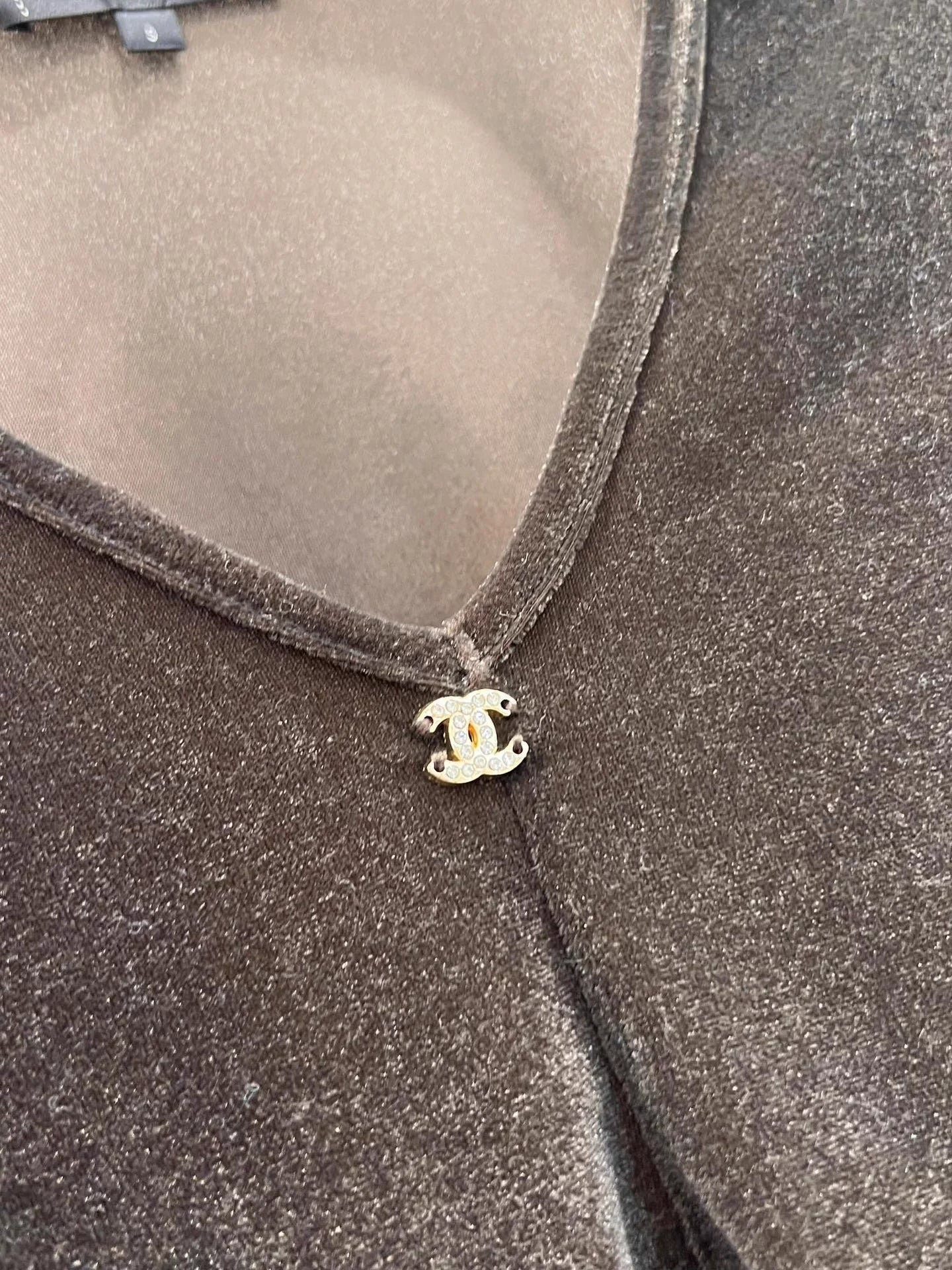 Small metallic logo embellishment, neckline details are impeccable