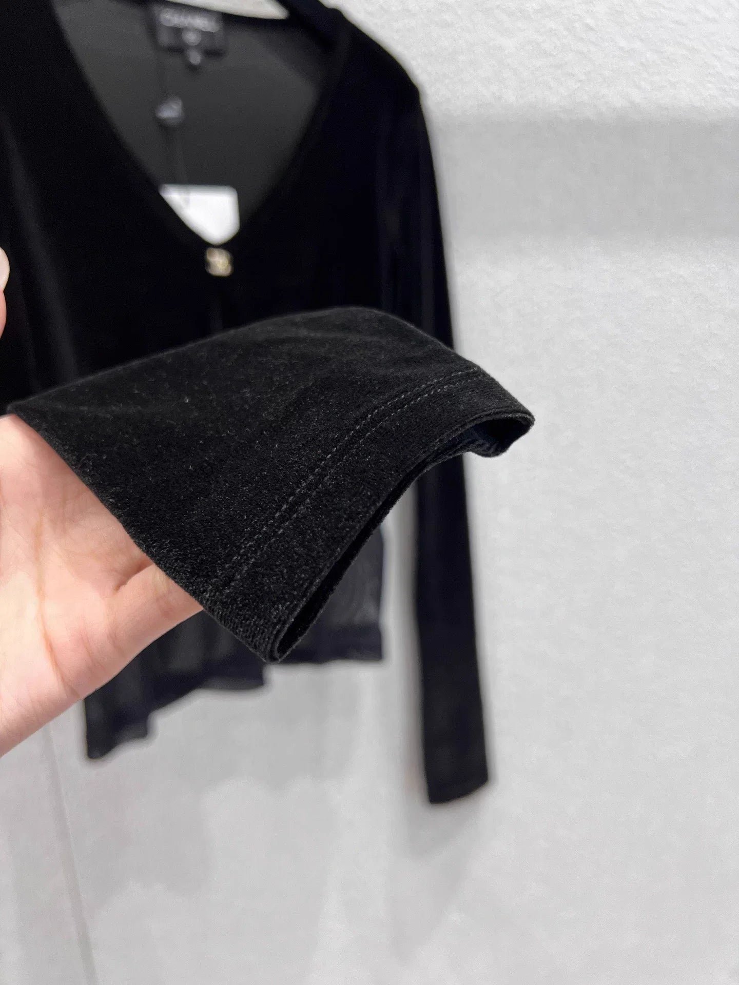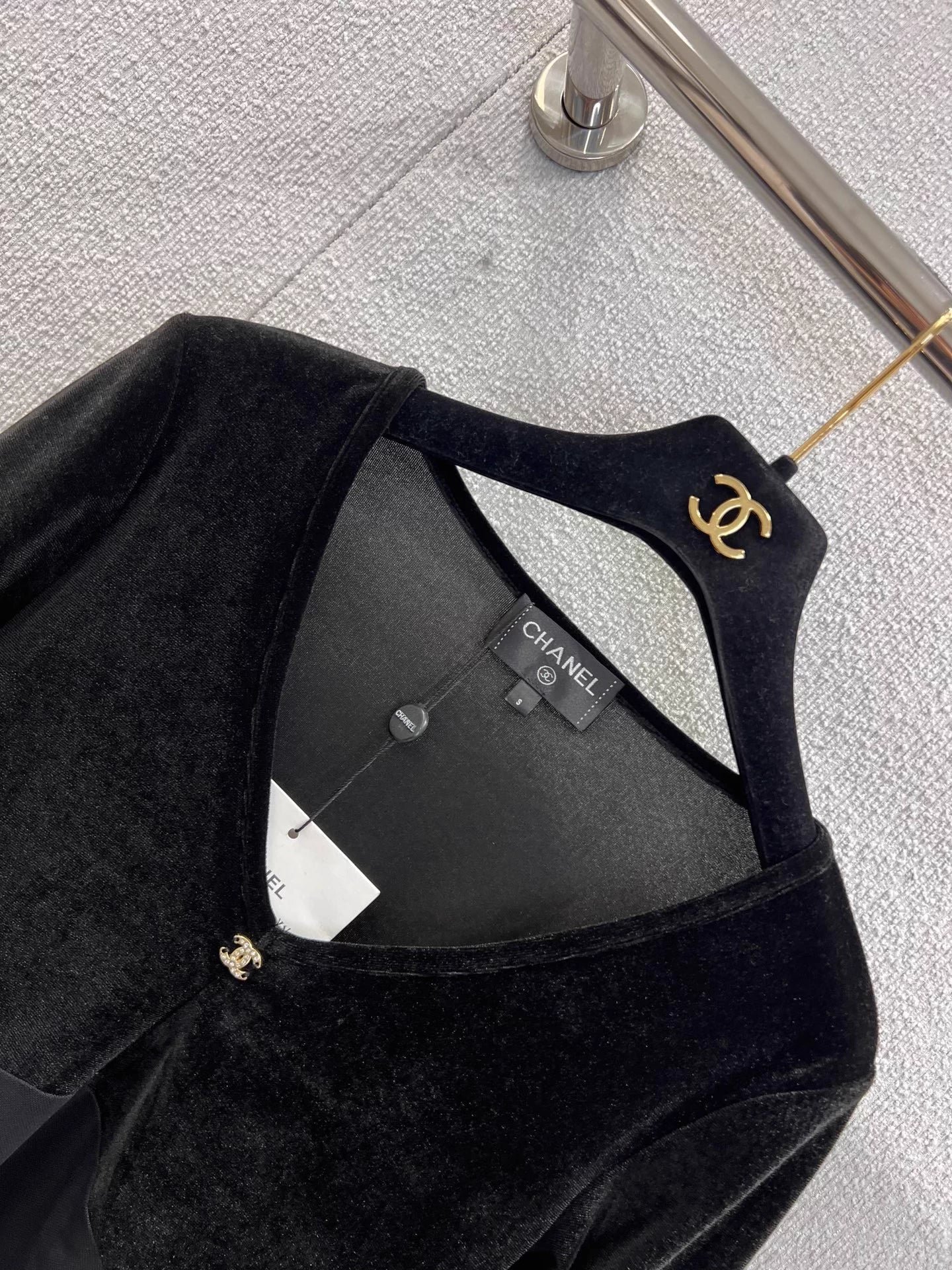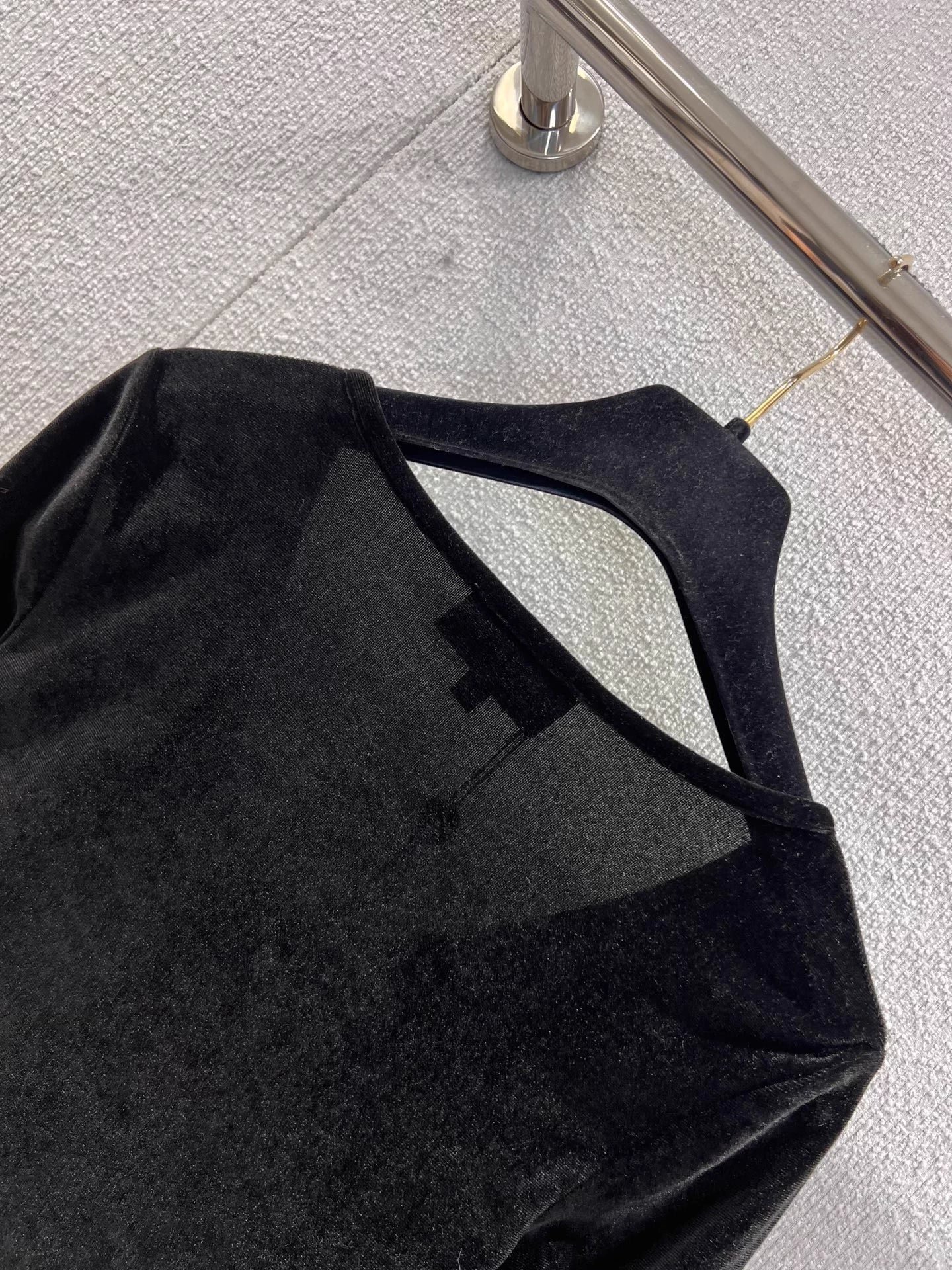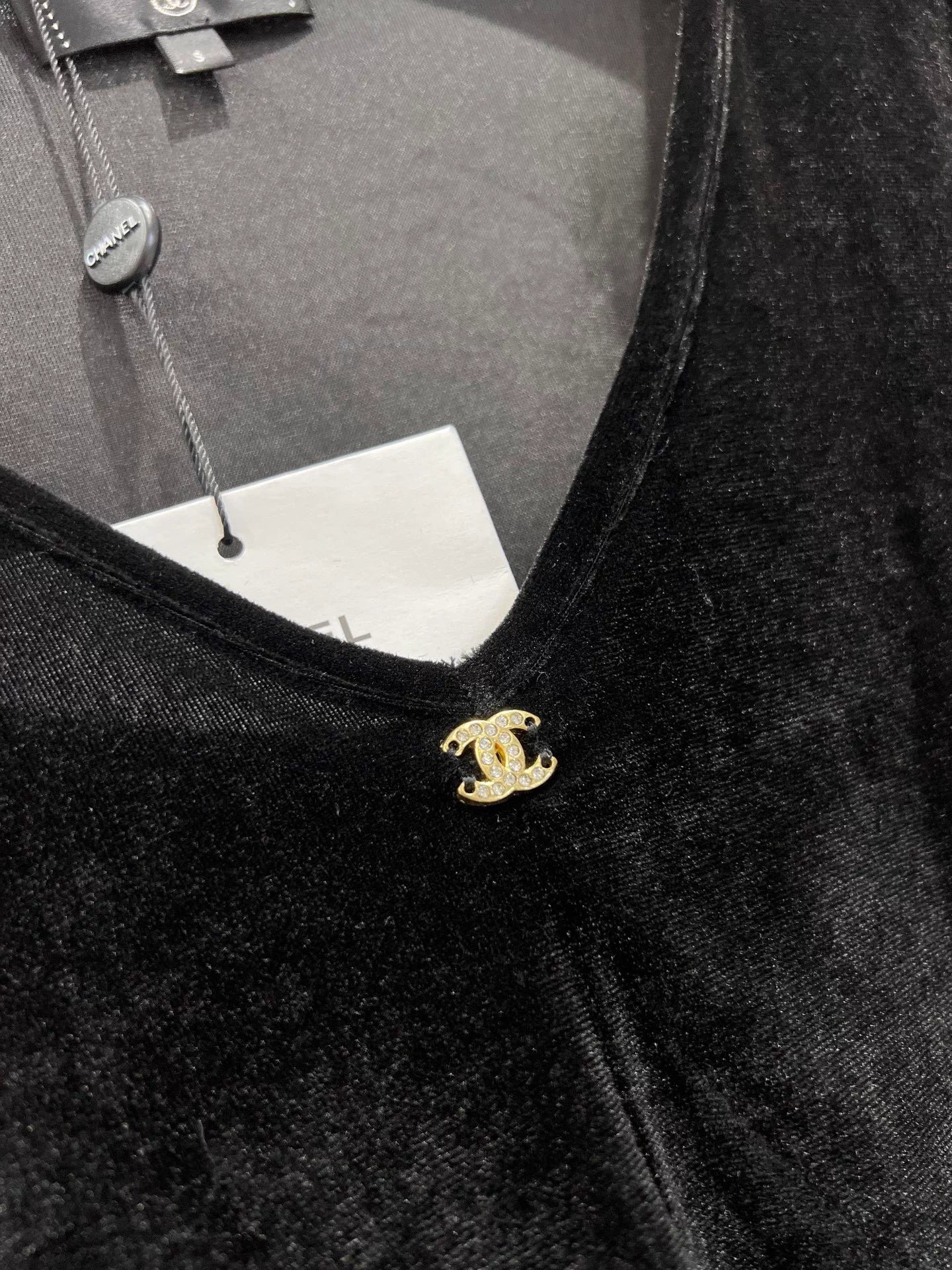 Small metallic logo embellishment, neckline details are impeccable