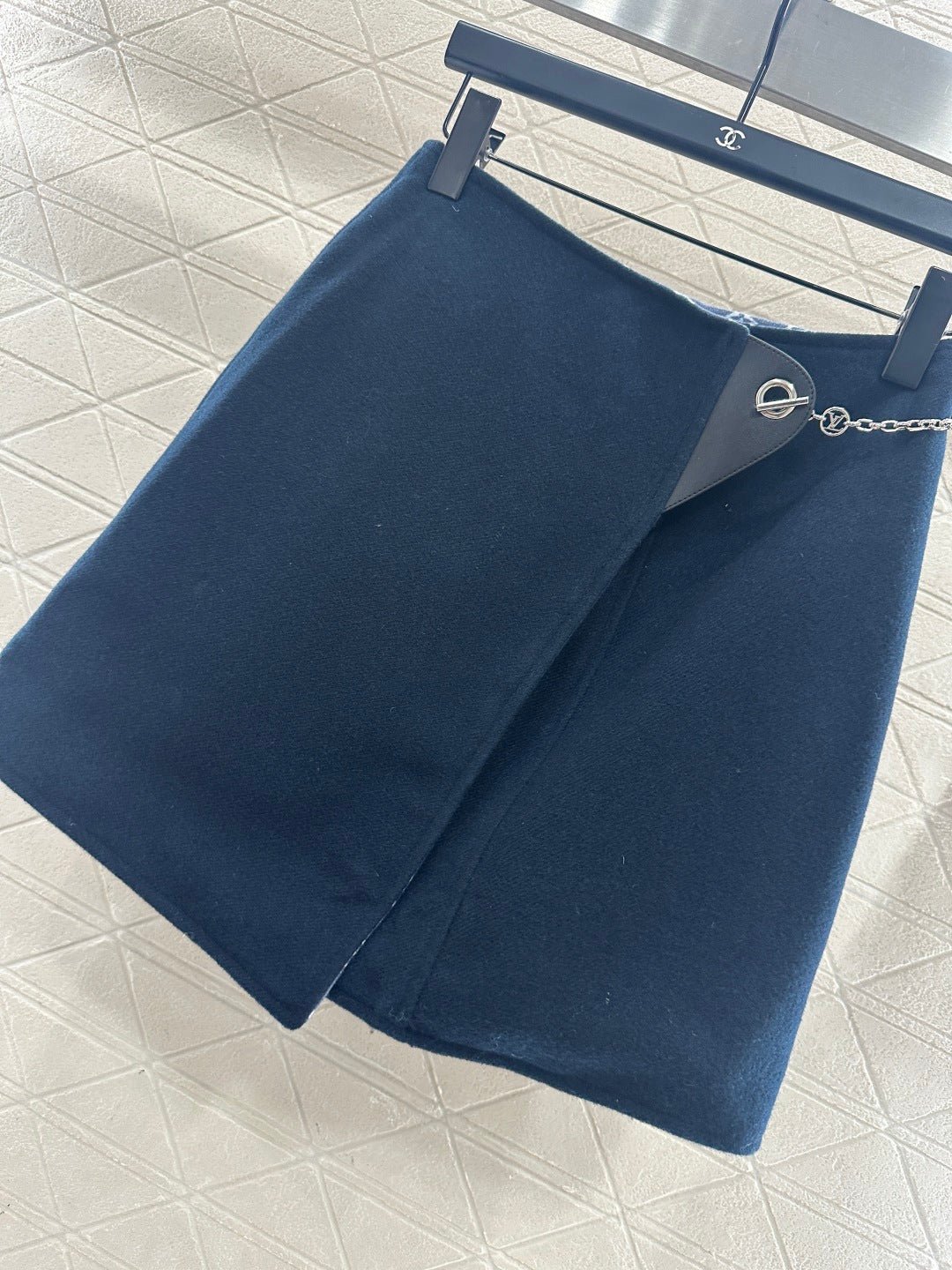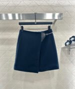 Made of premium wool, this high-quality, warm, and skin-friendly hooded short jacket features a versatile navy blue color with a leather label and metal buckle on the front. The lining is covered in a subtle four-leaf clover logo, adding a touch of understated elegance. The loose, short fit creates a relaxed, preppy look that’s both eye-catching and fashionable. Pair it with the matching A-line mini skirt from the same collection, featuring a leather-buckled, perforated chain closure for a one-piece front hem. The inner lining features a matching print. Whether worn alone or as a set, this jacket offers a chic and stylish look.