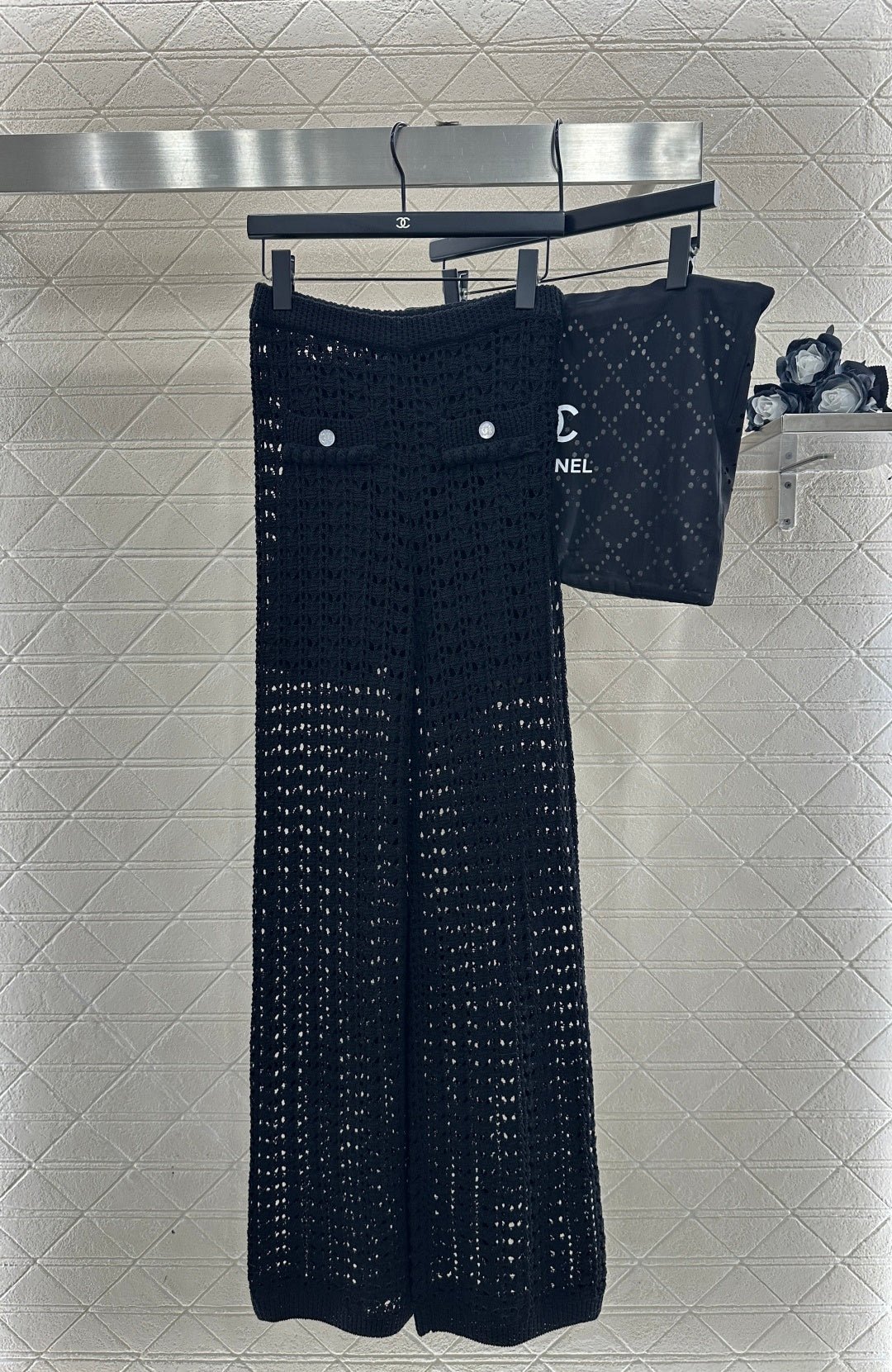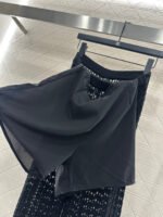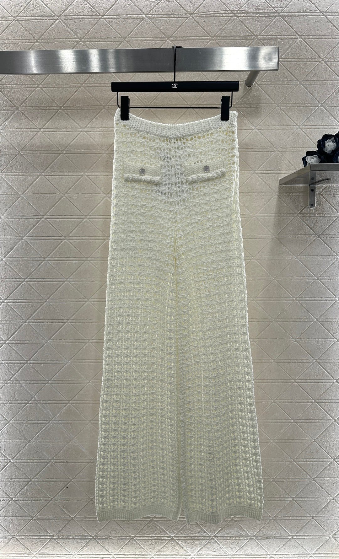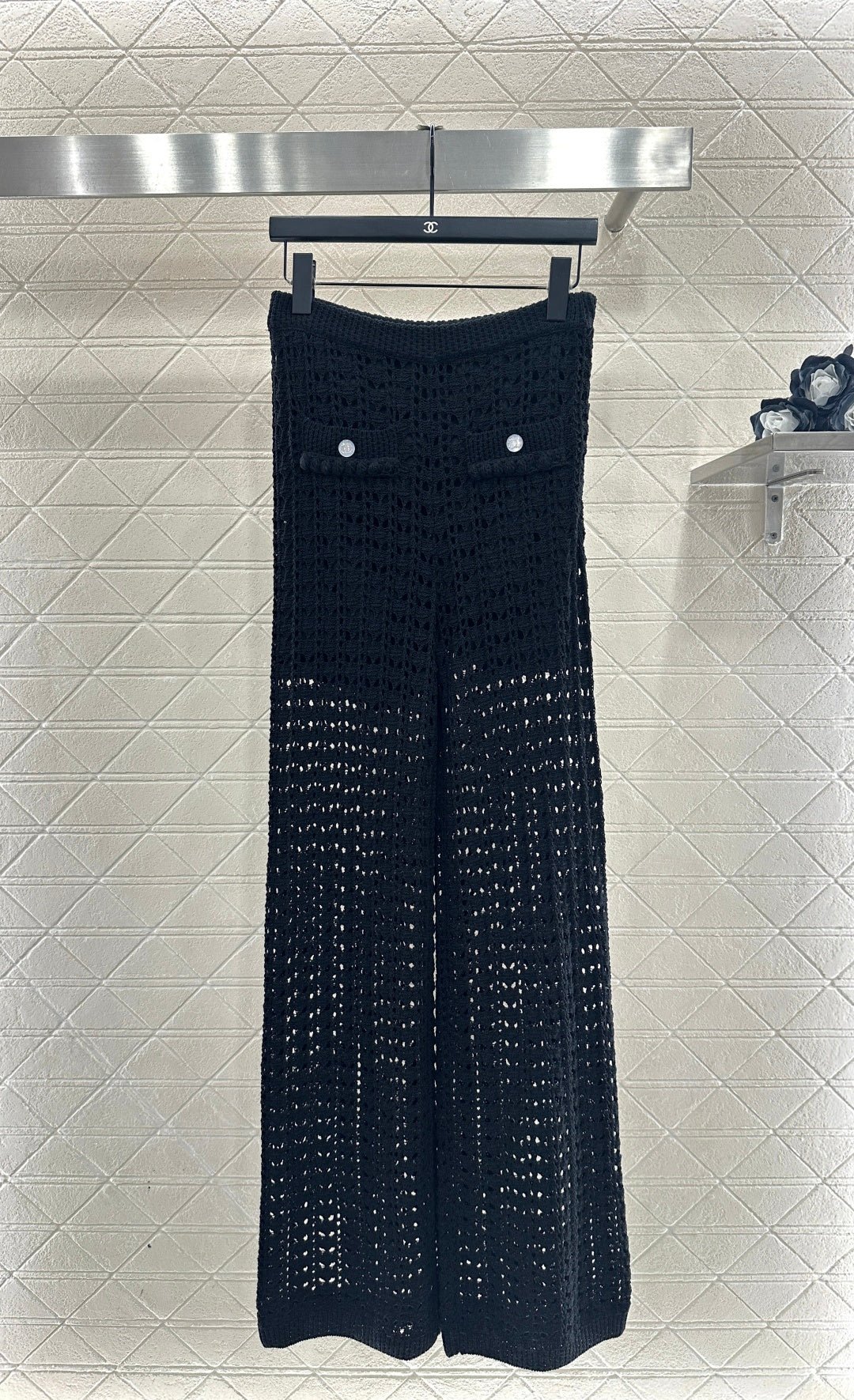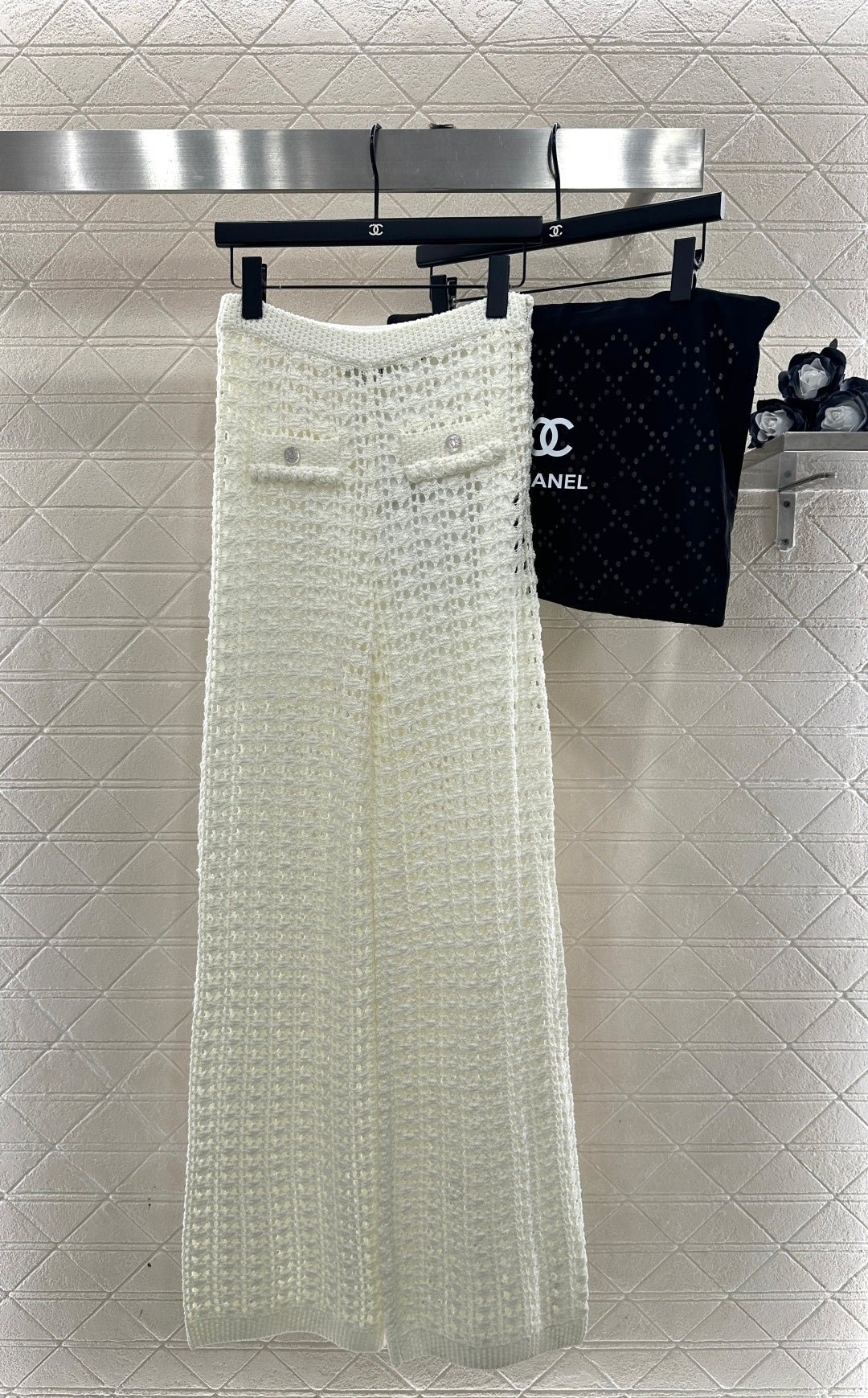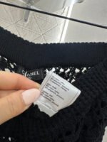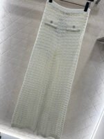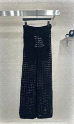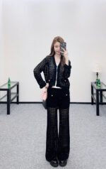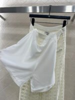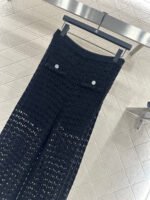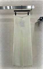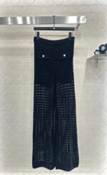 Crafted from cotton and wool yarn, these high-waisted, wide-leg, straight-leg trousers offer a comfortable and soft feel. They feature matching shorts with a subtle anti-exposure lining, and the exposed calves add a touch of cool and chic. The high-waisted ribbed design accentuates a slim waist, while the rhinestone double C details on the pockets add a touch of glamour, showcasing the brand’s style and giving this simple design a sexy and individualistic, luxurious and fashionable look.