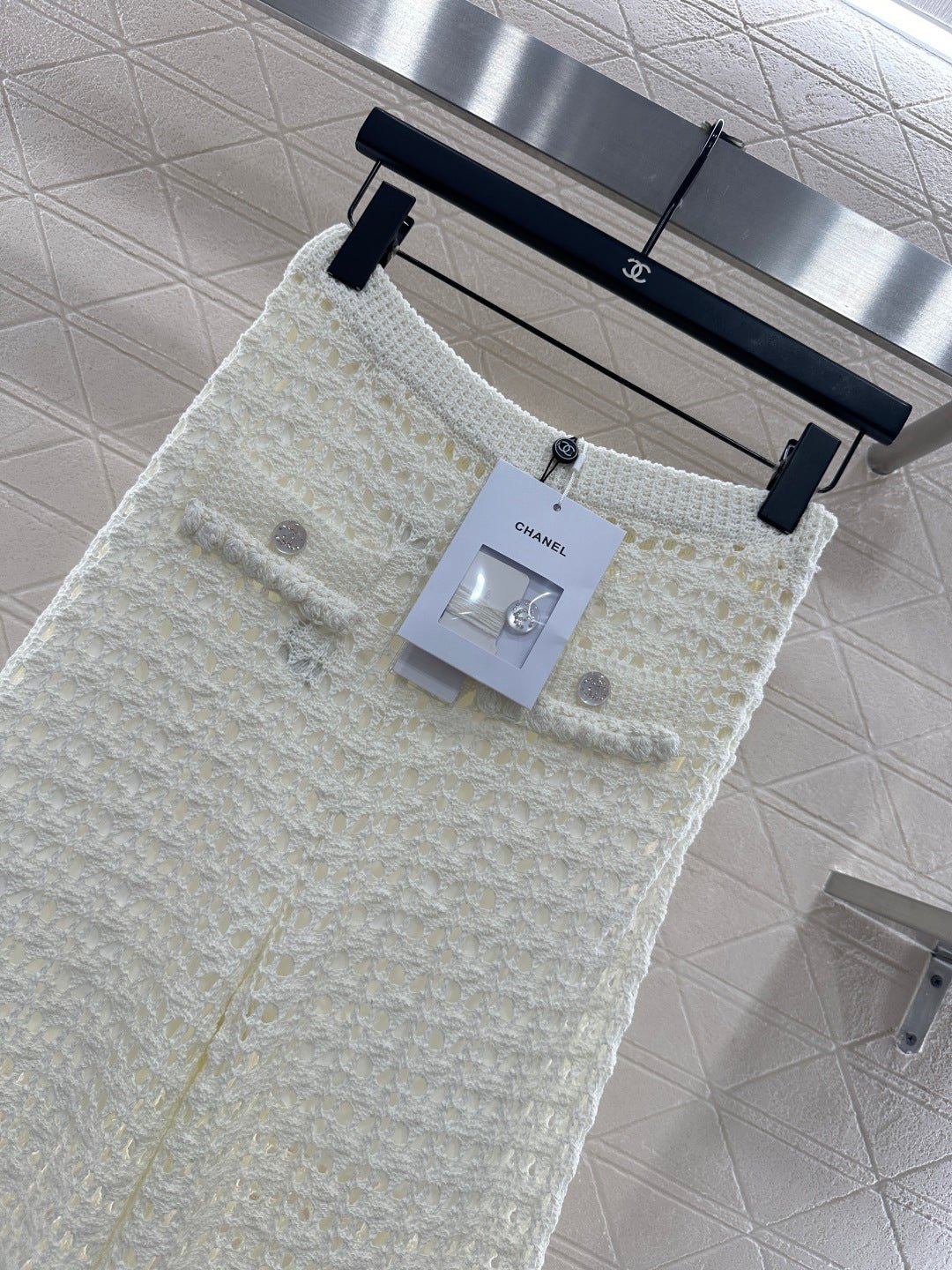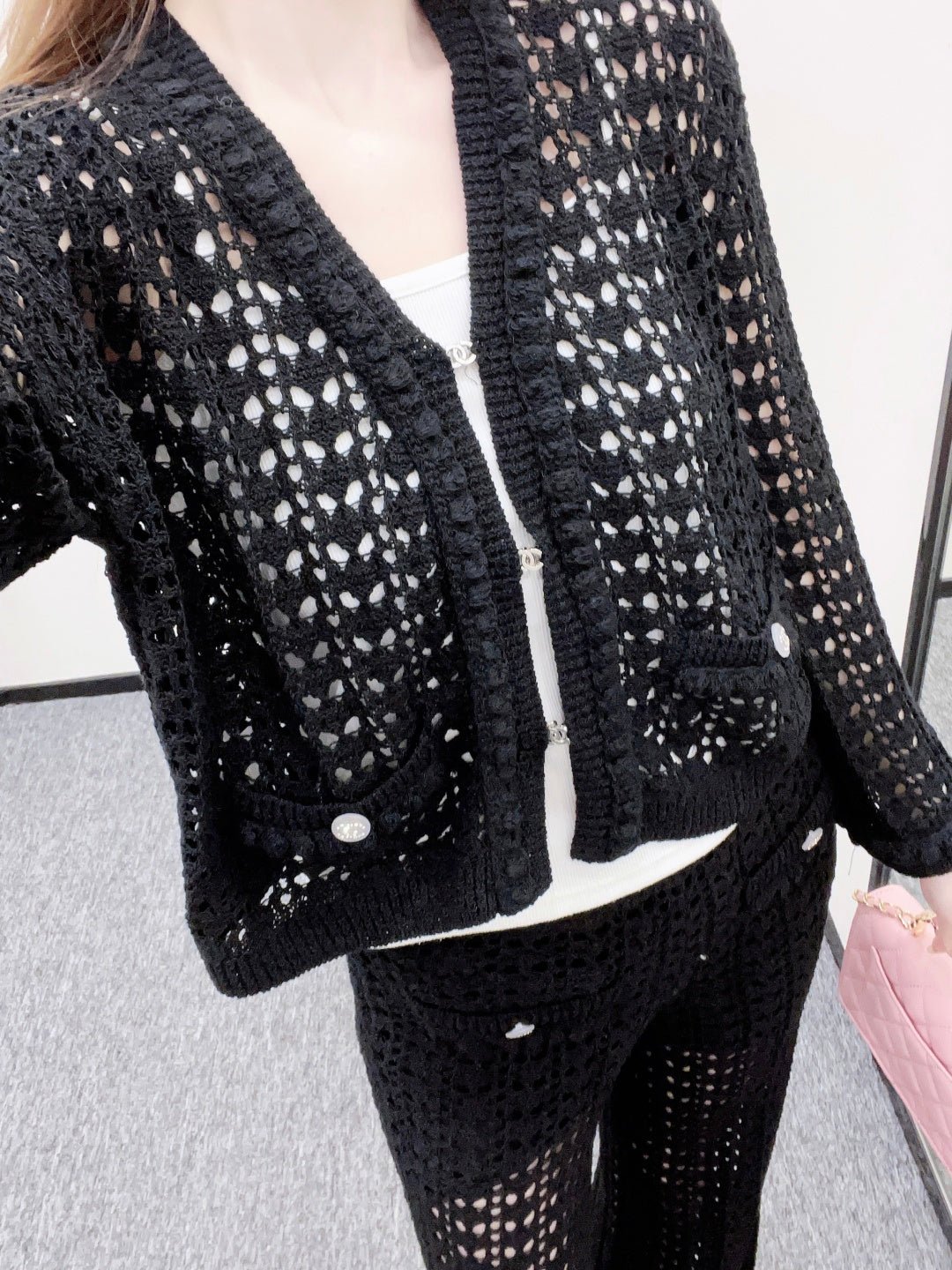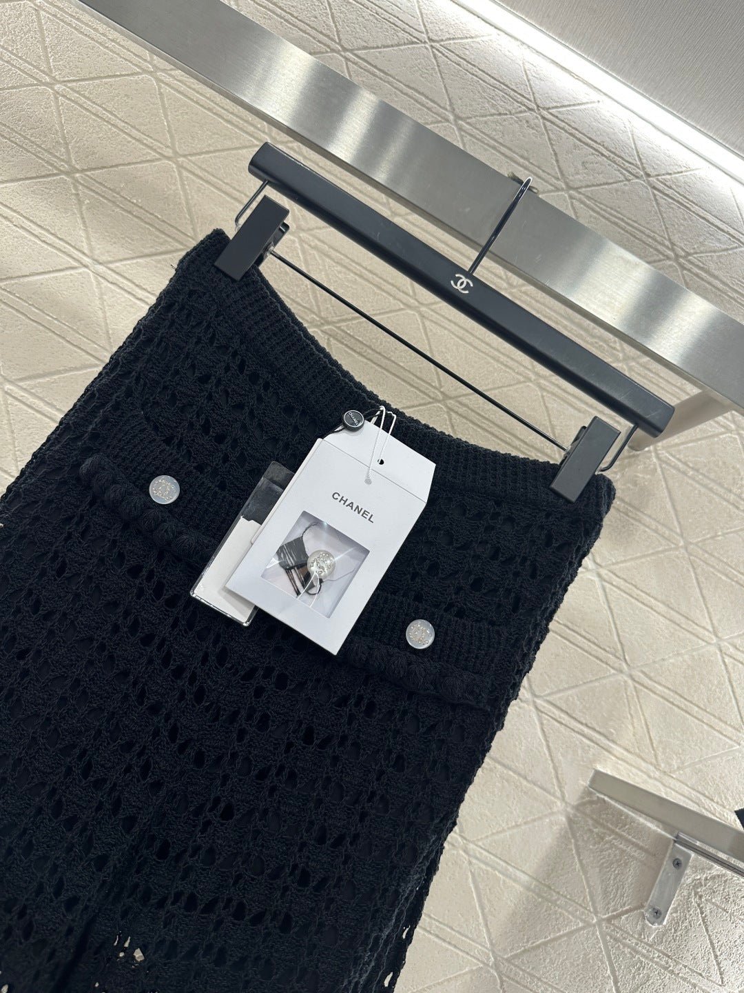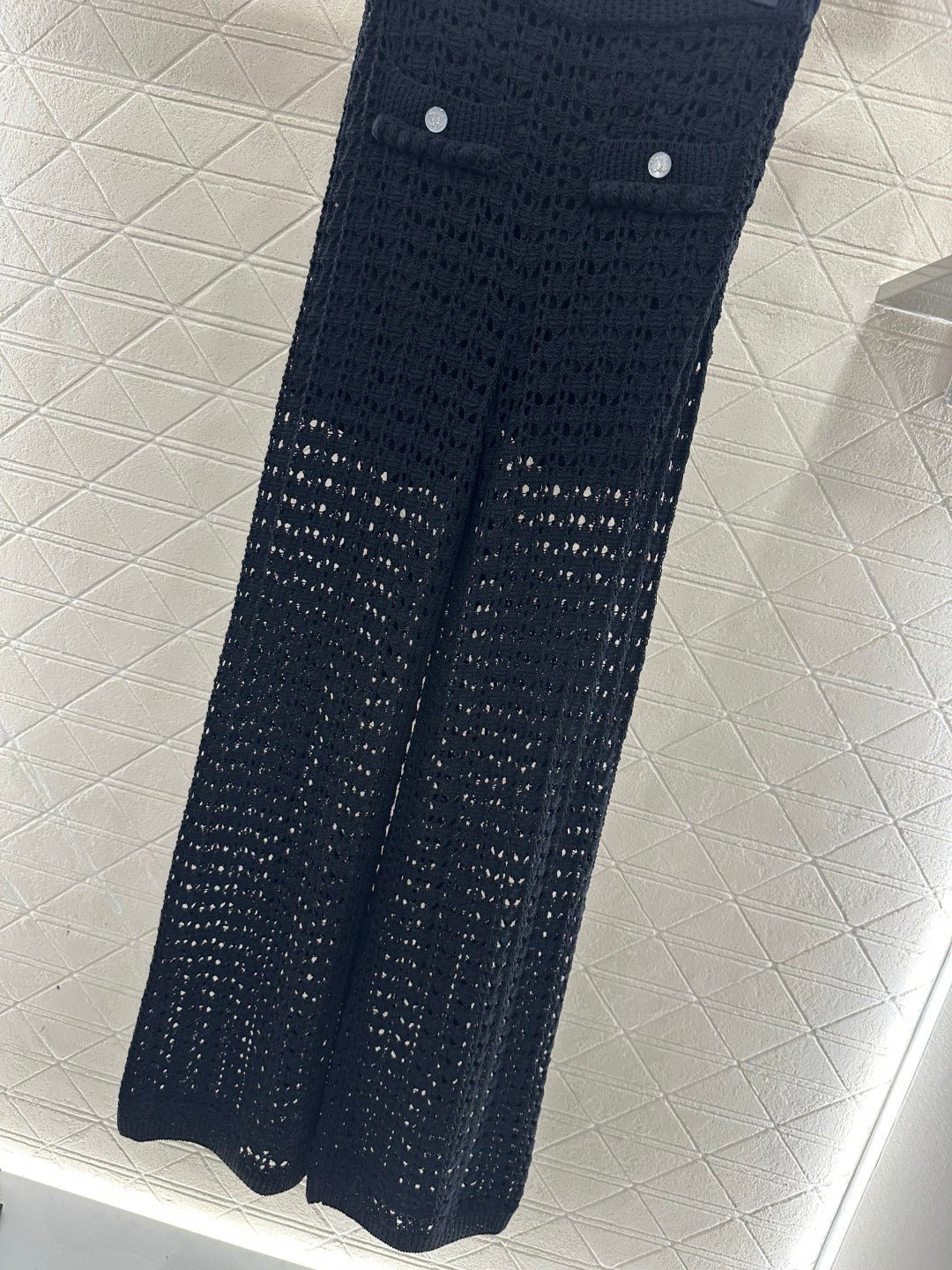 Crafted from cotton and wool yarn, these high-waisted, wide-leg, straight-leg trousers offer a comfortable and soft feel. They feature matching shorts with a subtle anti-exposure lining, and the exposed calves add a touch of cool and chic. The high-waisted ribbed design accentuates a slim waist, while the rhinestone double C details on the pockets add a touch of glamour, showcasing the brand’s style and giving this simple design a sexy and individualistic, luxurious and fashionable look.