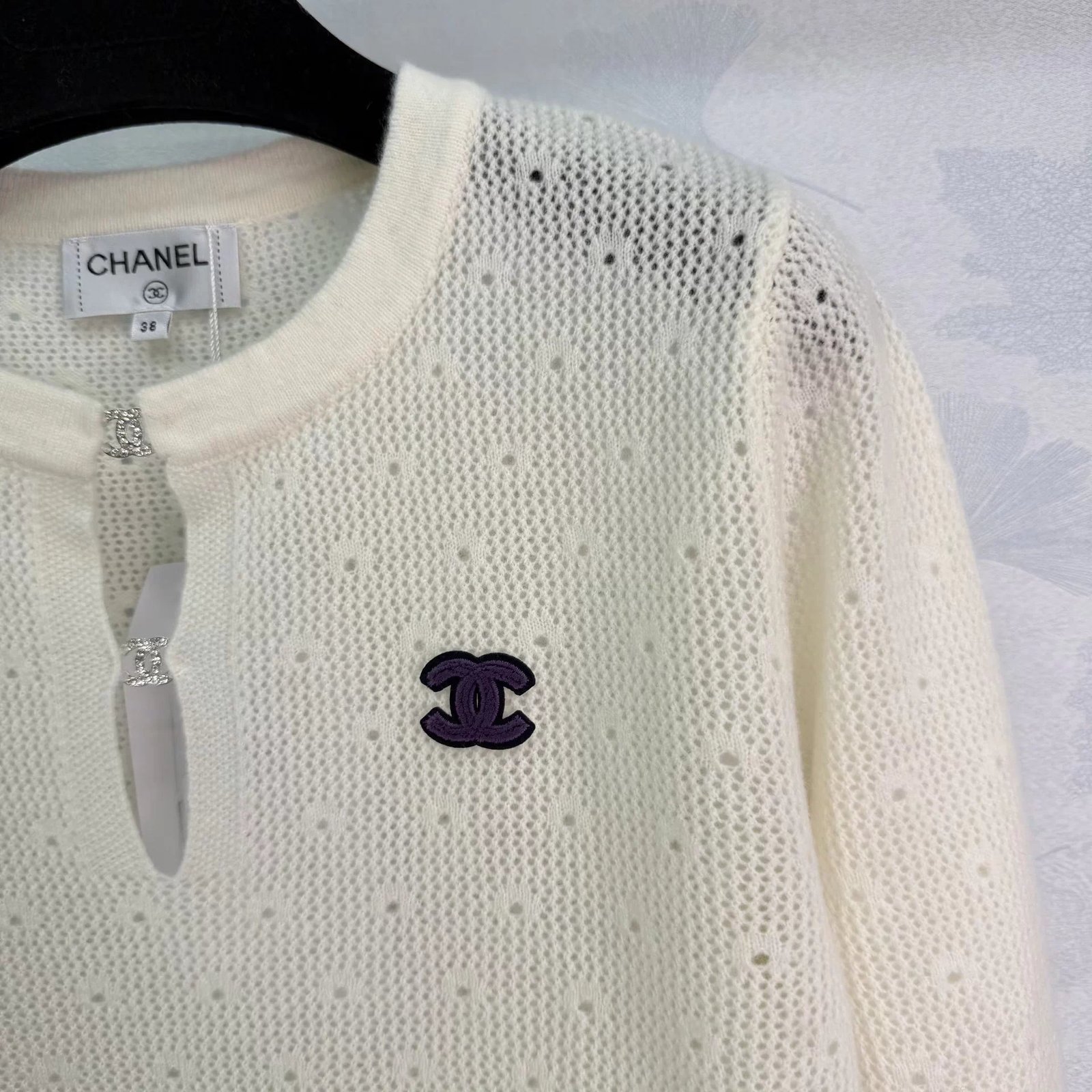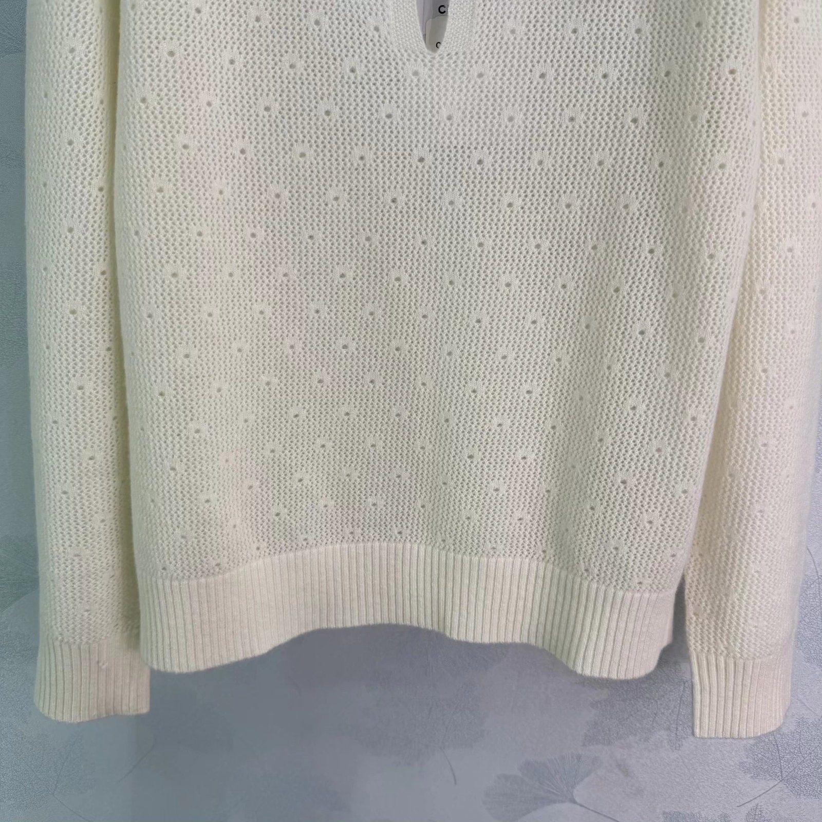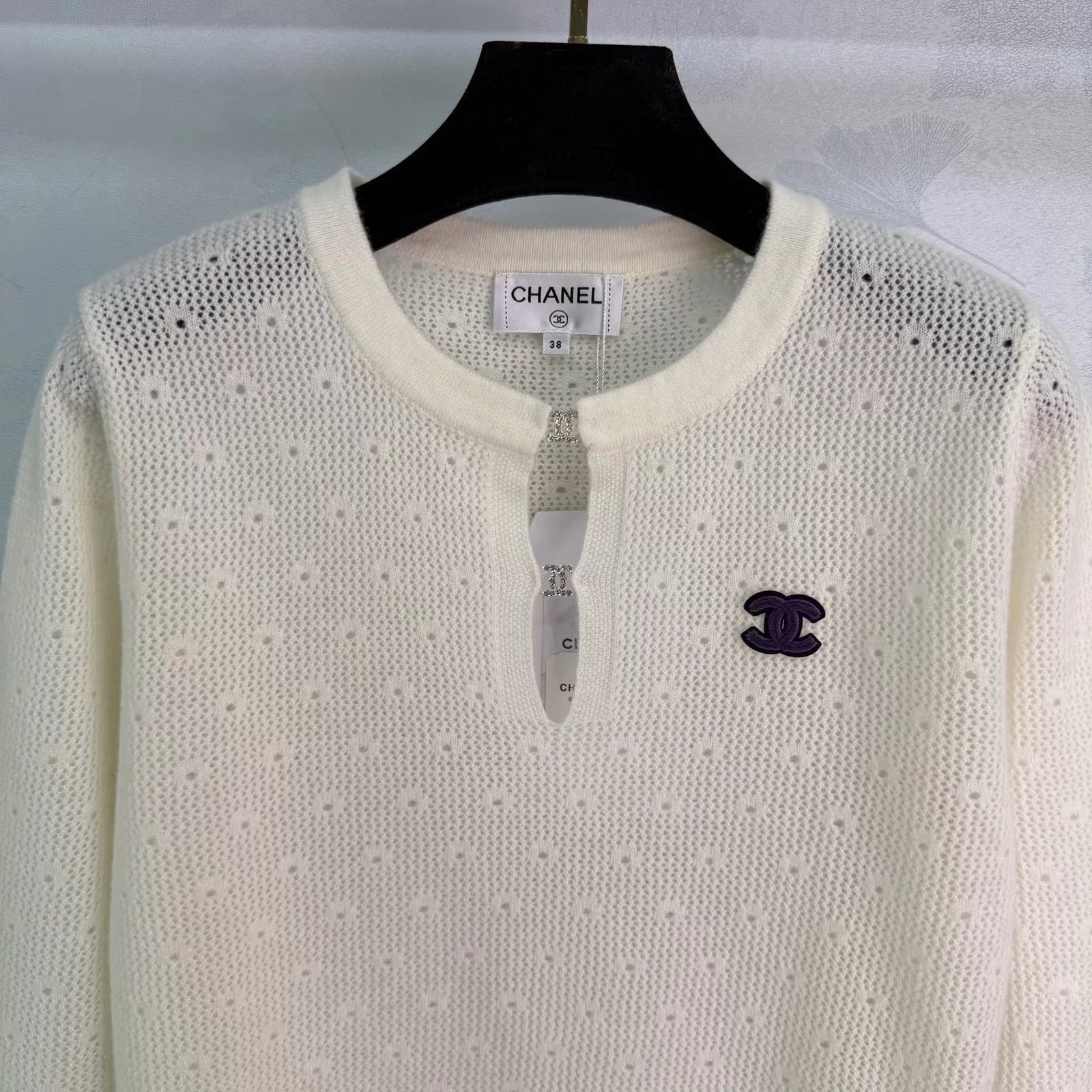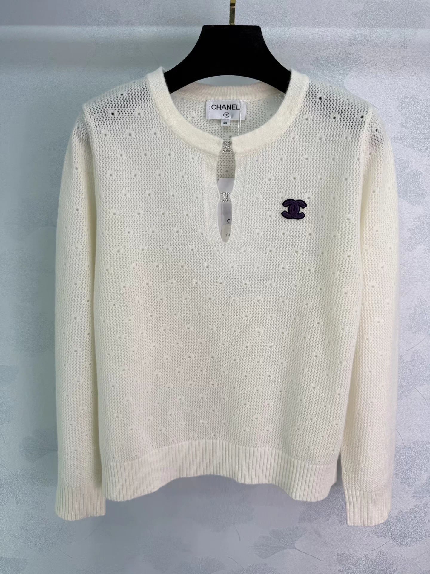 Made from 100% cotton yarn, this high-quality, comfortable long-sleeved knit sweater features a fresh, openwork texture throughout. Ribbed edges at the cuffs and hem create a more flattering, slimming fit. A rhinestone-studded double C-button closure at the front, along with a subtle double C logo on the chest, adds a touch of sophistication. The slightly sheer fabric creates a relaxed and stylish look, exuding understated luxury. Perfect for wearing alone or layering, this is a top choice for all-season fashion.