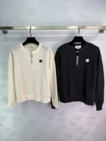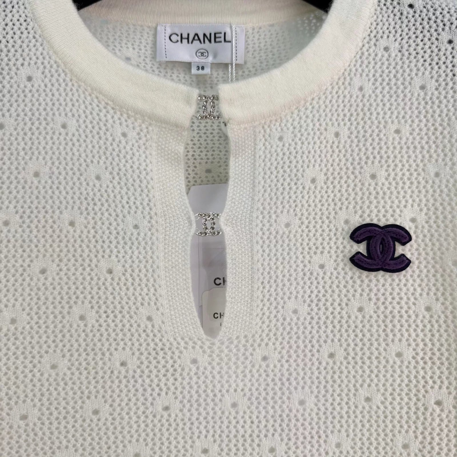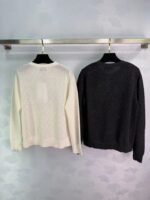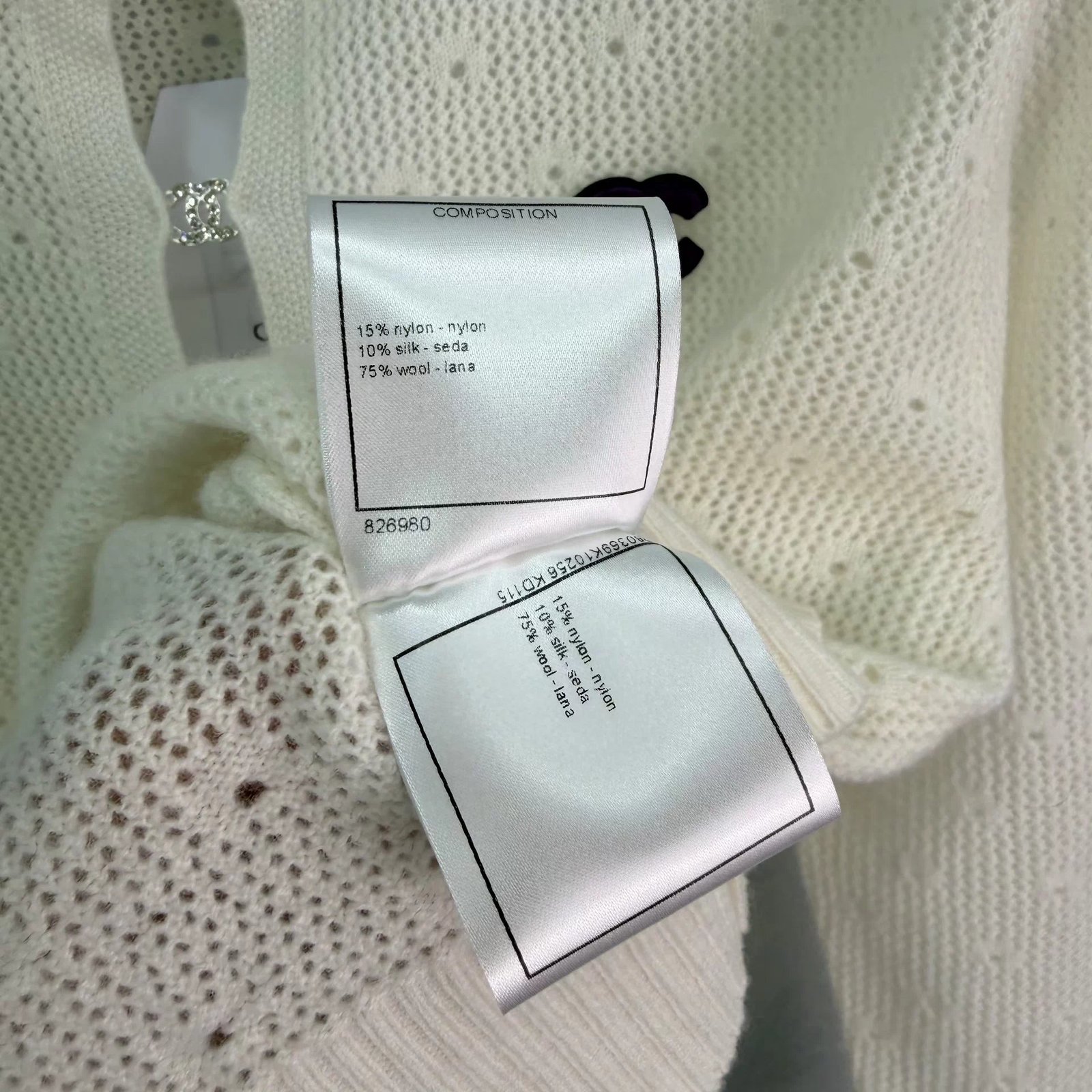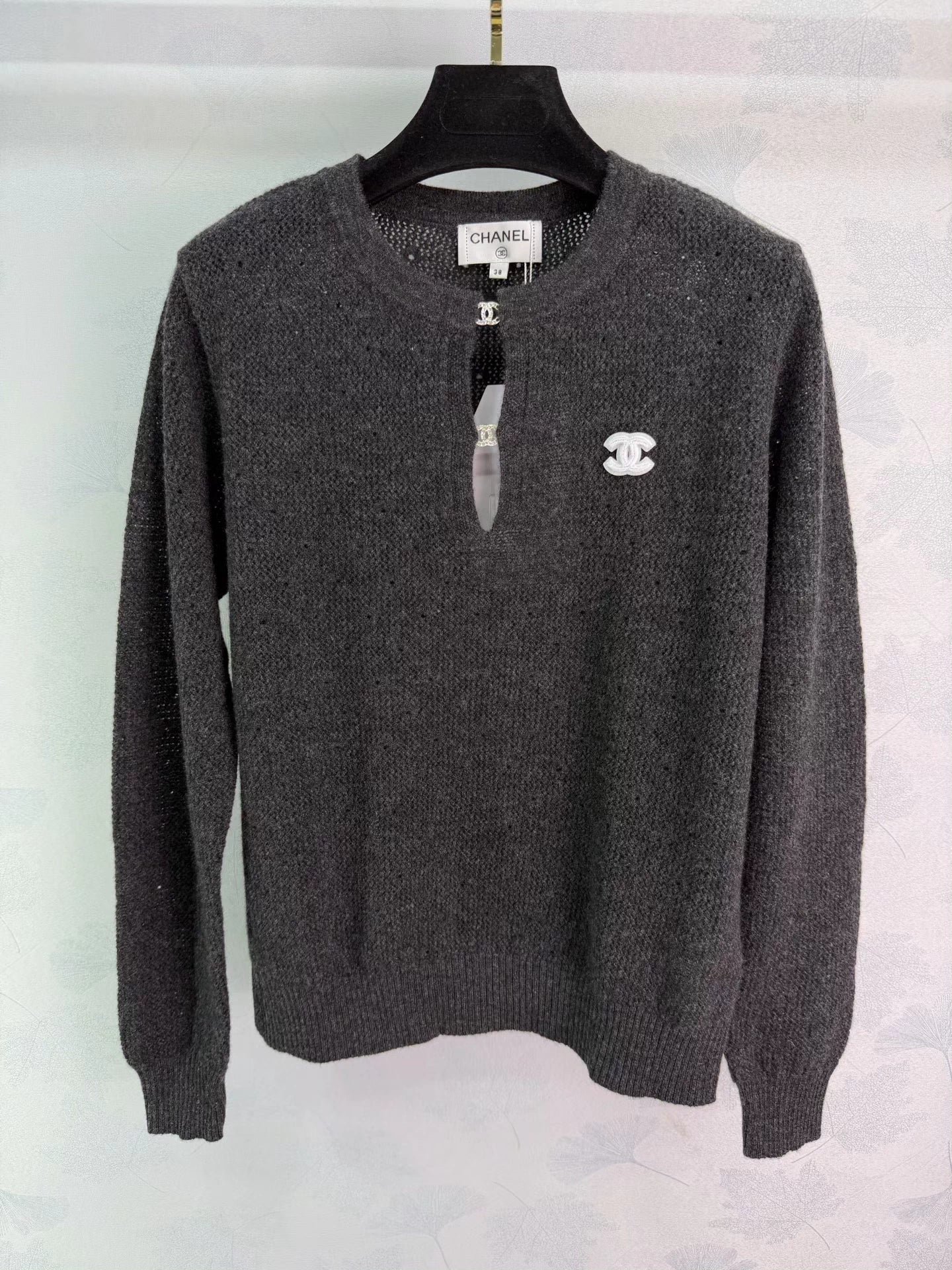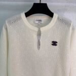 Made from 100% cotton yarn, this high-quality, comfortable long-sleeved knit sweater features a fresh, openwork texture throughout. Ribbed edges at the cuffs and hem create a more flattering, slimming fit. A rhinestone-studded double C-button closure at the front, along with a subtle double C logo on the chest, adds a touch of sophistication. The slightly sheer fabric creates a relaxed and stylish look, exuding understated luxury. Perfect for wearing alone or layering, this is a top choice for all-season fashion.
