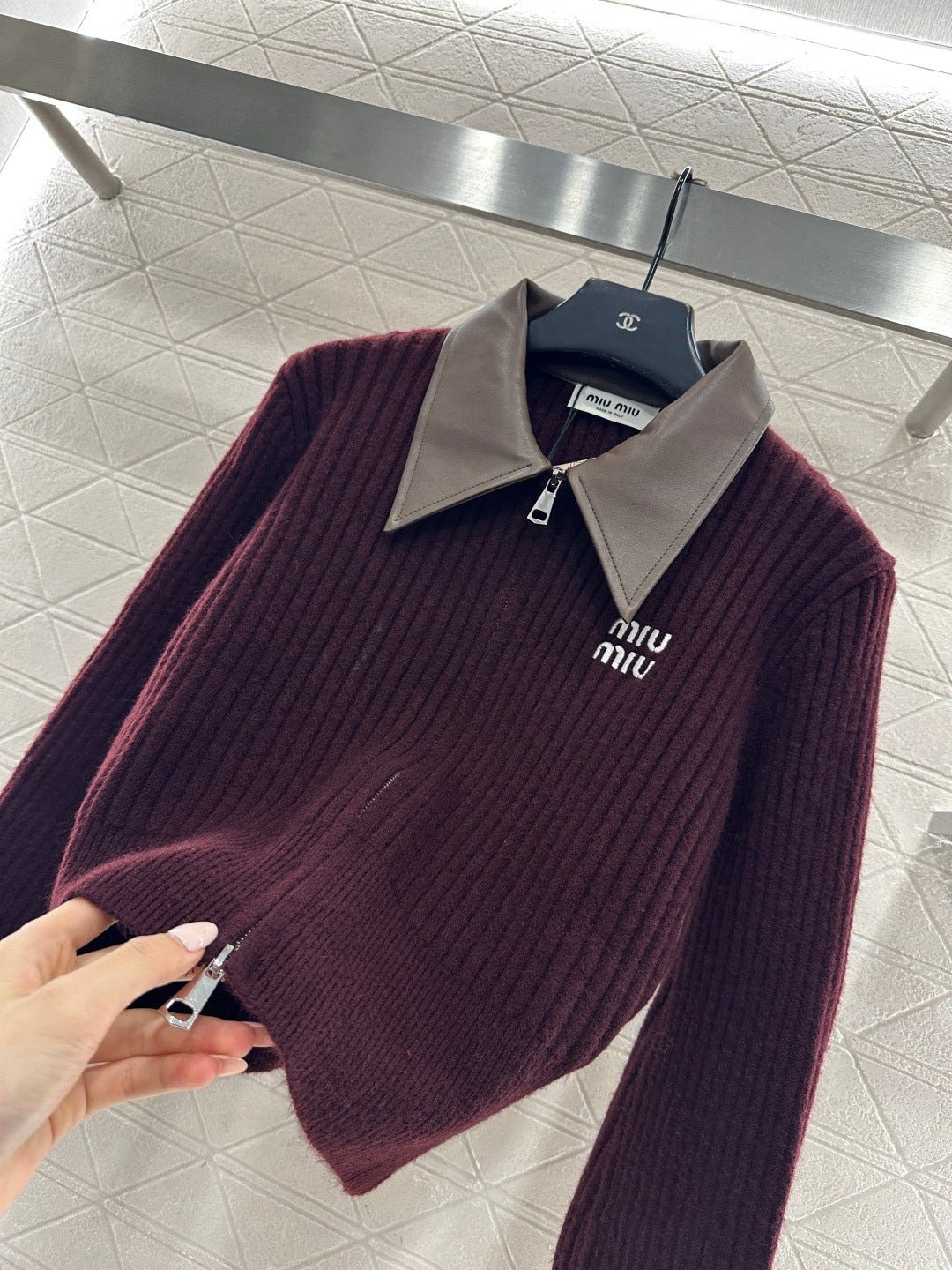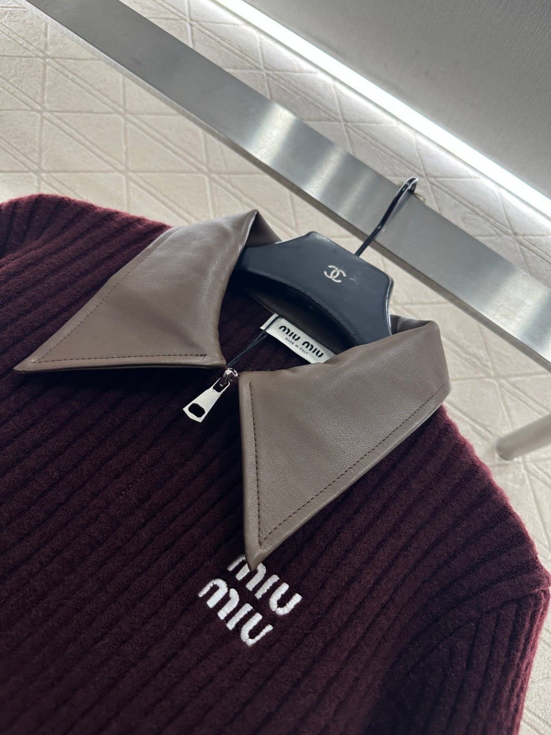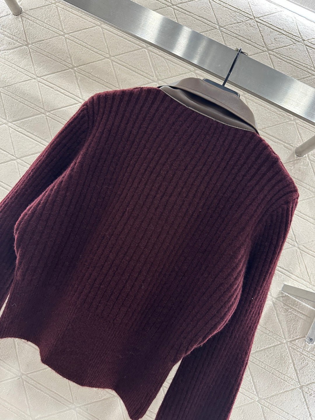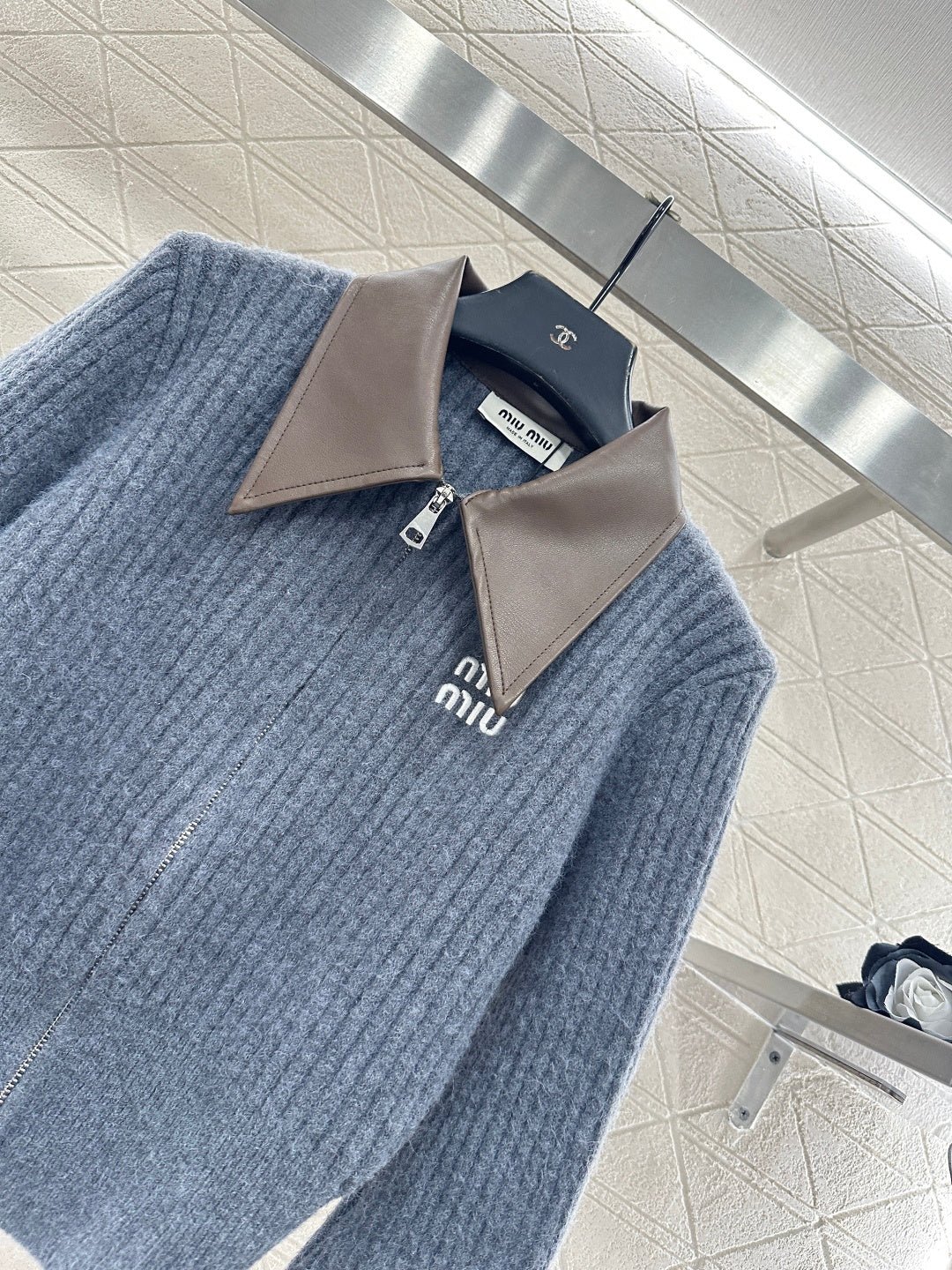 Crafted from silk and wool yarn, this comfortable and luxurious short knit cardigan features a collar with glossy leather accents. The vertical ribbed knit texture creates a striking contrast in color and fabric, resulting in a rich and visually slimming effect. A letter logo adorns the chest. Pair it with trousers or a skirt for a youthful and stylish look.
