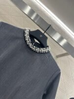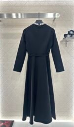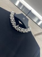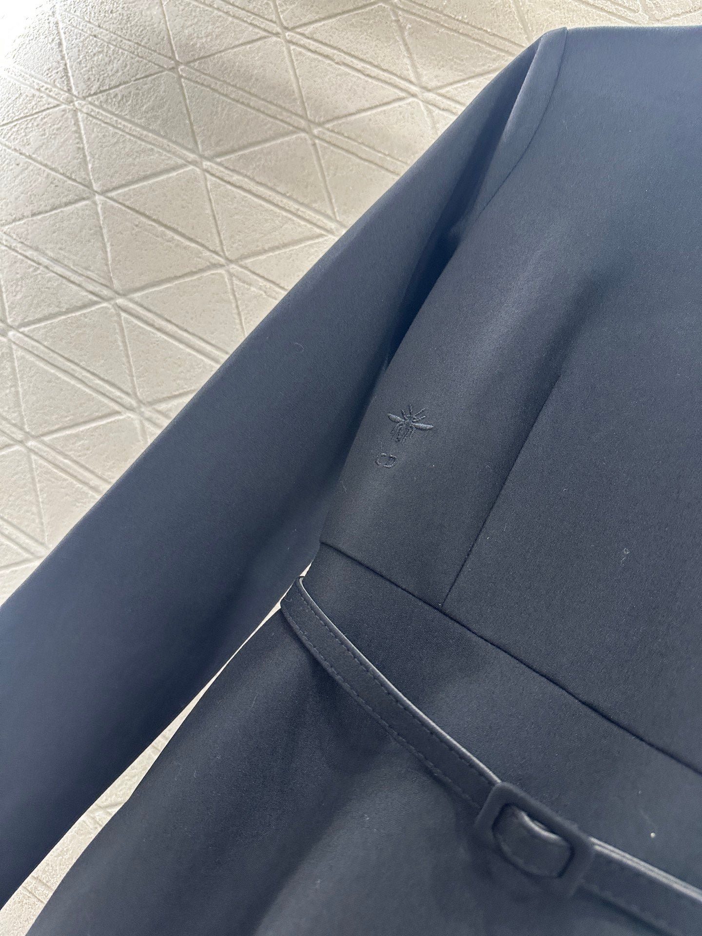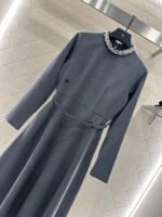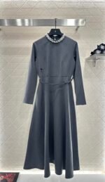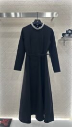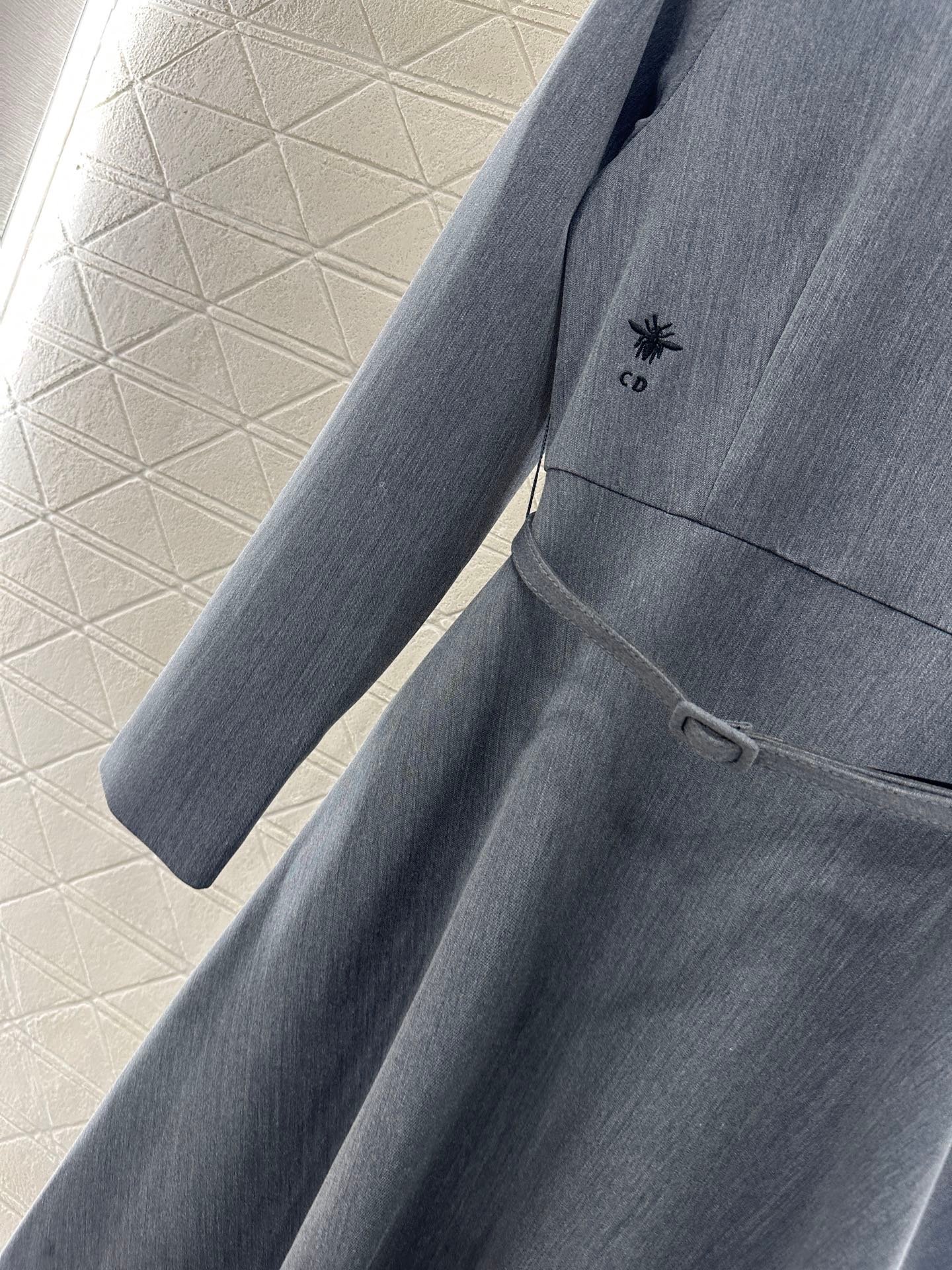 Cotton wool material, delicate texture, stylish drape, long sleeved round neck dress cut, using cutting and details to enhance delicacy, surrounded by pearls scattered around the collar, the design of the shoulder sleeves is atmospheric and elegant, and the belt of this fabric is matched with three-dimensional cutting and pleating to outline the body shape, highlighting the beauty of women’s curves. Combined with the embroidered bee logo, it low-key highlights the luxurious tone, enhances the charm of softness, and the umbrella shaped large skirt easily outlines the graceful body shape, showing the overall intellectual temperament and inclusive body shape. The upper body is simple and high-end.