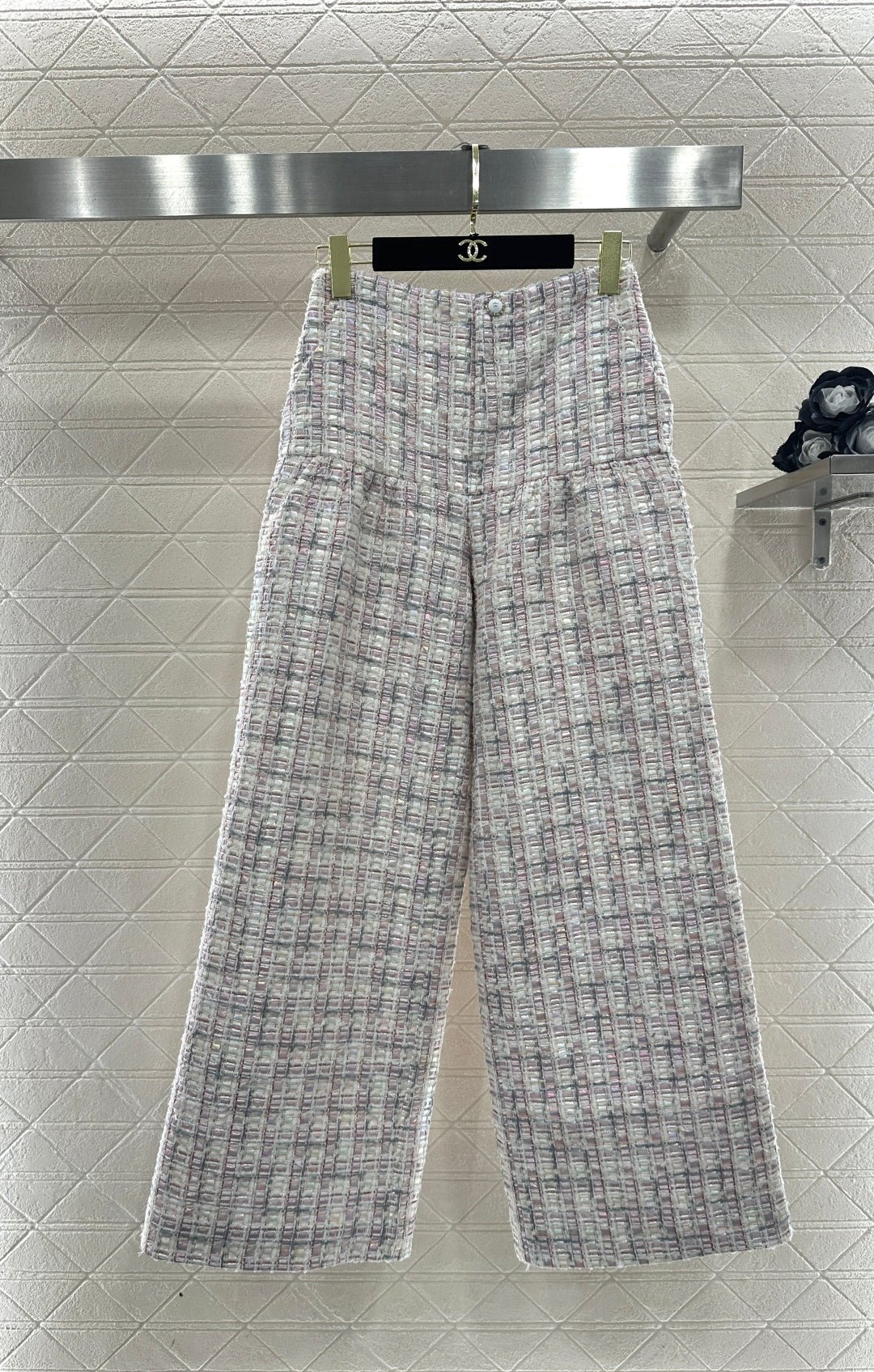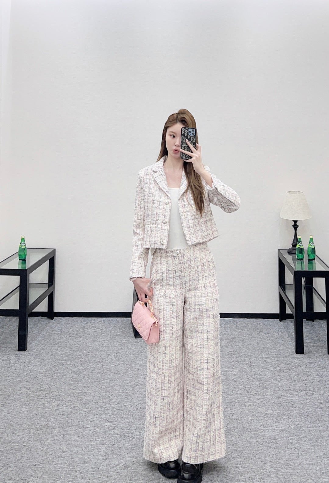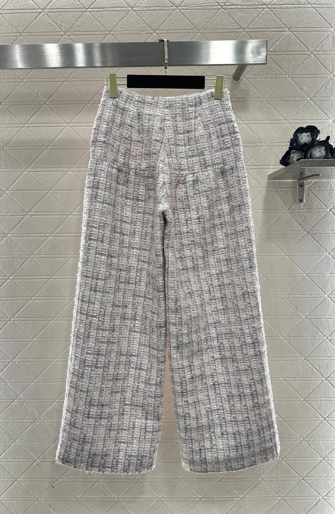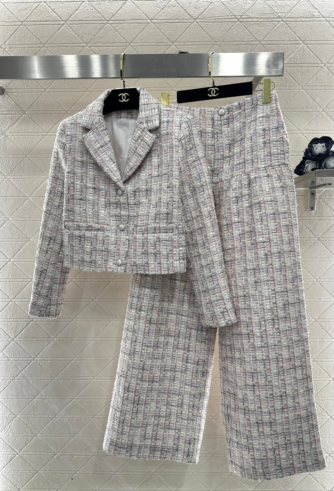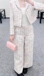 Made from imported coarse wool fabric, this high-quality, premium-featured short-sleeved dress and trouser set features a lapel, structured shoulders, and a soft pink and purple tweed that exudes romance. The short jacket is tailored to flatter the figure, while the wide-leg trousers offer a relaxed yet slimming silhouette. Wearing the set creates an elegant yet casual sophisticated look, or you can style it separately with knitwear or jeans for different looks, effortlessly achieving a sweet and edgy French chic style suitable for various occasions.