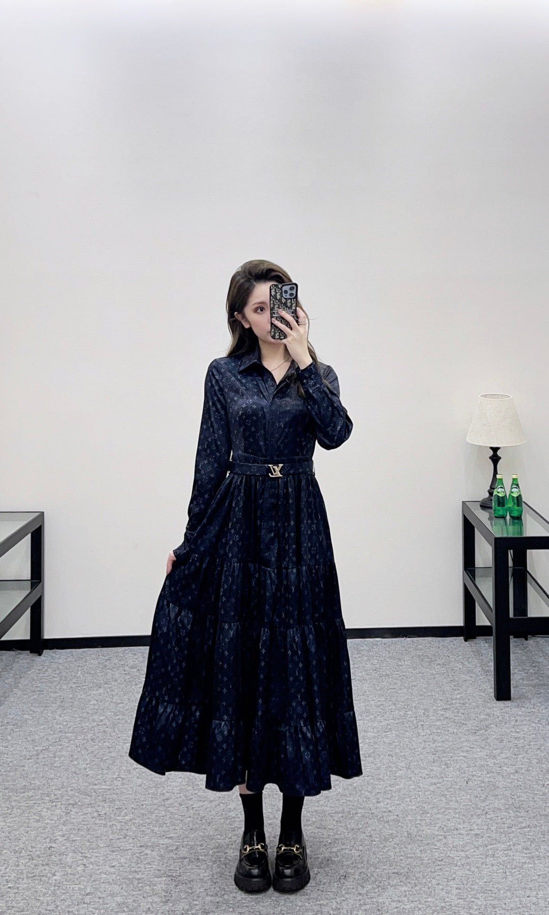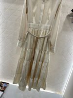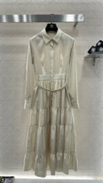 Made of a thick twill fabric with a lustrous sheen, this smooth and comfortable long dress features a collared, belted waist and a classic French elegance. Available in off-white and navy blue, the satin fabric has a soft, sheen. The collared design is clean and sophisticated, while the belted waist accentuates a slender figure. The layered skirt is both flowy and youthful, and the long silhouette is flattering and flattering. Perfect for everyday wear, commuting, or dates, this dress exudes a refined and sophisticated style.