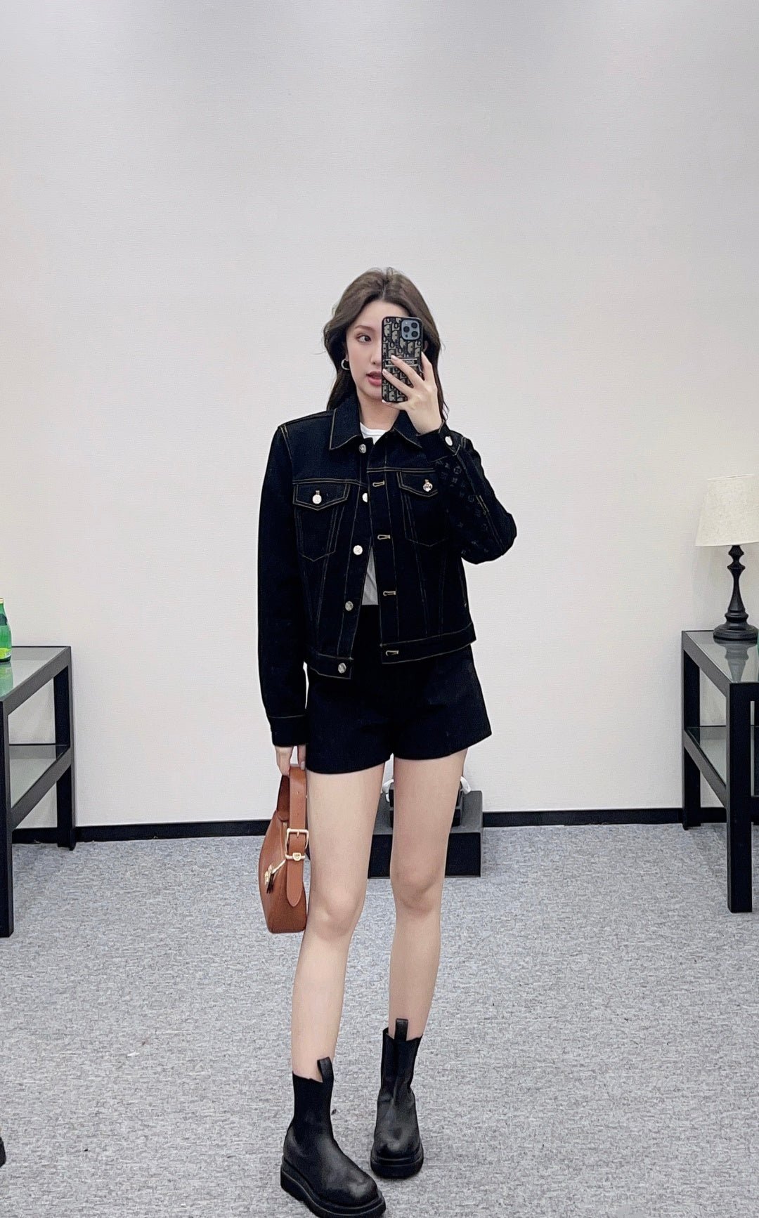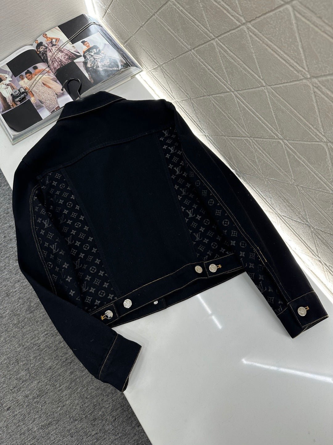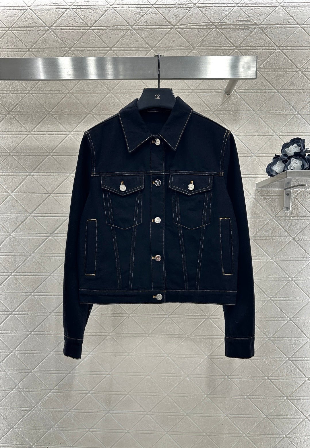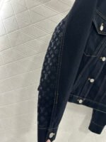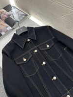 Made from cotton denim with multiple washes, this jacket boasts a crisp, structured texture. The collared, structured shoulder cut and flap pockets complement the classic silhouette, creating a sophisticated and timeless look. The sleeves feature a four-leaf clover logo, highlighting the brand’s style. The loose, straight cut of the jacket creates a chic, androgynous style.