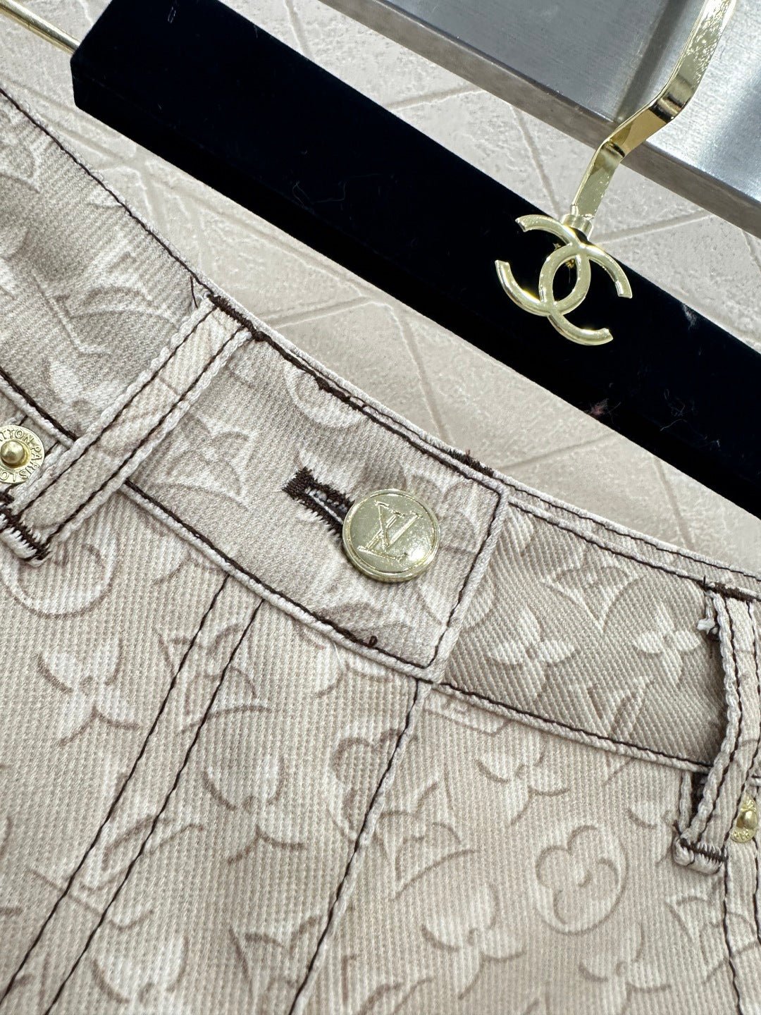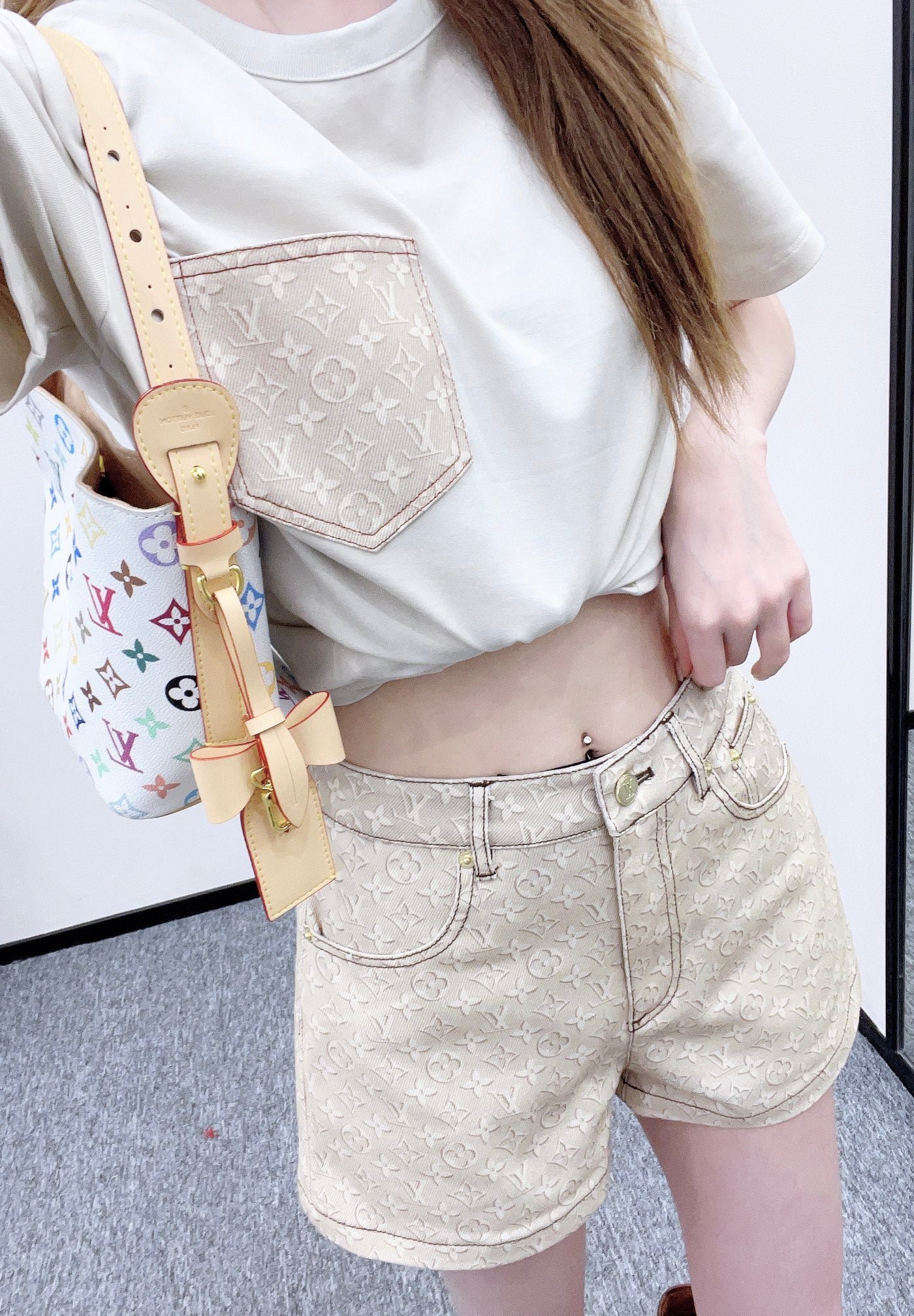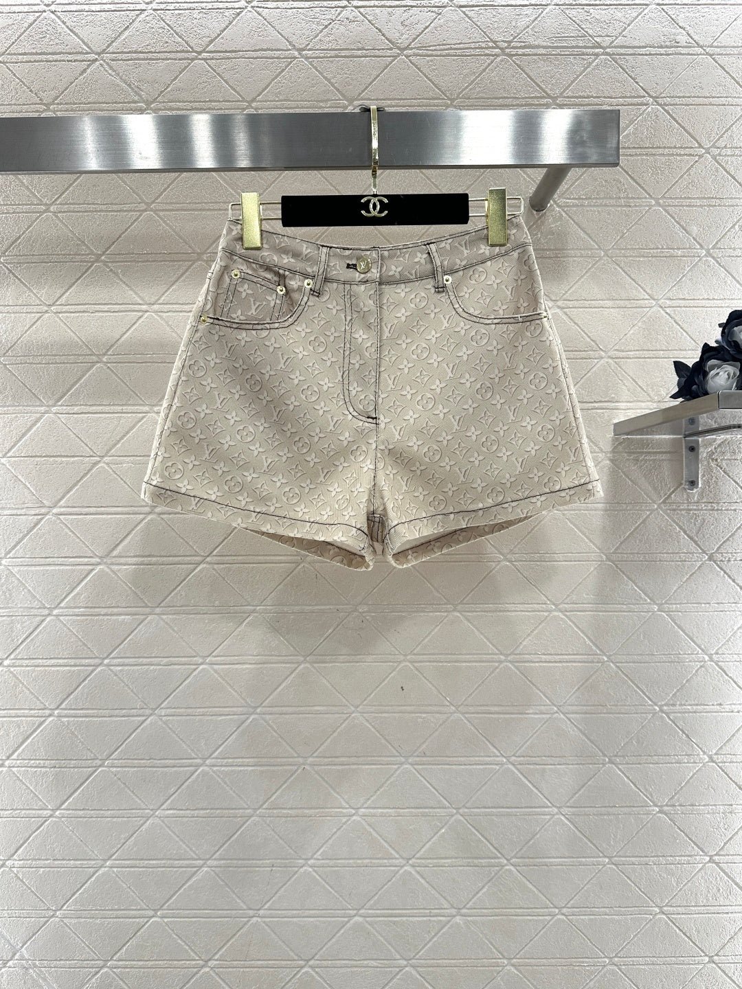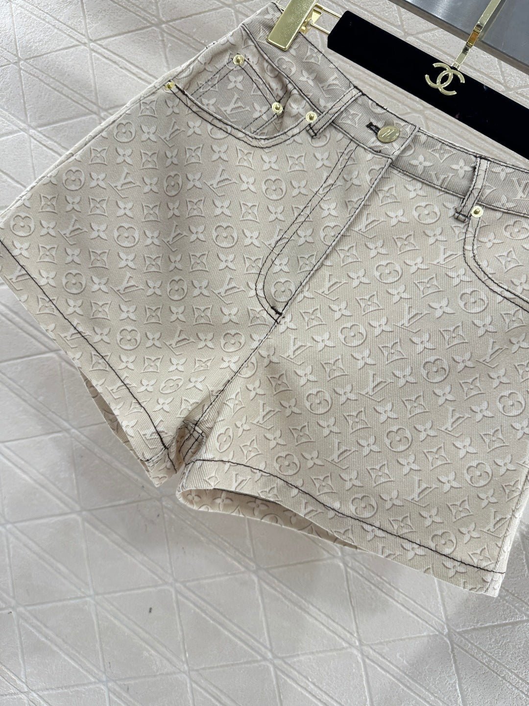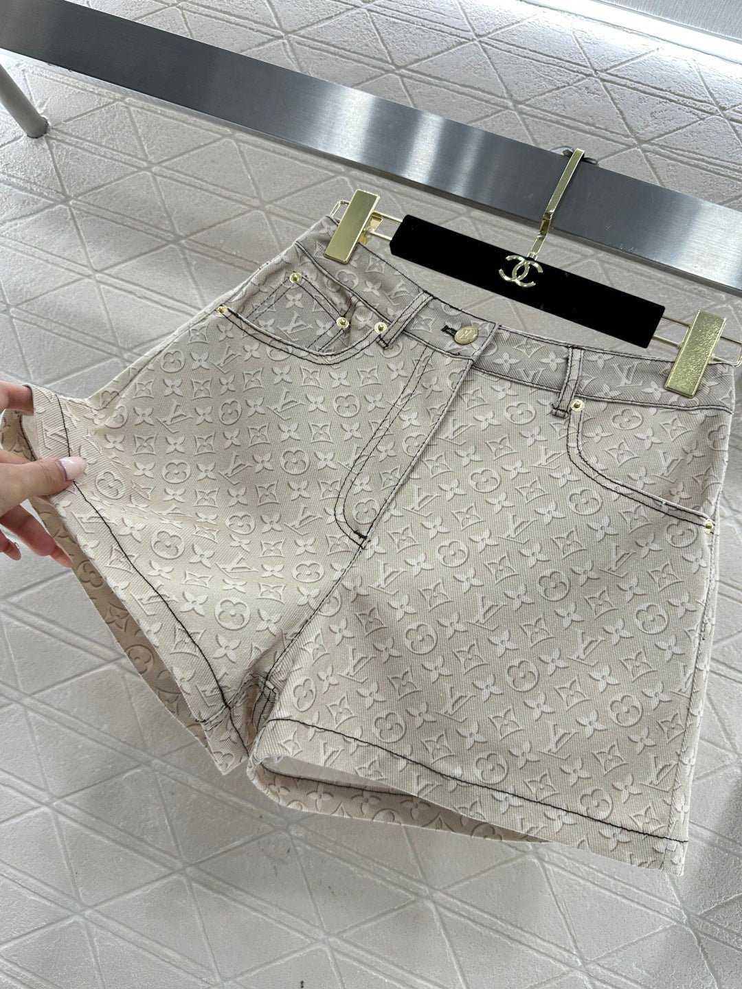 Made of twill cotton denim, this denim shorts undergo multiple washes to create a crisp texture. The high-waisted design and subtle light apricot monogram pattern subtly highlight the brand’s quality. The fabric is both structured and soft, and the clean cut of the high-waisted shorts easily elongates the legs. Pair it with a jacket or T-shirt for a sweet and cool French style, or with a skirt for a different look. It’s the perfect choice for creating an eye-catching street style.