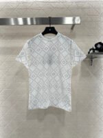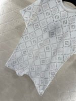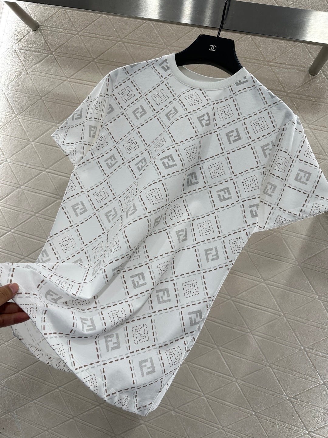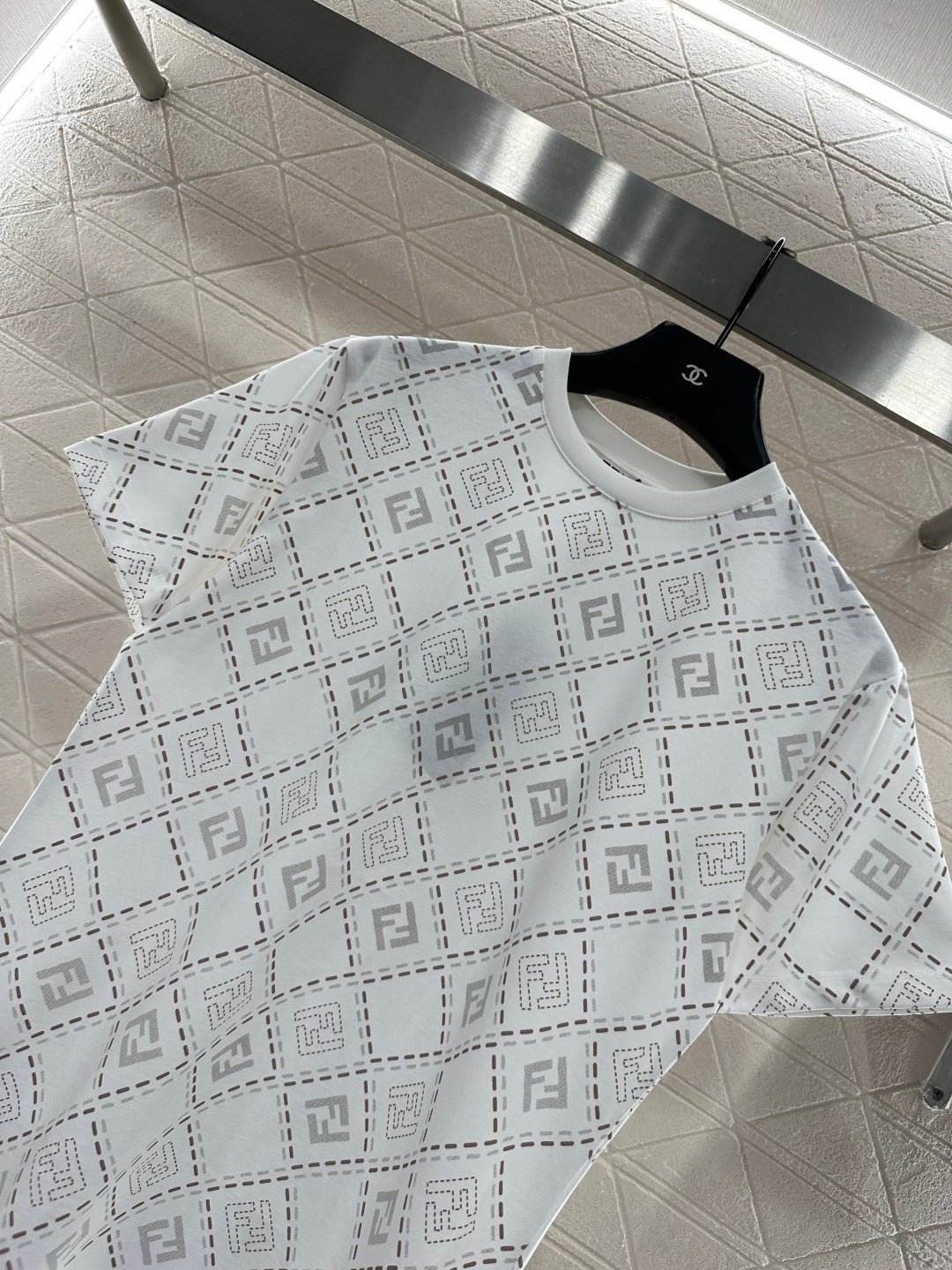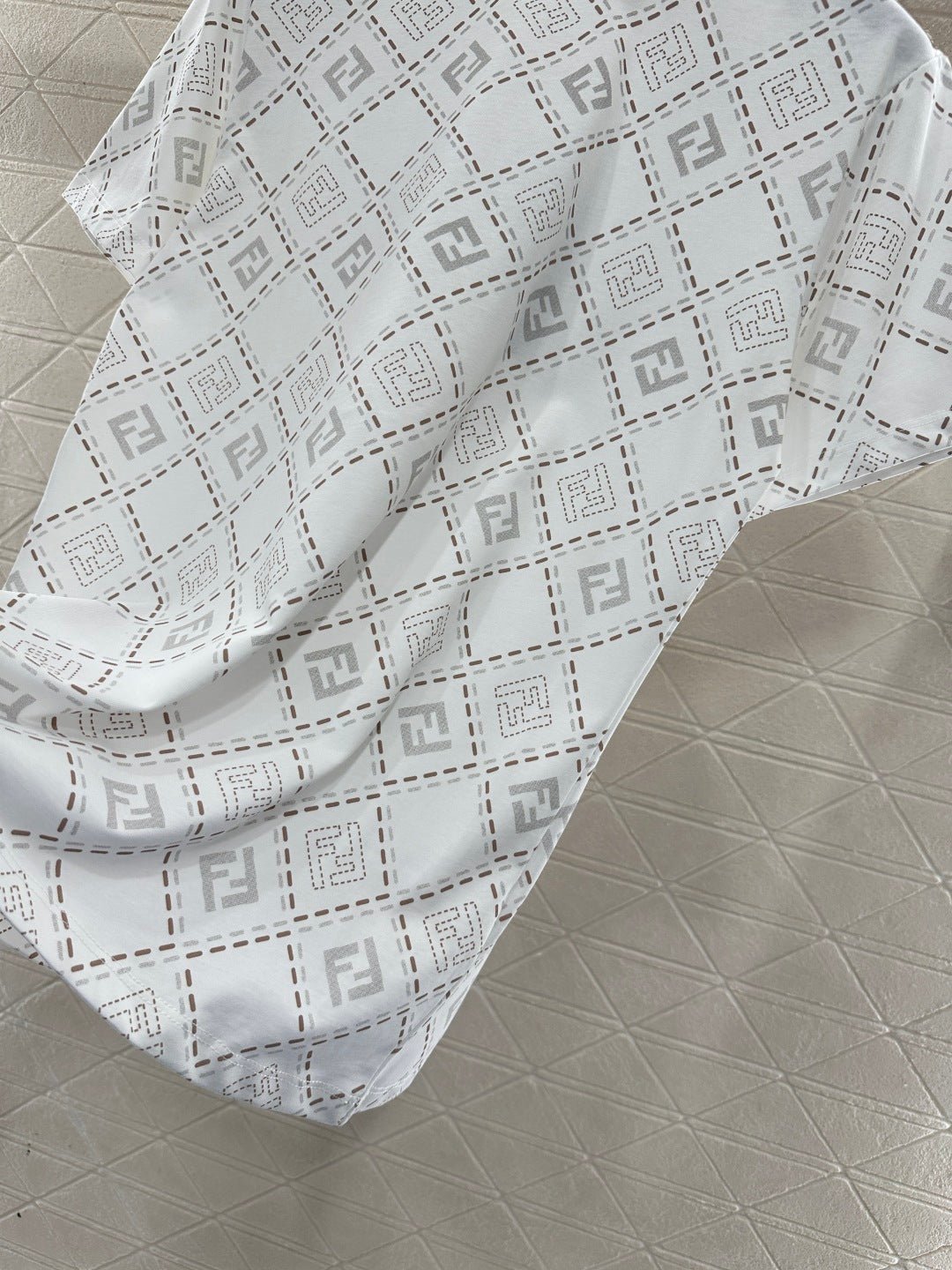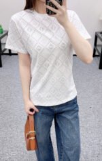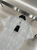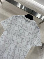 The twill cotton material is breathable and comfortable, with a rich texture. The regular short sleeved T-shirt is cut to highlight the brand’s style. It is made of heavyweight pure cotton with slight elasticity, presenting a slimming visual effect. The collar is wrapped with threads, and the body is covered with dotted diamond grid texture ➕ The double F pattern with a combination of virtual and real elements is designed in a novel and fashionable way, making it stand out both when worn alone and on the inside