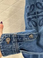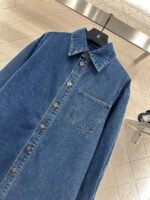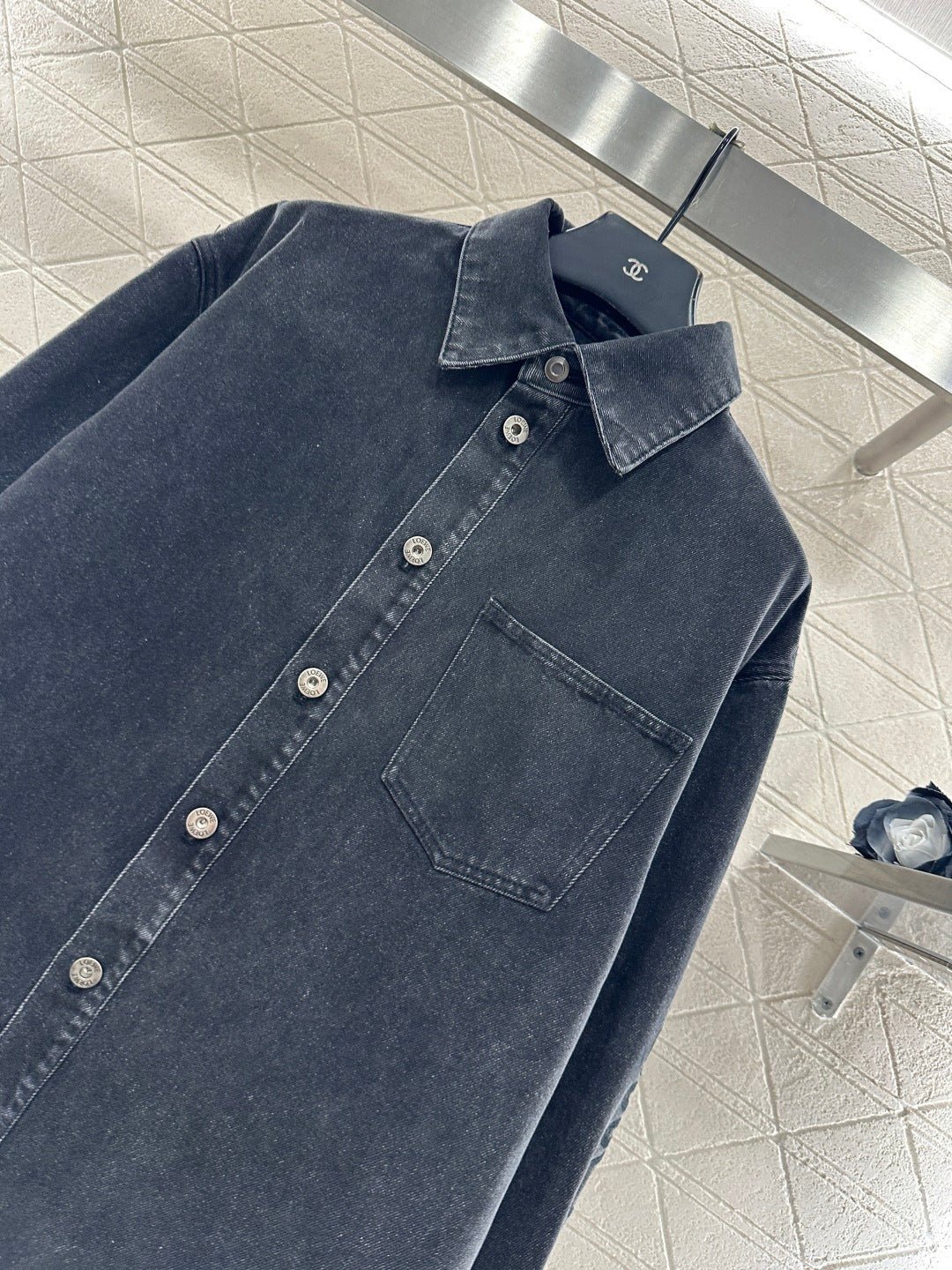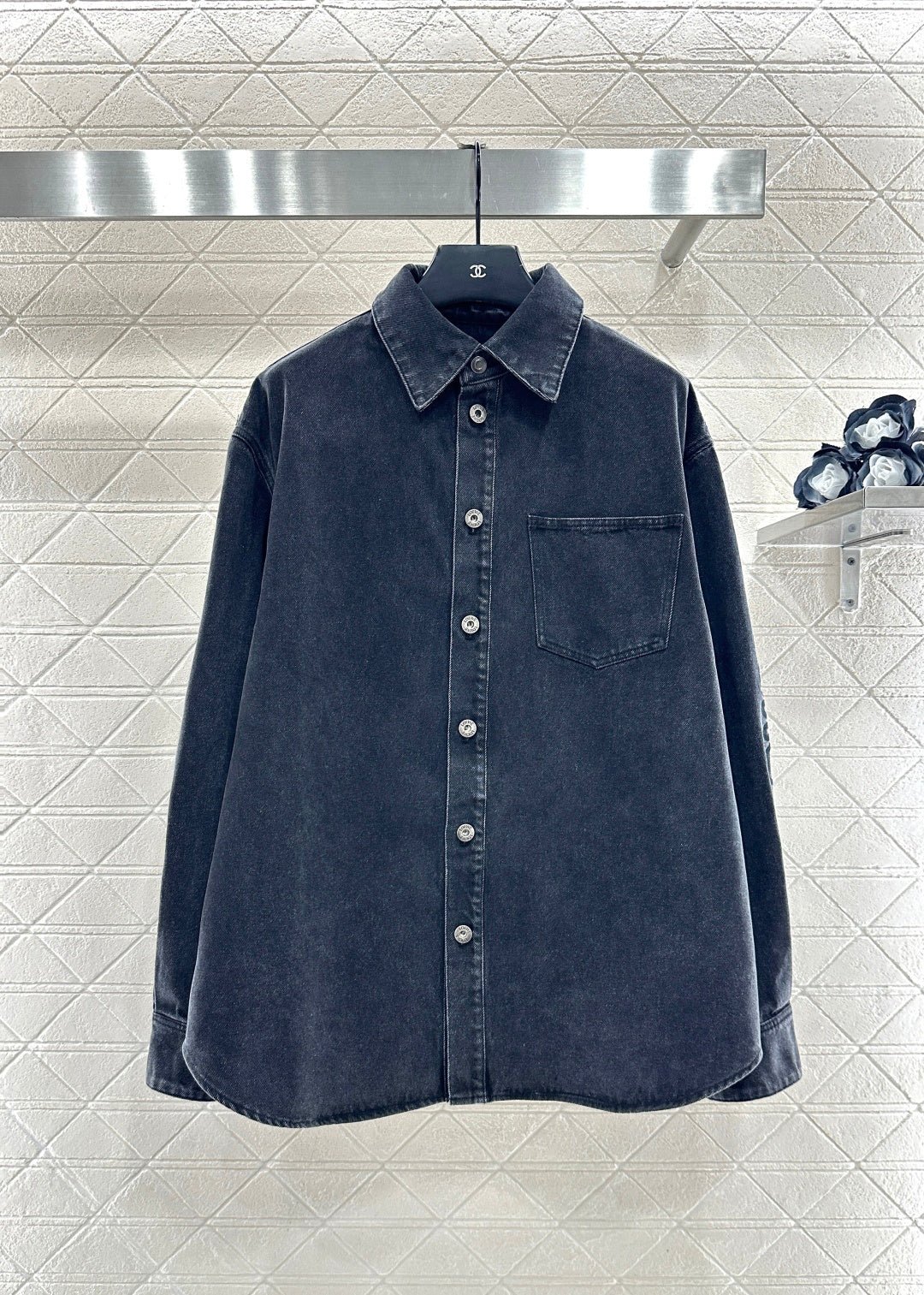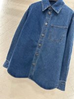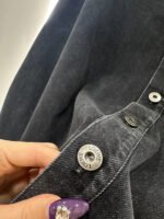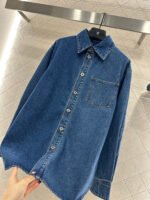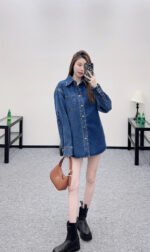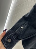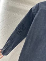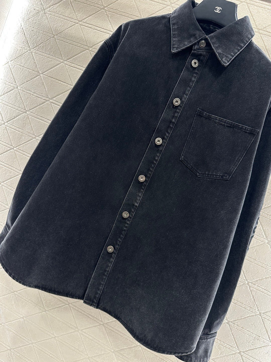 Made from twill cotton denim, this shirt is comfortable, soft, breathable, and easy to wear. The washed, distressed charcoal black and blue color scheme creates a vintage look. The oversized denim shirt silhouette features a single pocket and dropped shoulders for a relaxed fit. A subtle logo on the outer elbow subtly highlights the brand’s style. Simple yet sophisticated, it presents a casual and free-spirited style, exuding effortless chic and a relaxed vibe.